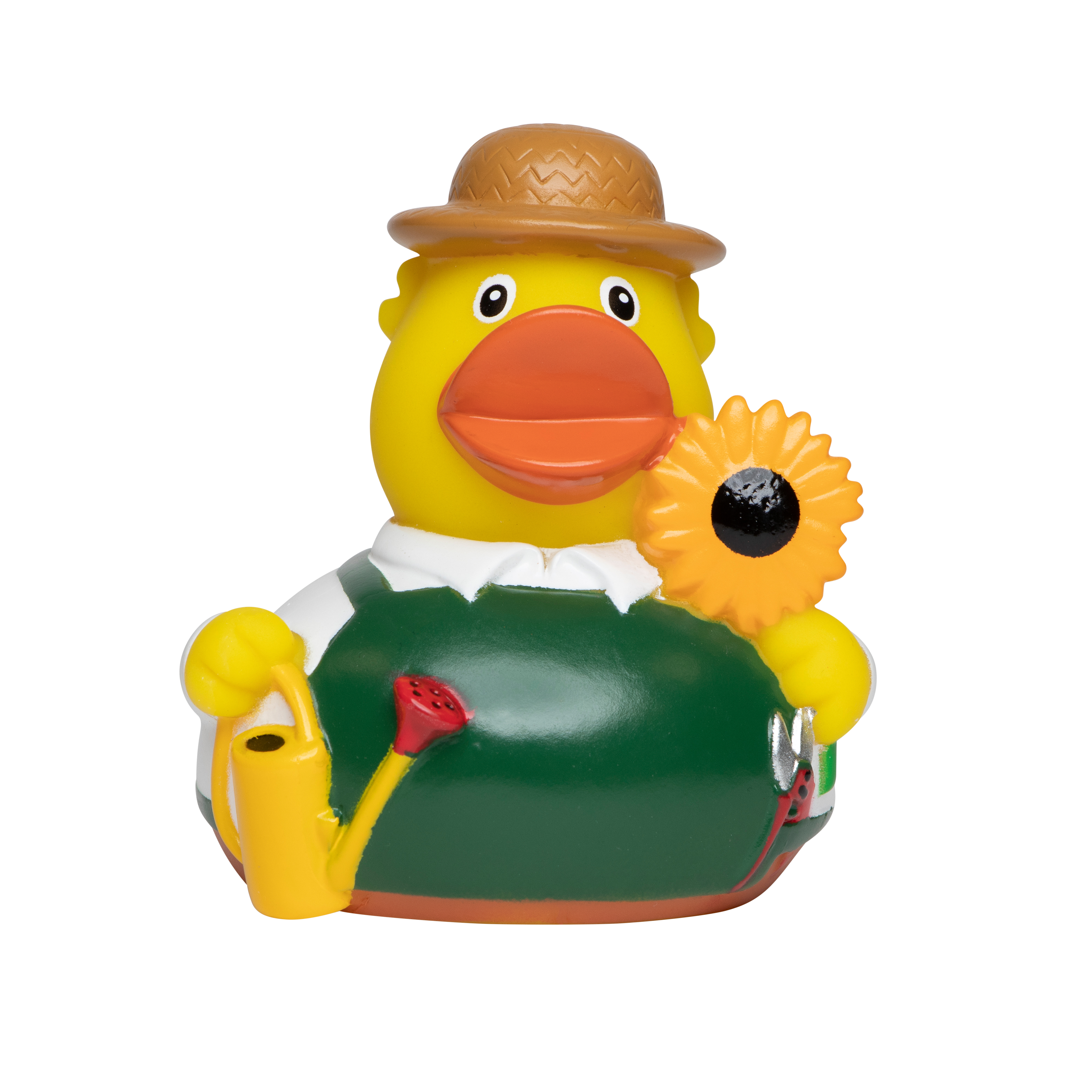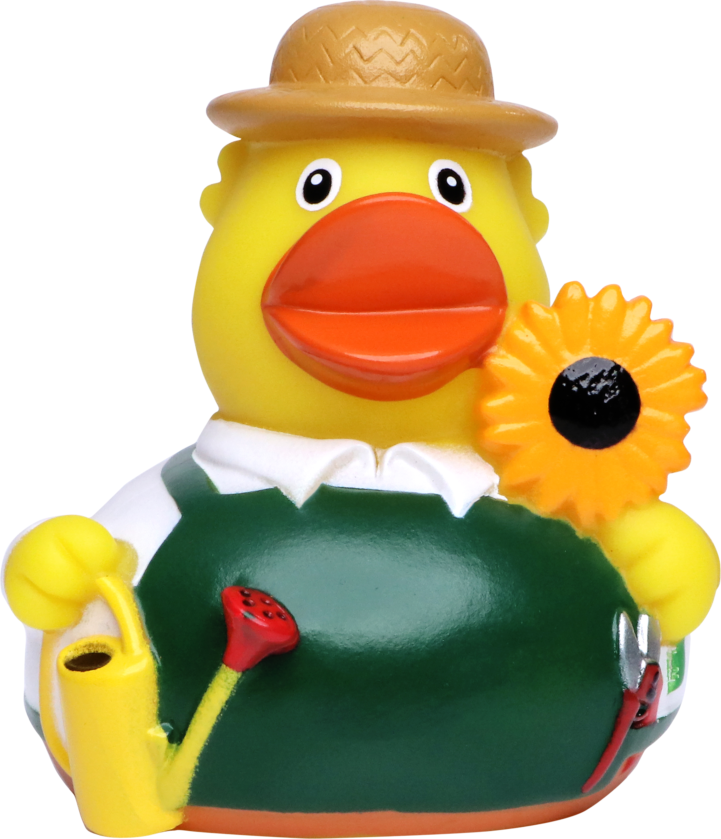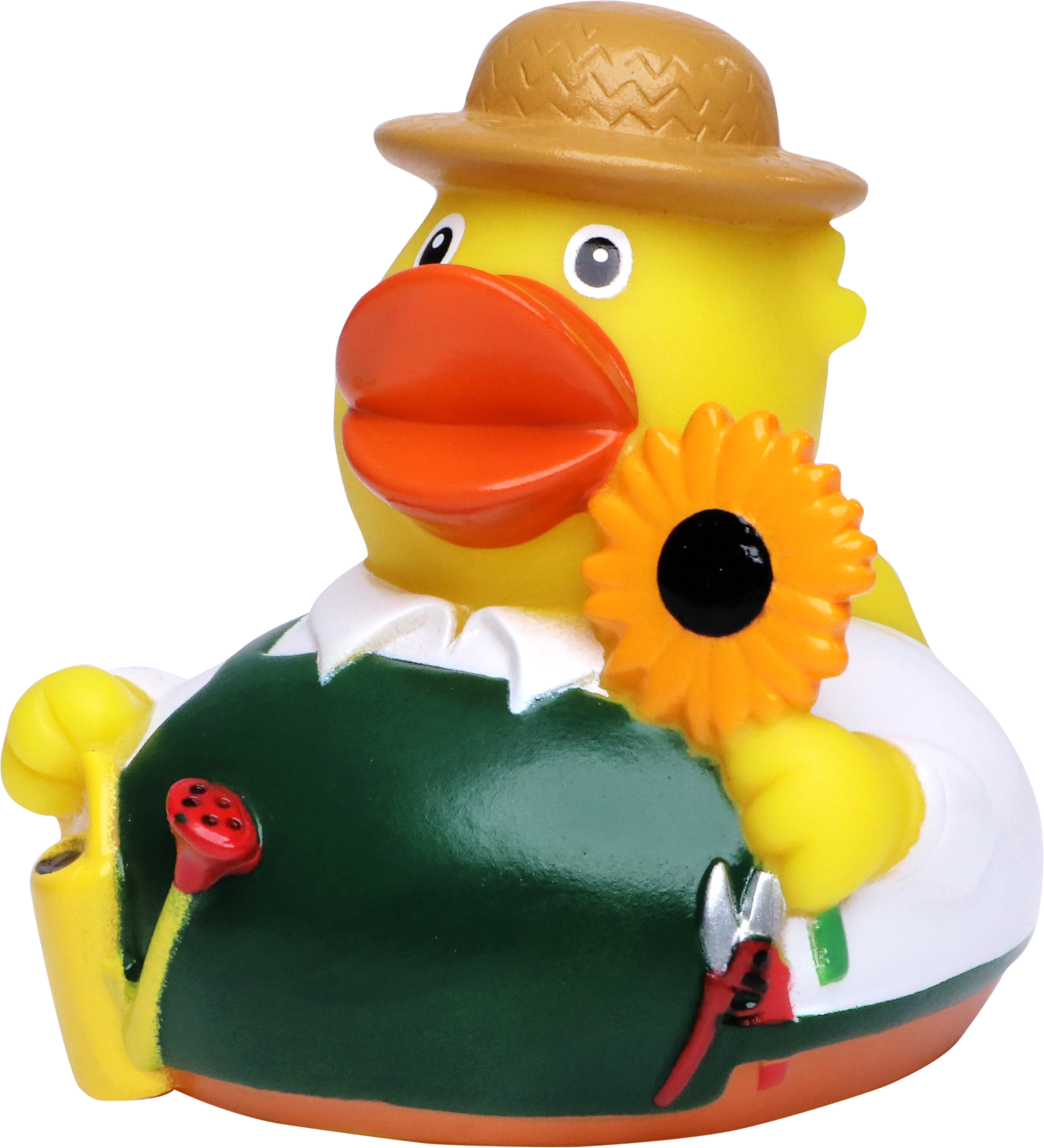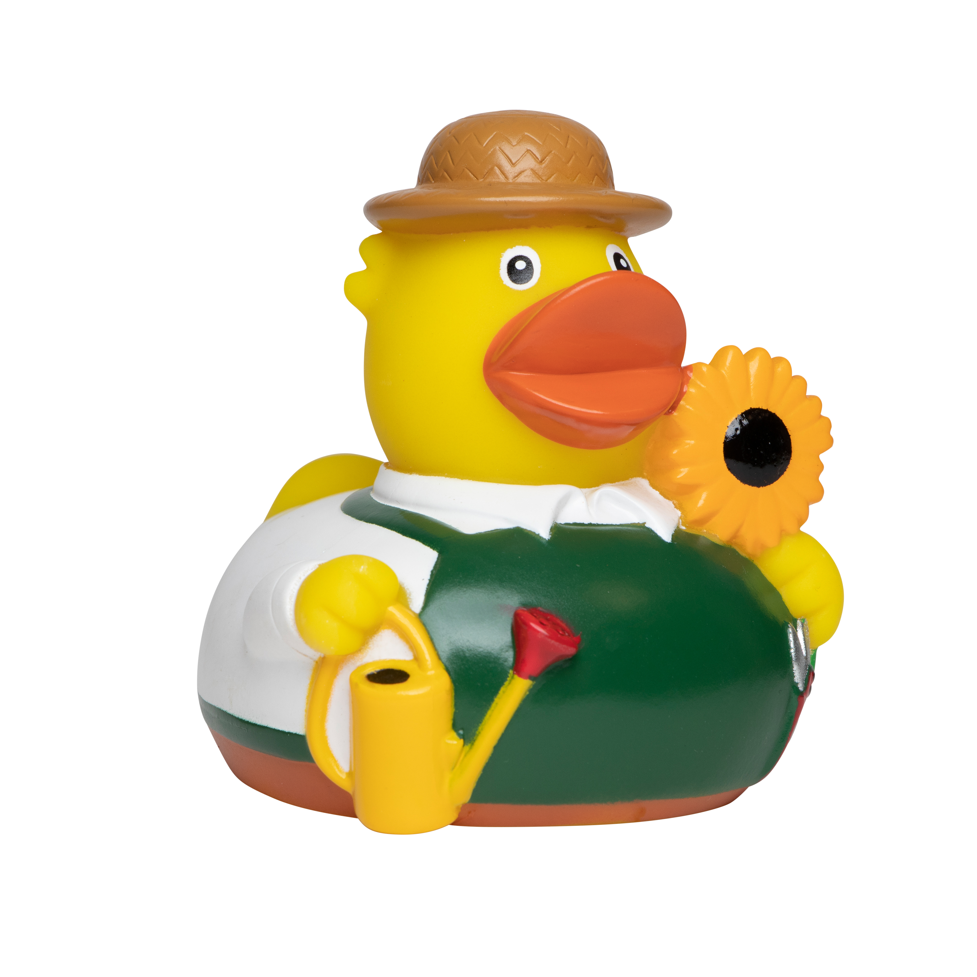 Unsere Gärtner-Ente mit Sonnenblume, Strohhut und gelber Gießkanne hat den grünen Daumen, und das ganz ohne Finger! Was diese Ente mit ihren Flügeln anpackt, wächst und gedeiht und mit der Gartenschere, die natürlich auch immer dabei ist, schneidet sie auch gerne mal eine der Blumen ab, um einen sonnigen Gruß mitzubringen.
