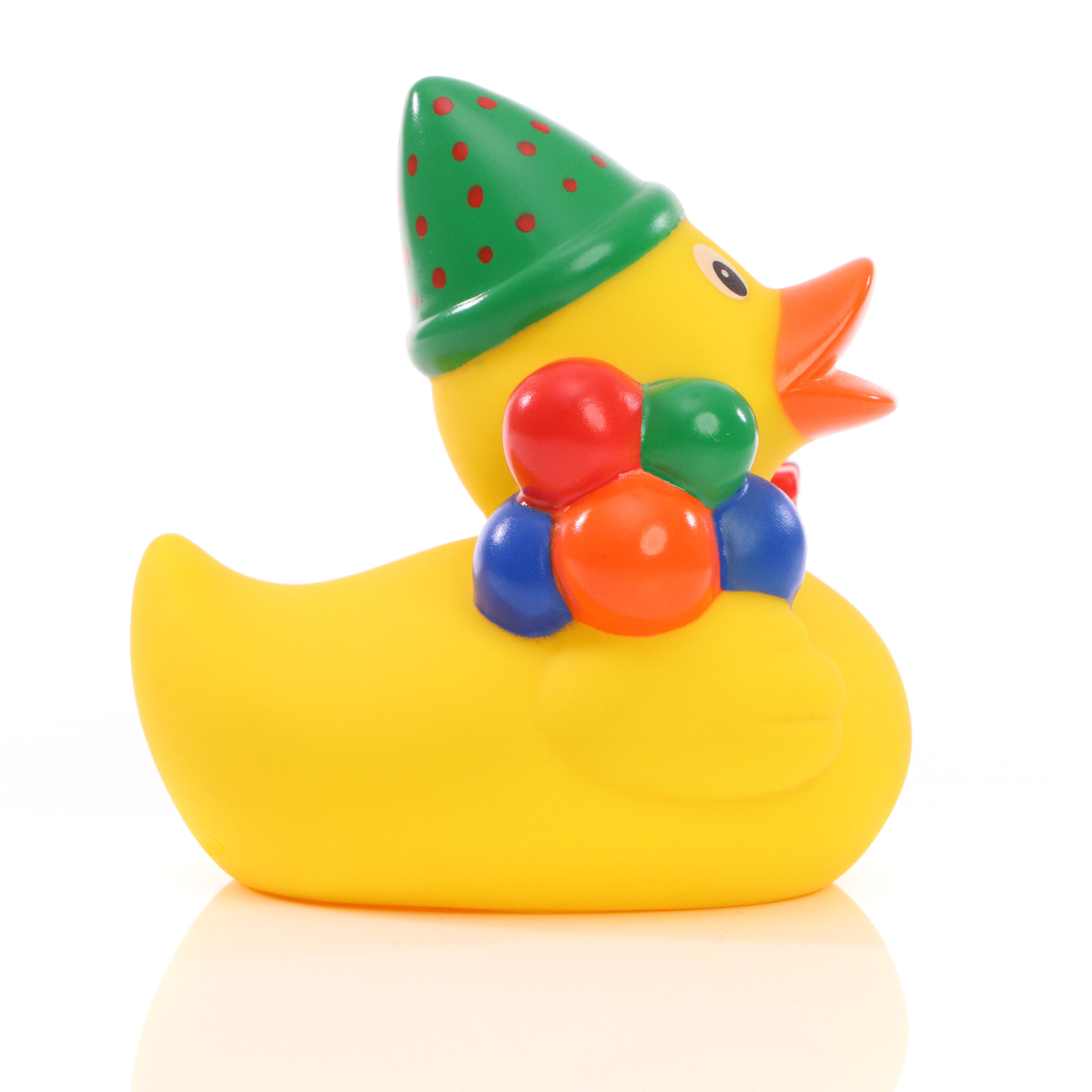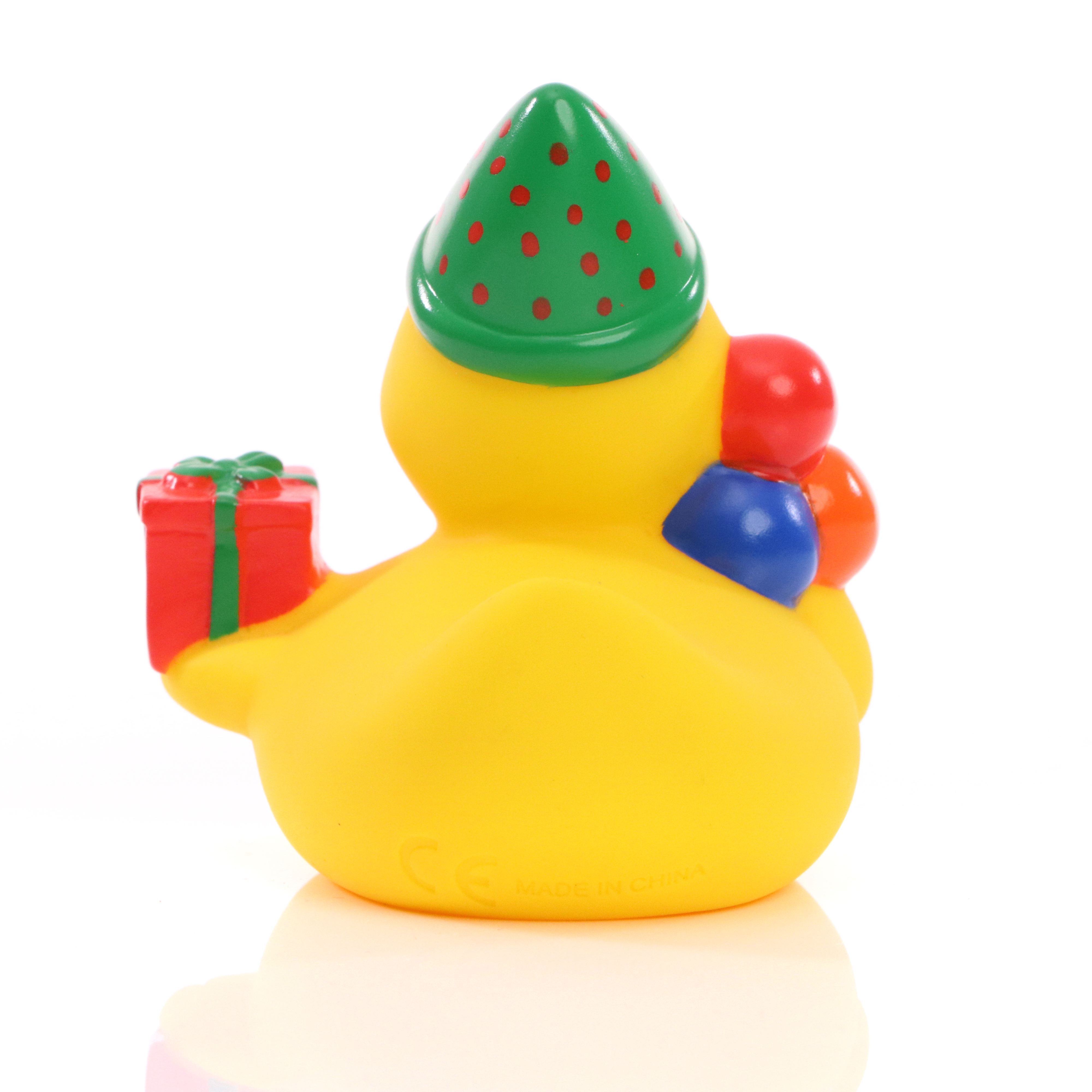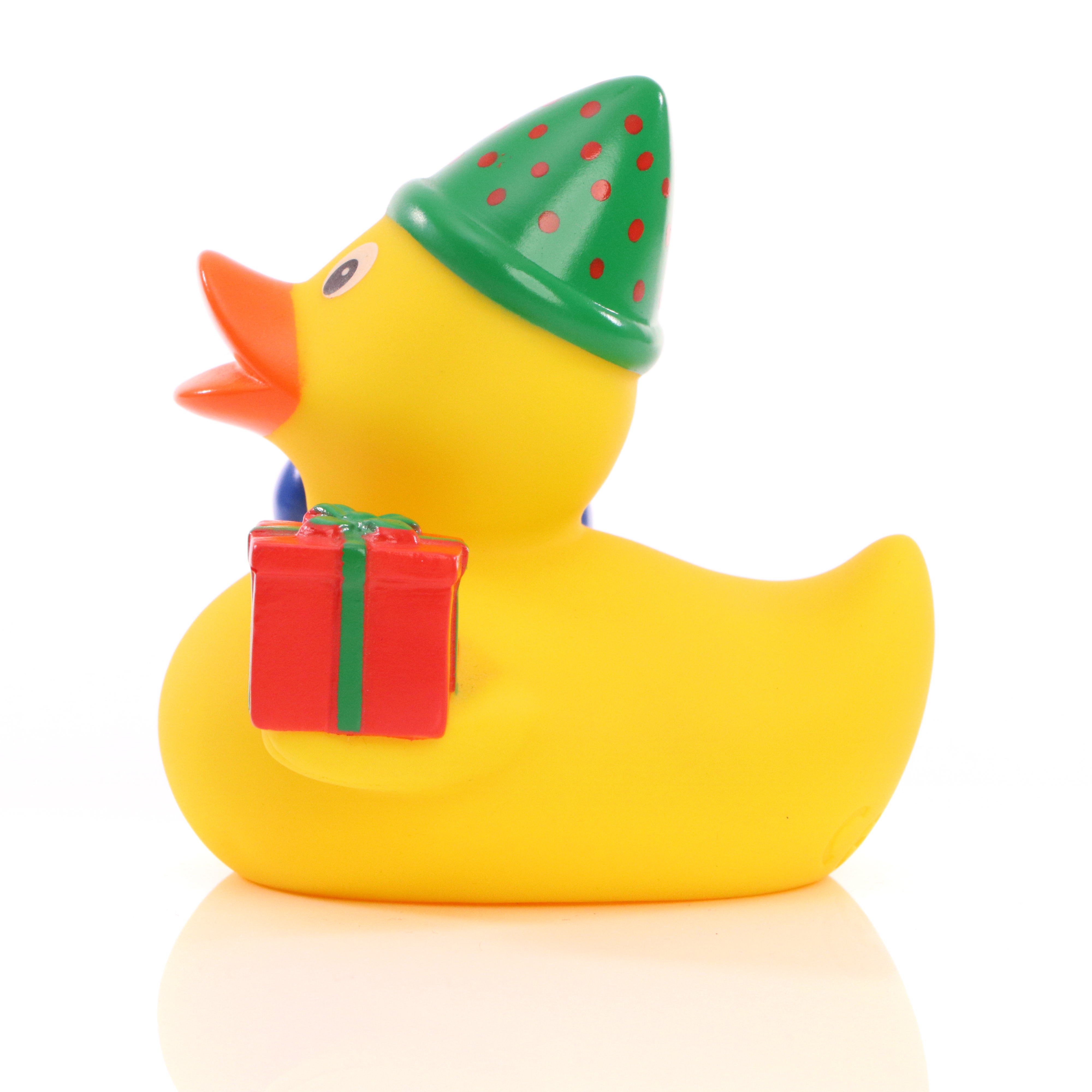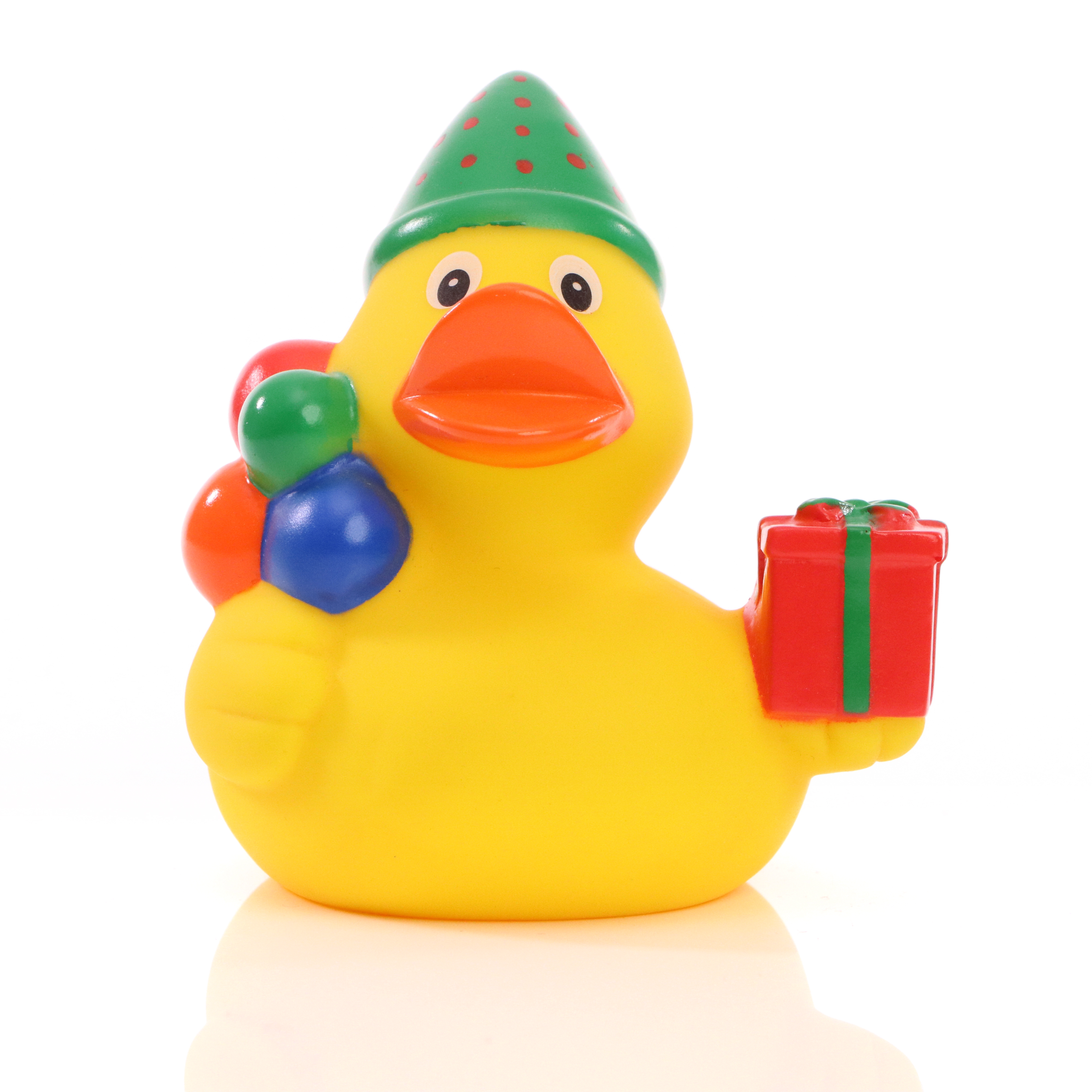 Endlich ist der große Tag da! Heute wird gefeiert was das Zeug hält. Die quietschvergnügte Badeente bringt mit dem Geschenk die herzlichsten Glückwünsche. Für die richtige Feierstimmung hat sie im rechten Flügel Ballons und den Partyhut auf dem Kopf. Let`s party!