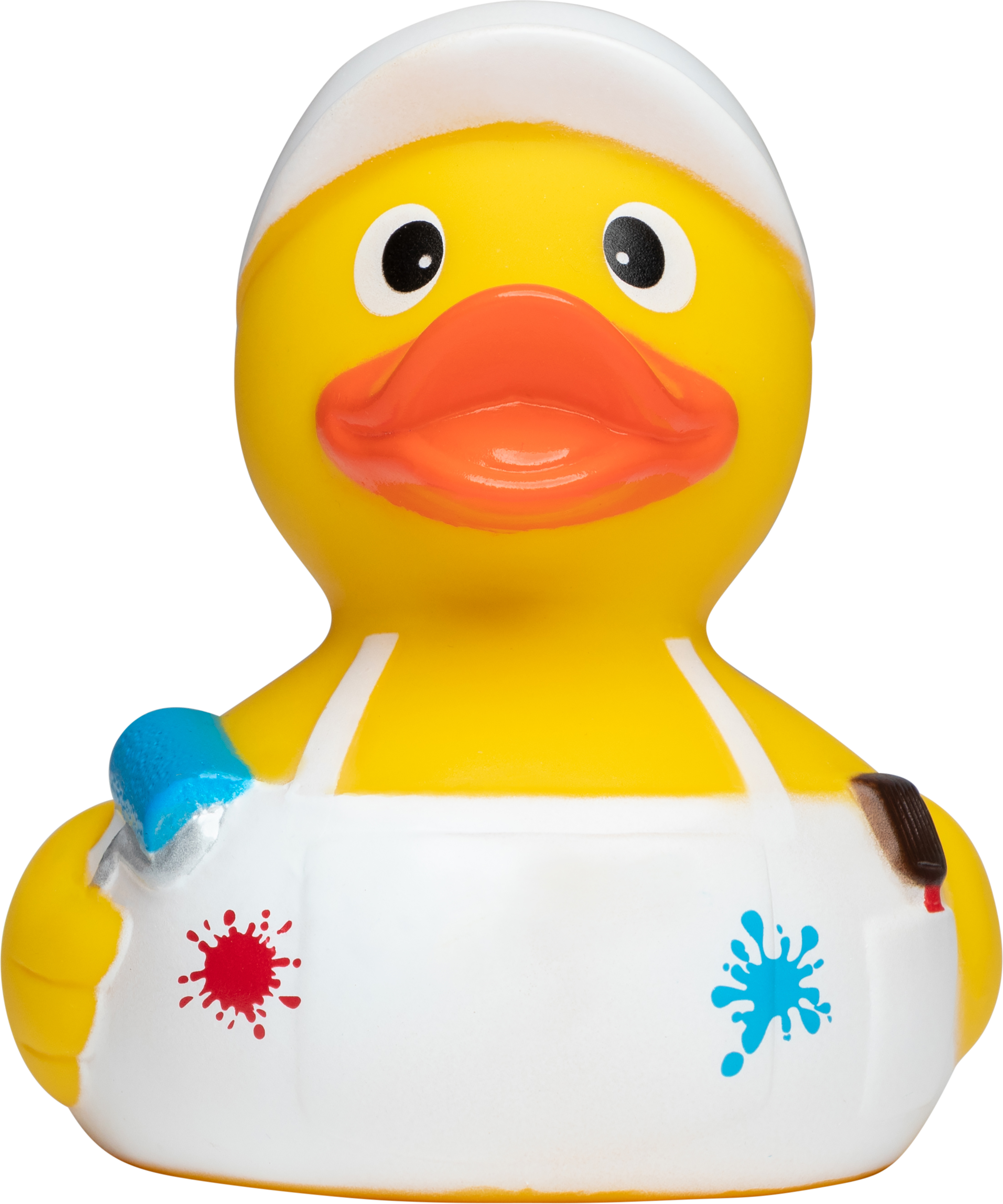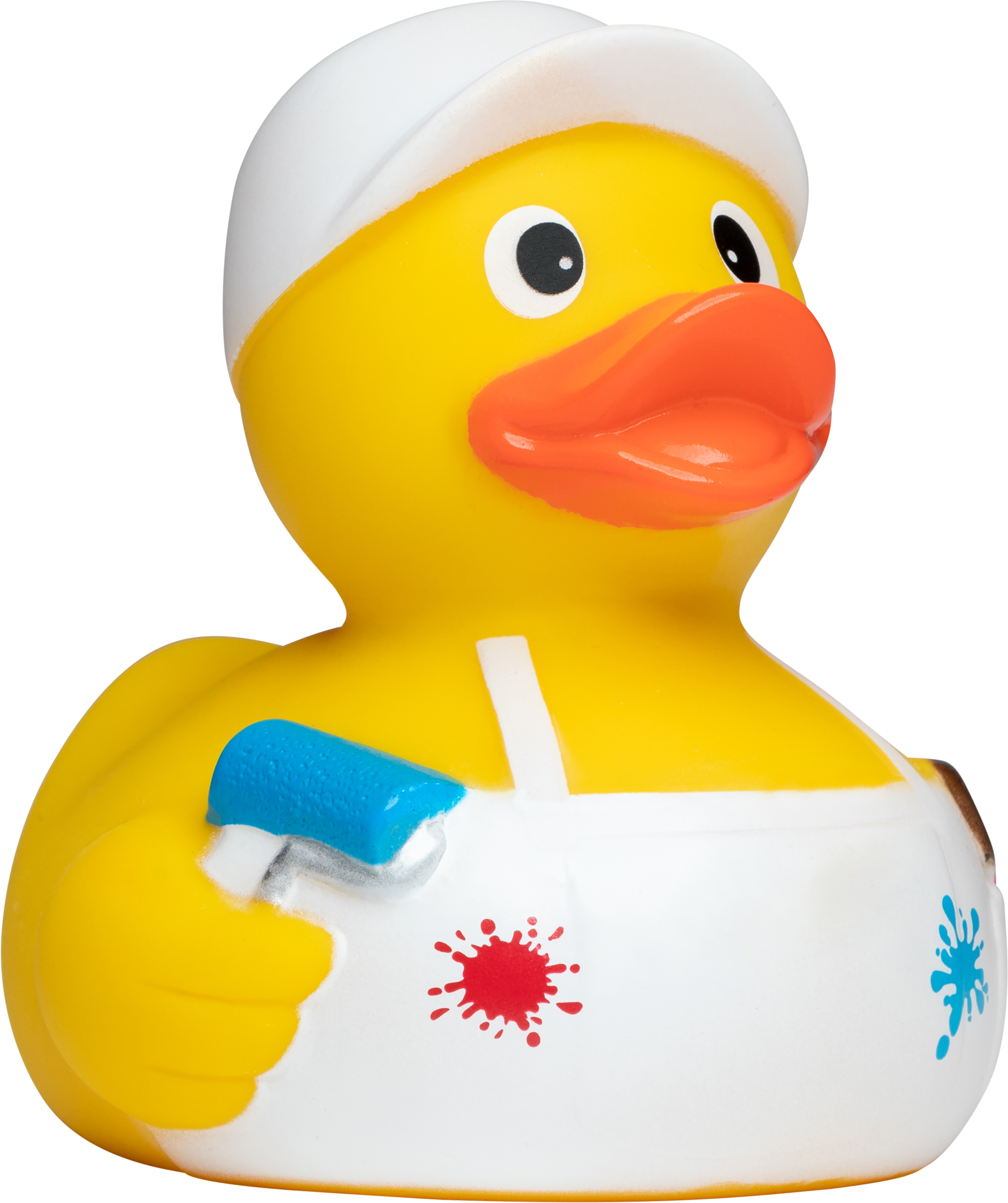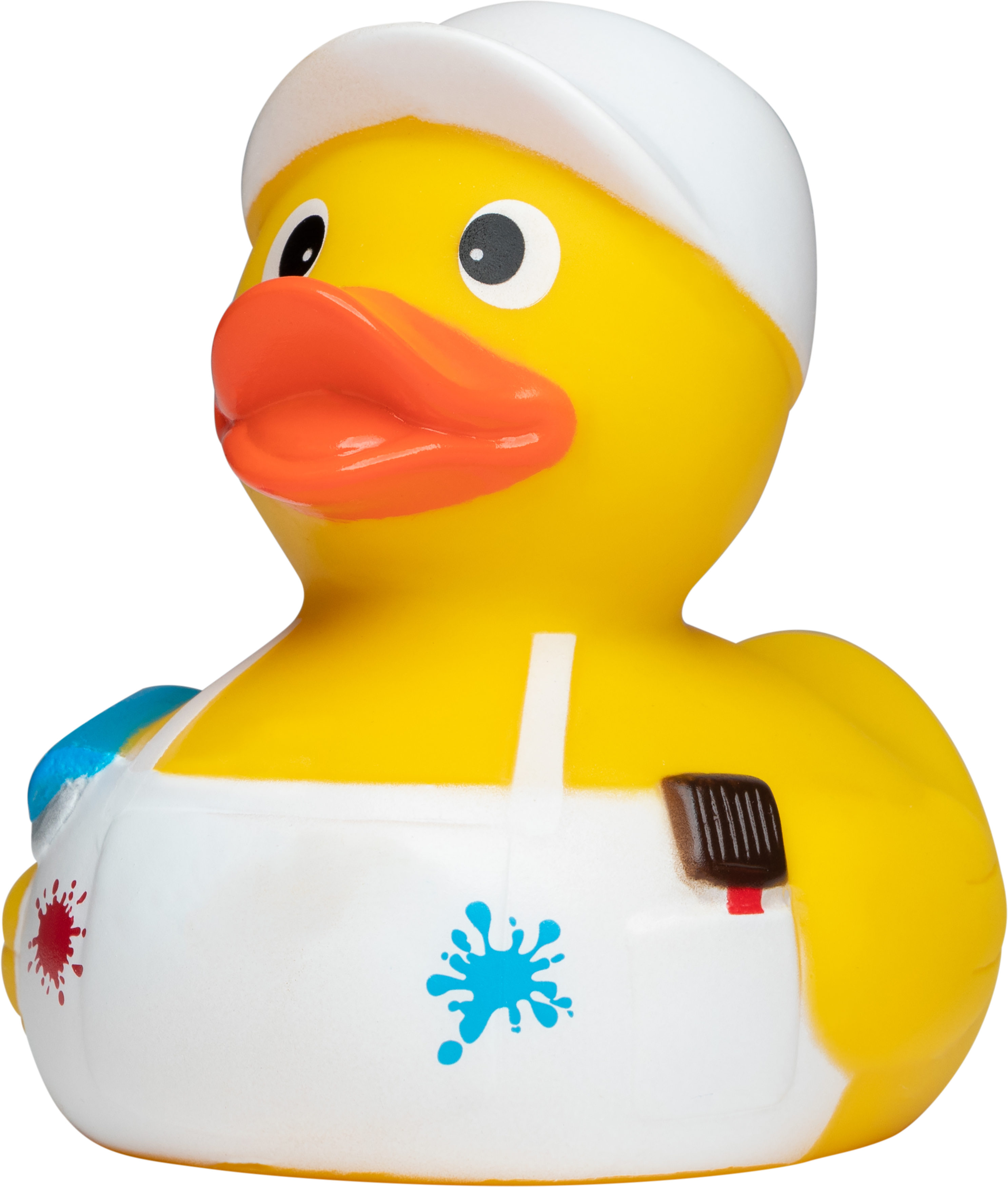 Weiße Fliesen? Weiße Kacheln? Oder schon ein bisschen bunt, aber einfach nicht bunt genug? Dann brauchen Sie dringend einen neuen Anstrich für Ihr Badezimmern! Und wer könnte das denn wohl besser als ein Profi? Diese Ente kommt mit Farbrolle und Pinsel, weißer Latzhose und Schirmmütze – die Farbflecken auf ihrem Outfit verraten, dass unser Maler fleißig ist.