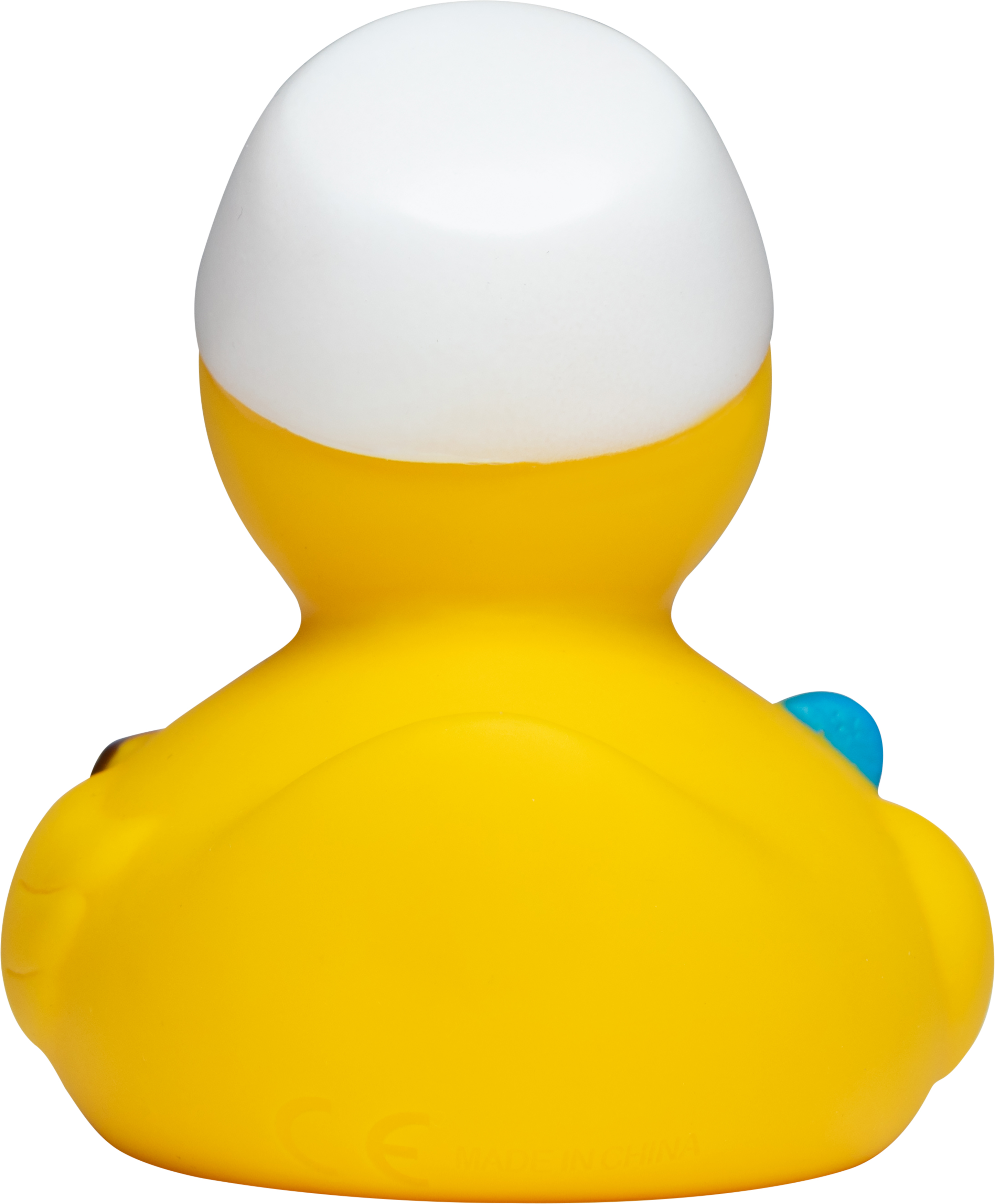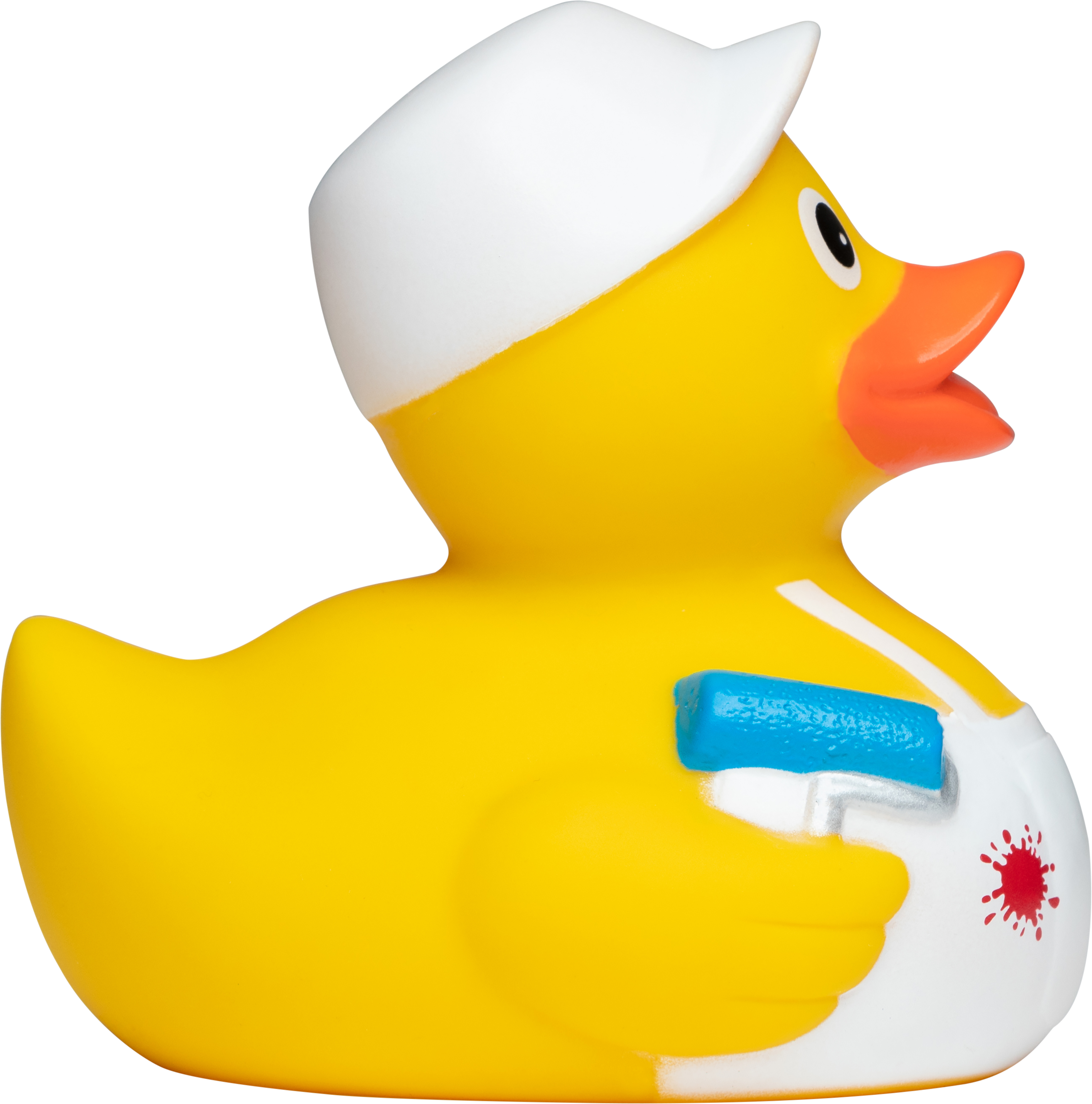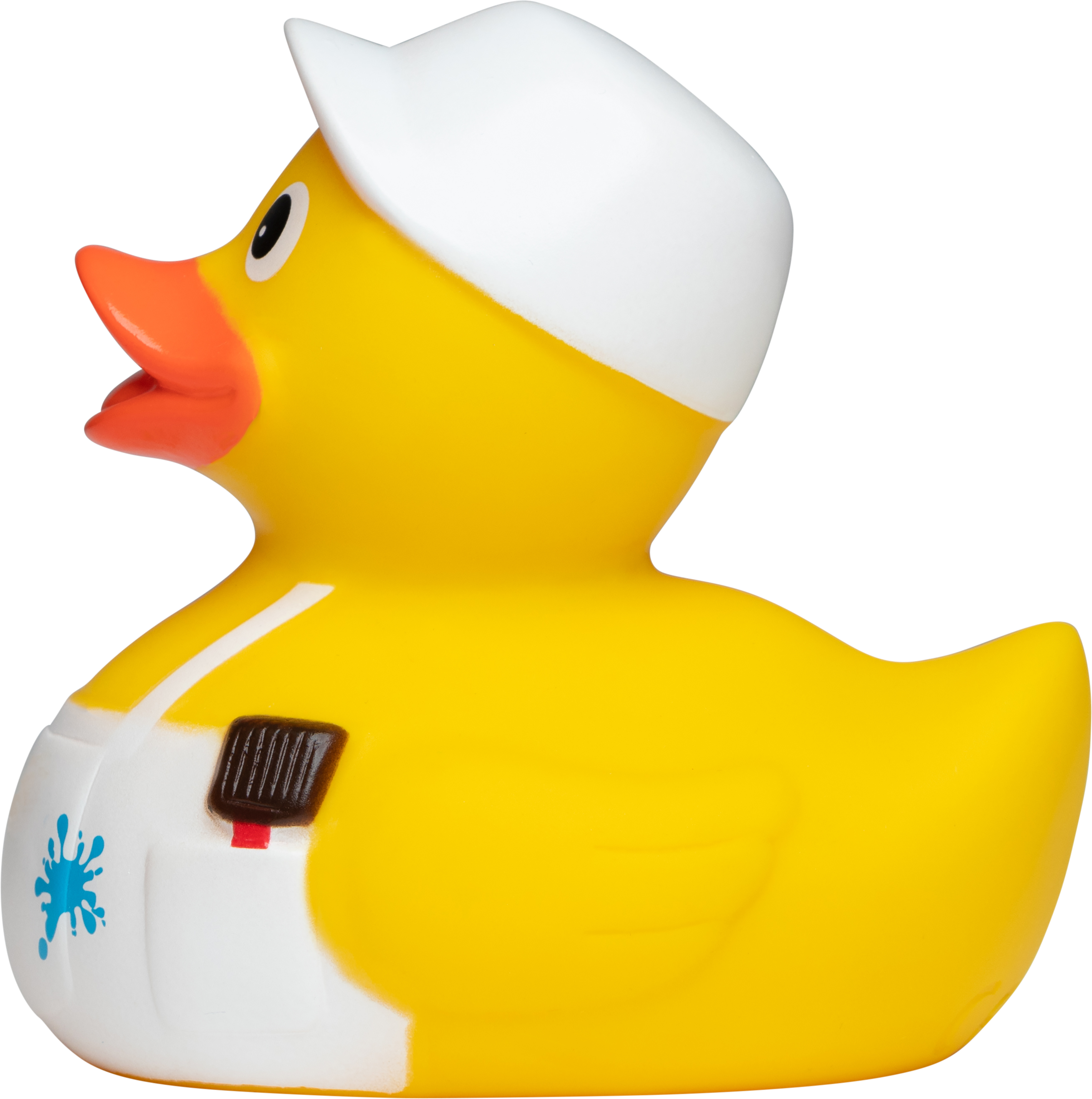 Weiße Fliesen? Weiße Kacheln? Oder schon ein bisschen bunt, aber einfach nicht bunt genug? Dann brauchen Sie dringend einen neuen Anstrich für Ihr Badezimmern! Und wer könnte das denn wohl besser als ein Profi? Diese Ente kommt mit Farbrolle und Pinsel, weißer Latzhose und Schirmmütze – die Farbflecken auf ihrem Outfit verraten, dass unser Maler fleißig ist.