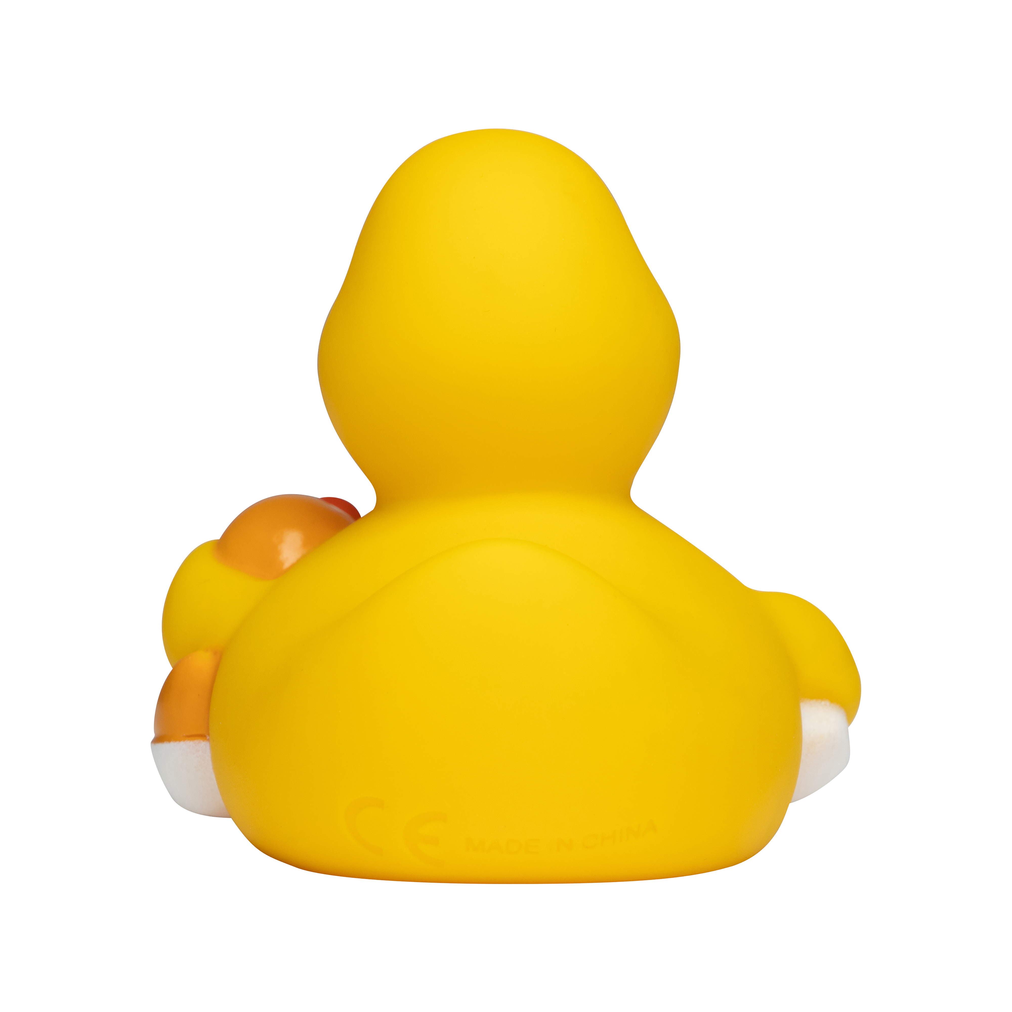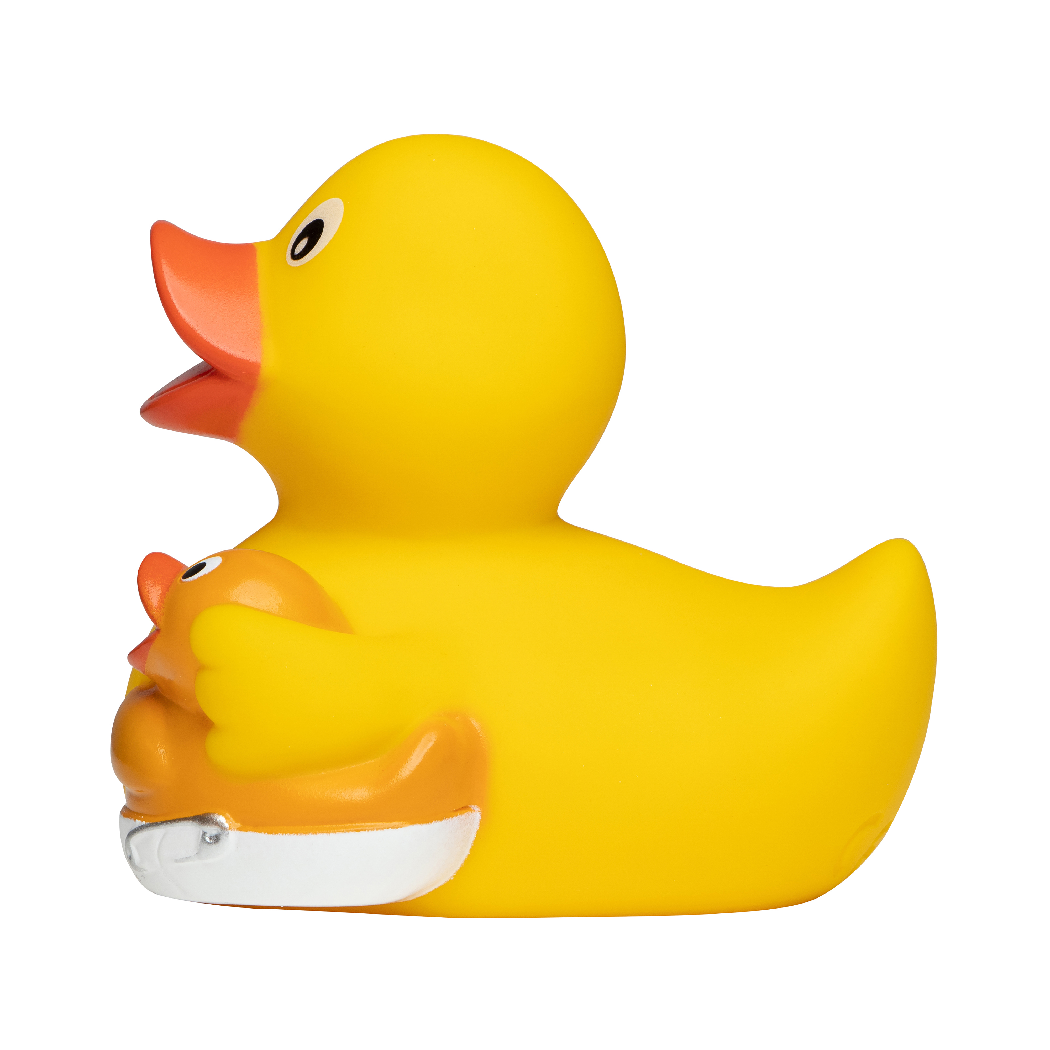 Liebevoll hält die Quietsche-Enten-Mama ihr kleines Küken im Arm. Frisch gewickelt und satt genuckelt strahlen beide um die Wette.