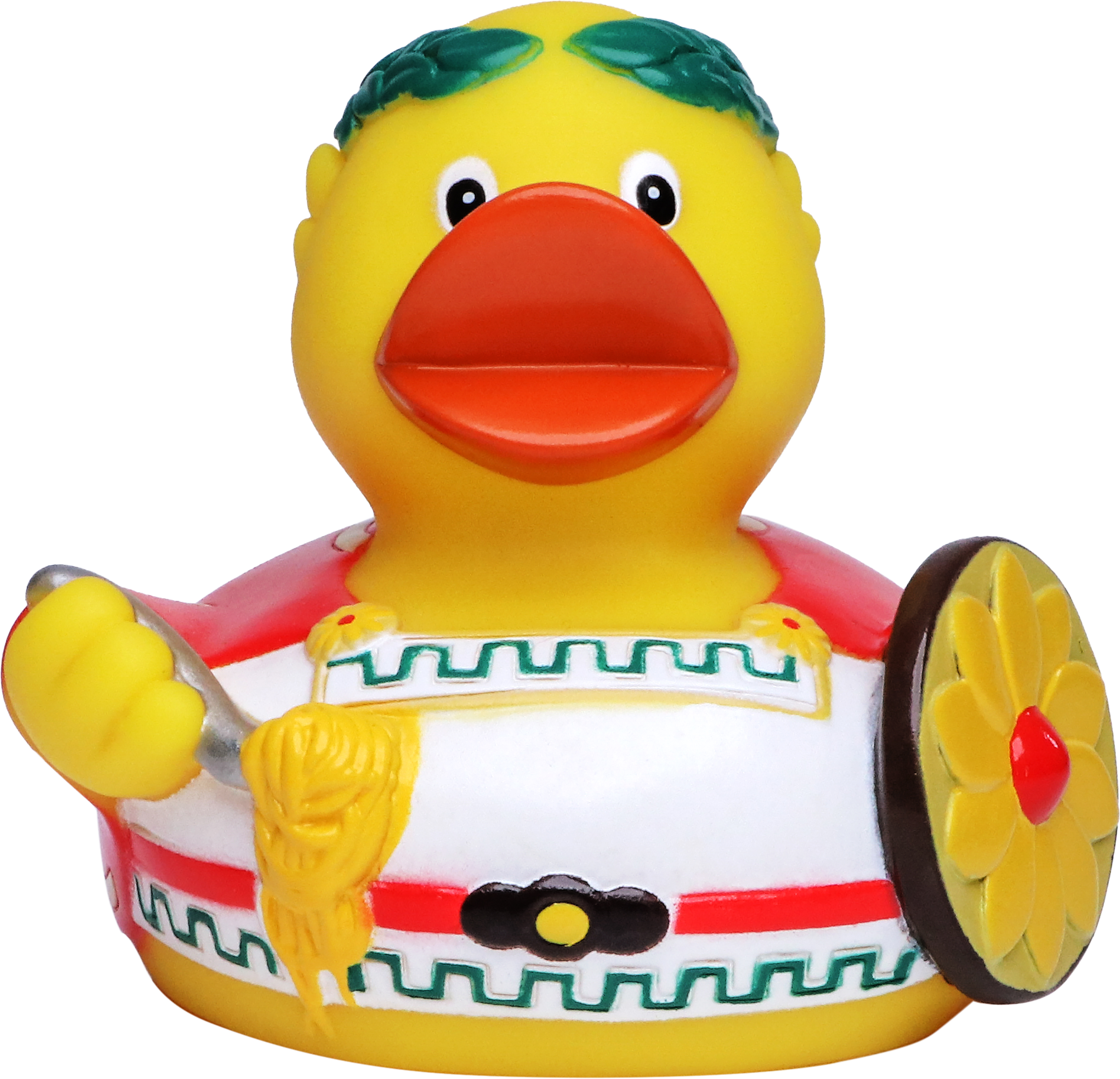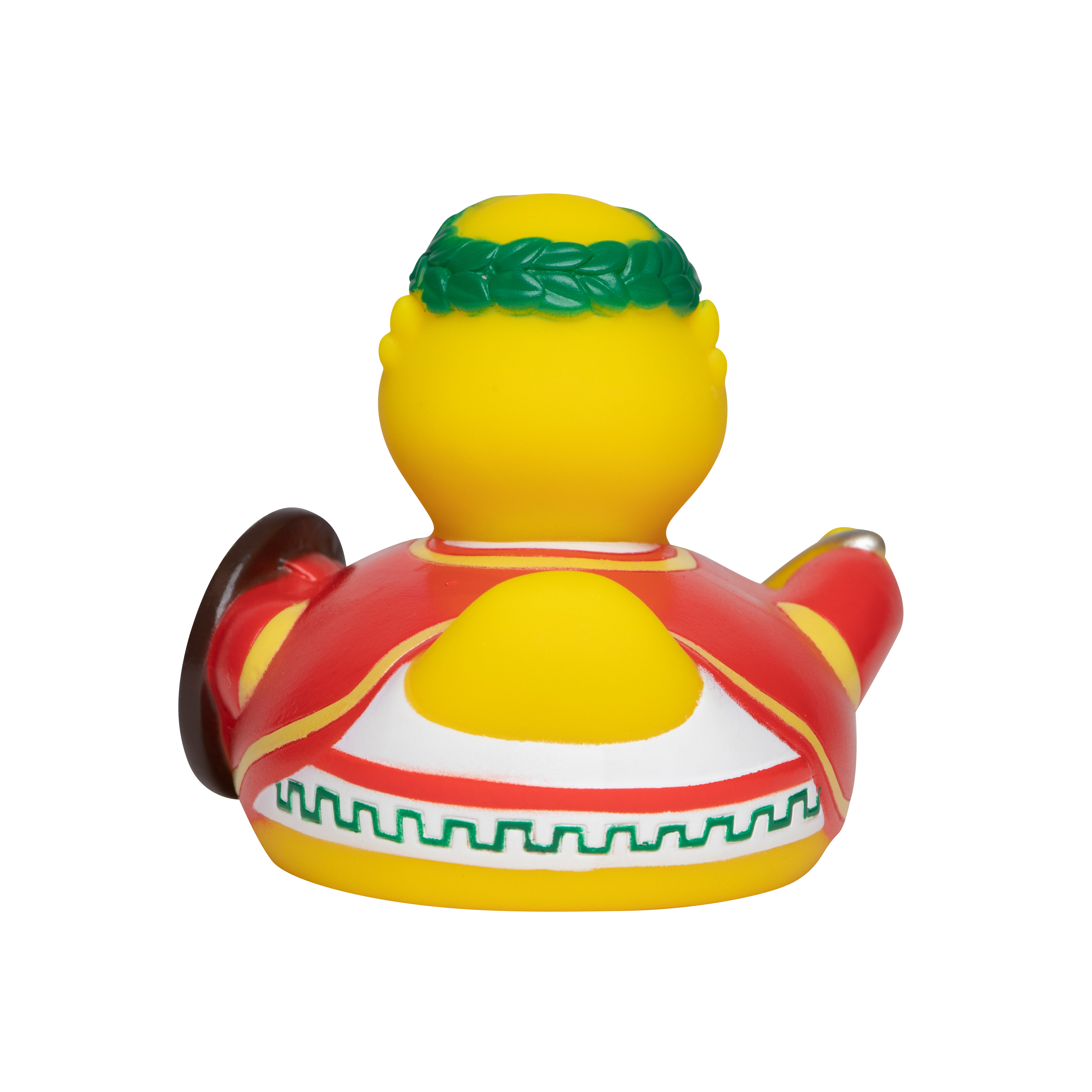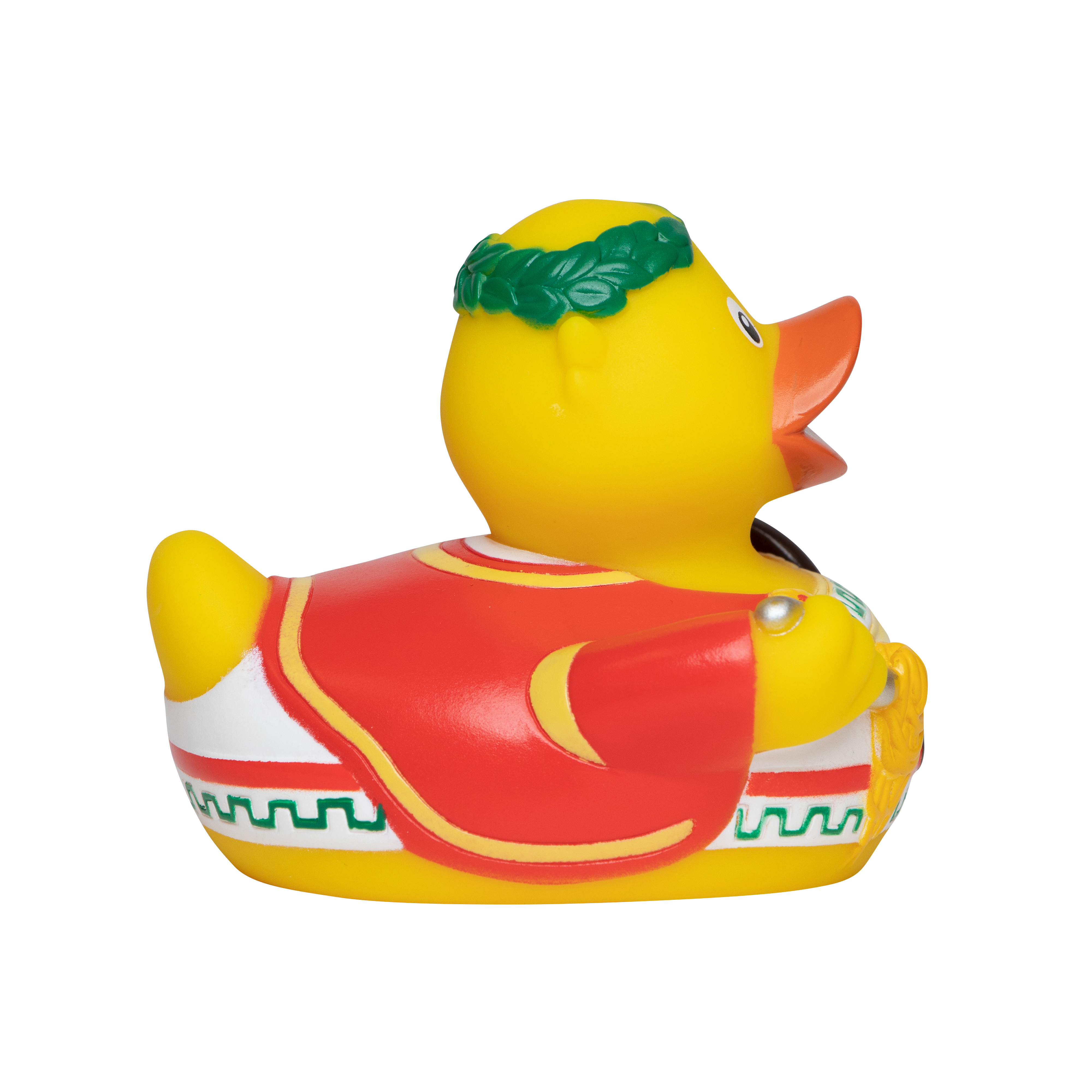 Da Irren menschlich ist, fühlt sich unsere CityDuck® in ihrem schmucken Gewand über jeden Zweifel erhaben. Statt eines Zepters führt sie lieber eine Gabel saftiger Spaghetti mit sich, so kommt das "Dolce Vita" auch beim Regieren nicht zu kurz. Das reich verzierte Kriegsschild dient wahlweise als Teller oder um Futterneider abzuwehren. In jedem Fall ist es eine dekorative Ergänzung zur festlichen Tunika, die den runden Formen unseres flatterhaften Imperators ausgesprochen schmeichelt. Der traditionelle Lorbeerkranz kaschiert das kahle Haupt und eignet sich im Bedarfsfall, um dem kaiserlichen Leben etwas Würze zu verleihen.