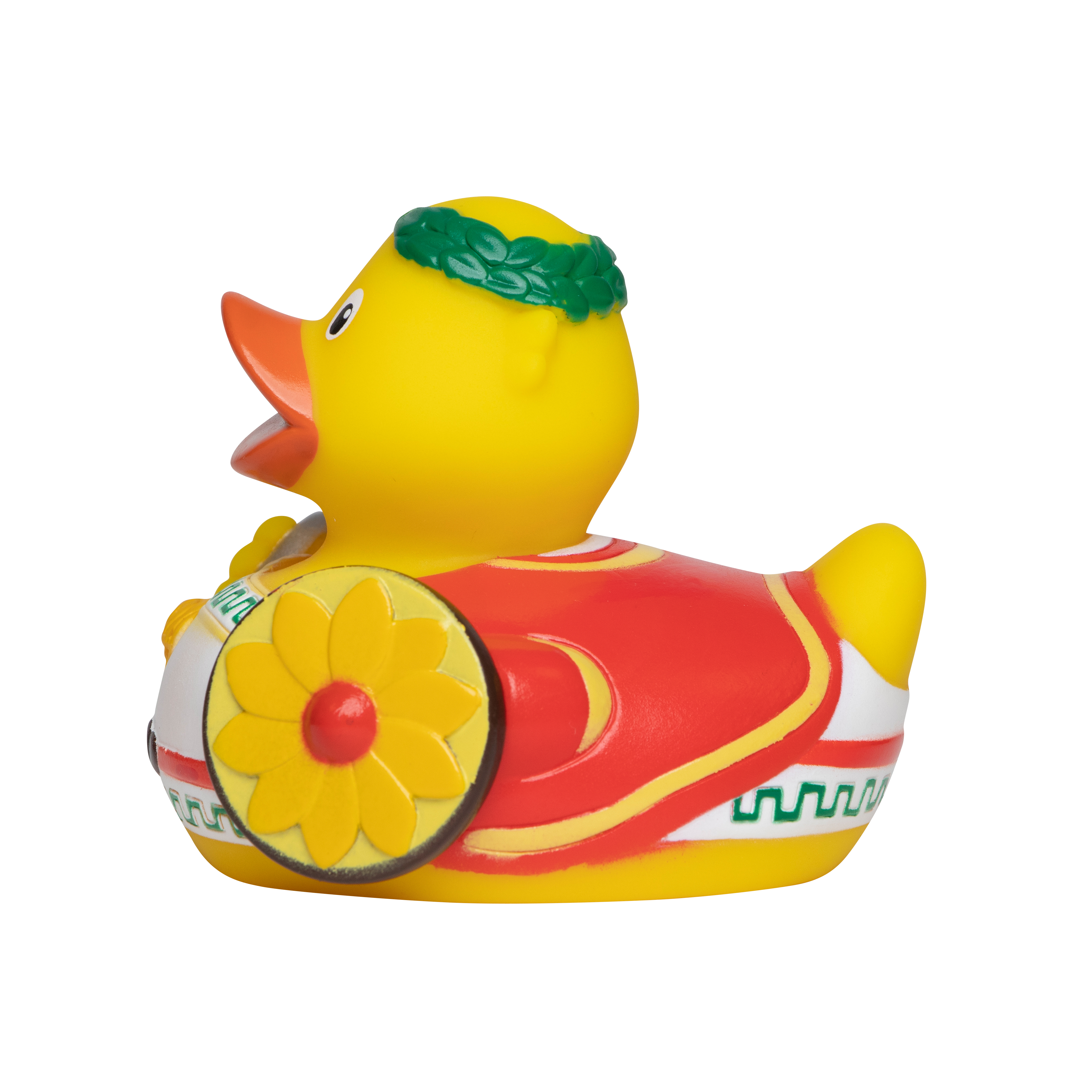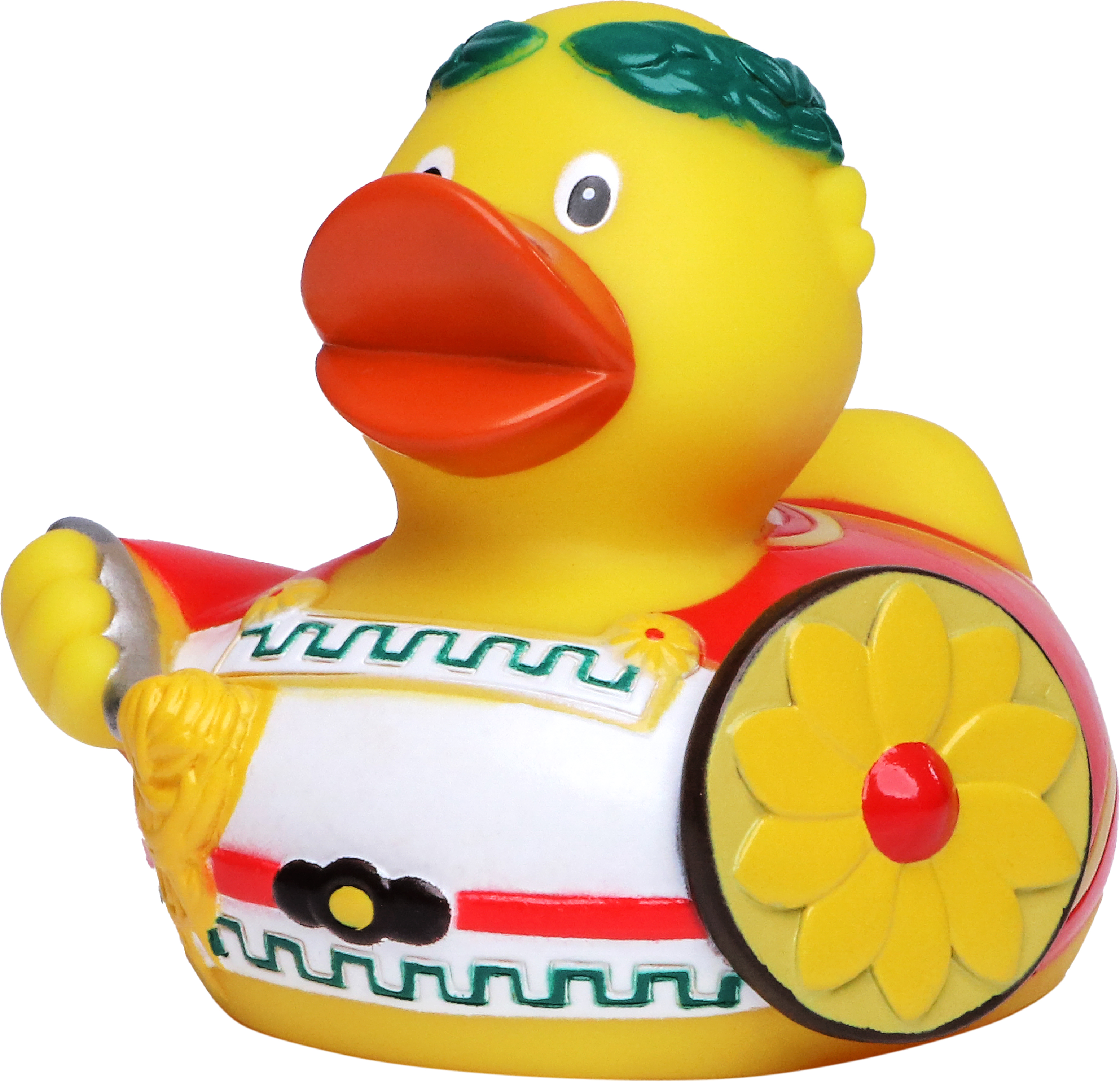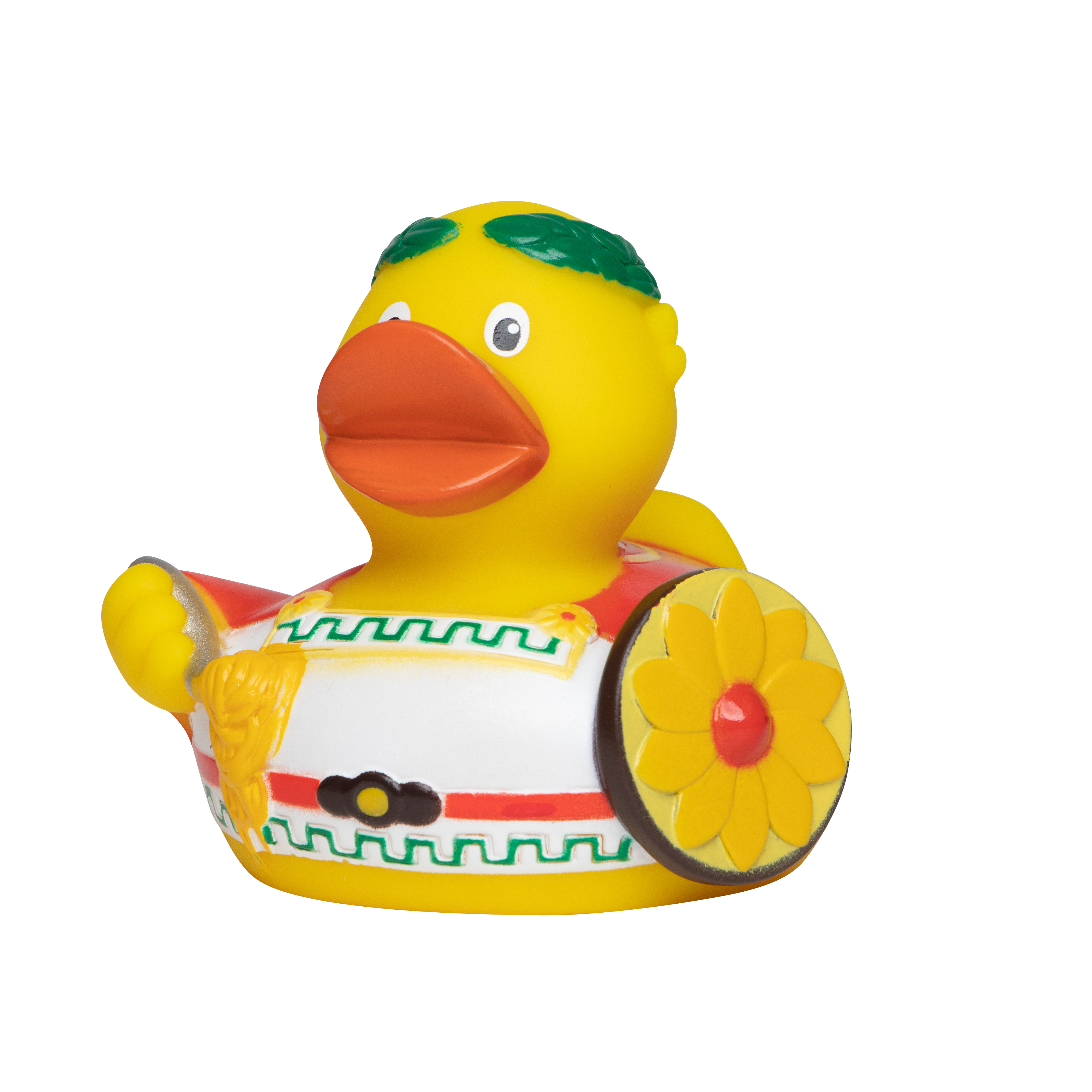Da Irren menschlich ist, fühlt sich unsere CityDuck® in ihrem schmucken Gewand über jeden Zweifel erhaben. Statt eines Zepters führt sie lieber eine Gabel saftiger Spaghetti mit sich, so kommt das "Dolce Vita" auch beim Regieren nicht zu kurz. Das reich verzierte Kriegsschild dient wahlweise als Teller oder um Futterneider abzuwehren. In jedem Fall ist es eine dekorative Ergänzung zur festlichen Tunika, die den runden Formen unseres flatterhaften Imperators ausgesprochen schmeichelt. Der traditionelle Lorbeerkranz kaschiert das kahle Haupt und eignet sich im Bedarfsfall, um dem kaiserlichen Leben etwas Würze zu verleihen.