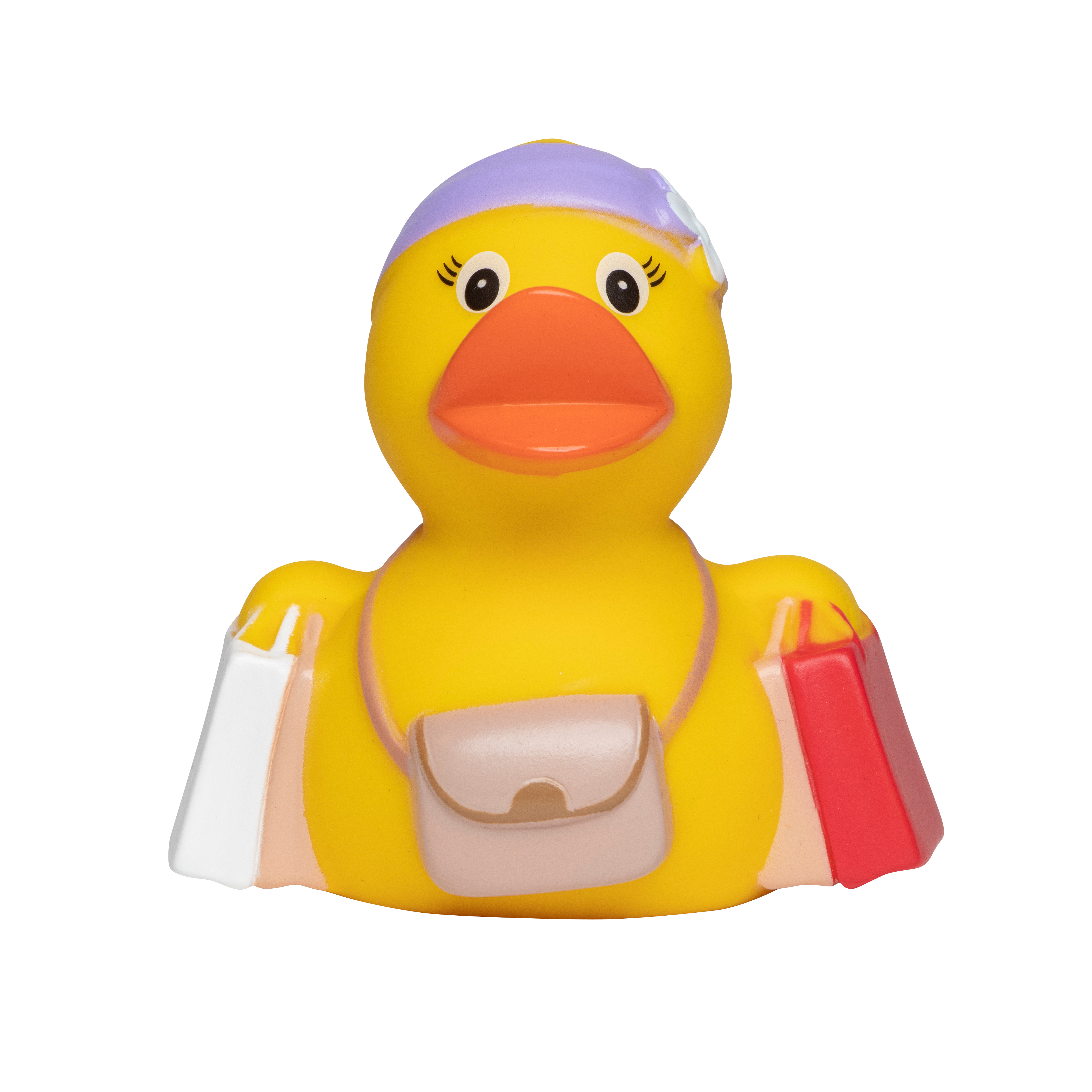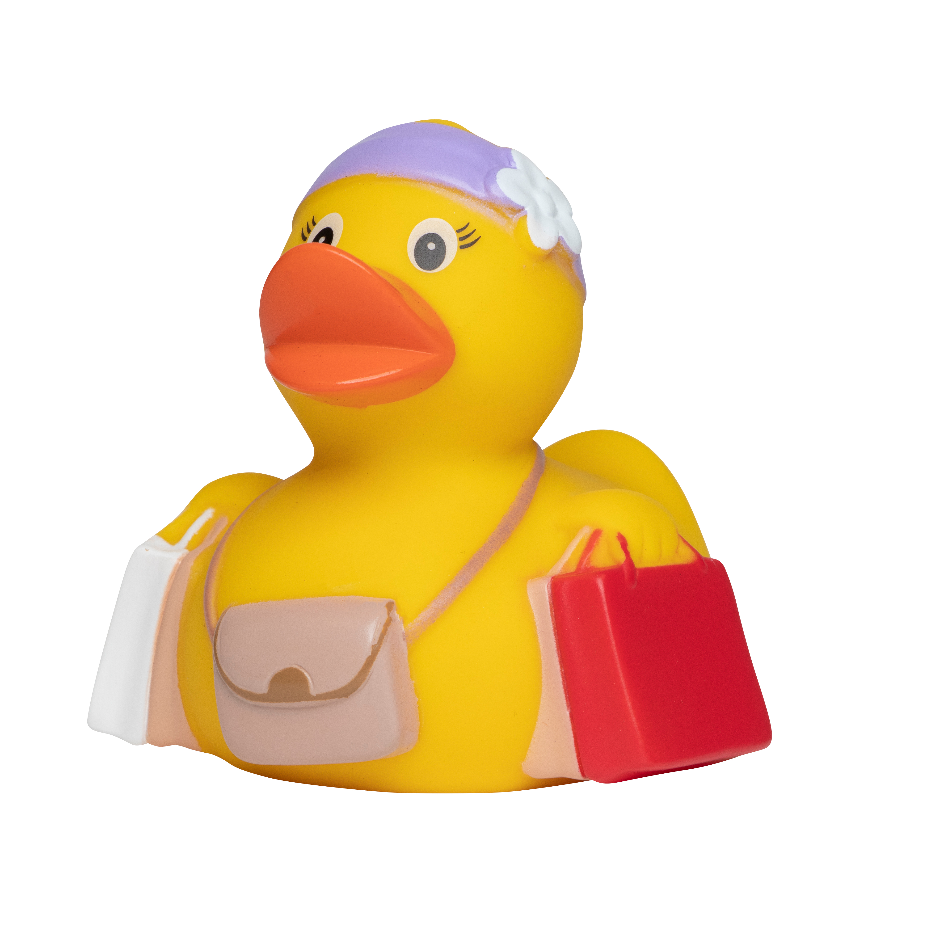 Schwer bepackt mit strahlenden Augen kommt das niedliche Entlein von einem erfolgreichen Stadtbummel nach Hause. Nach ausgiebigem Auspacken, Betrachten und Freuen steht einem entspannenden Schaumbad nichts mehr im Weg.