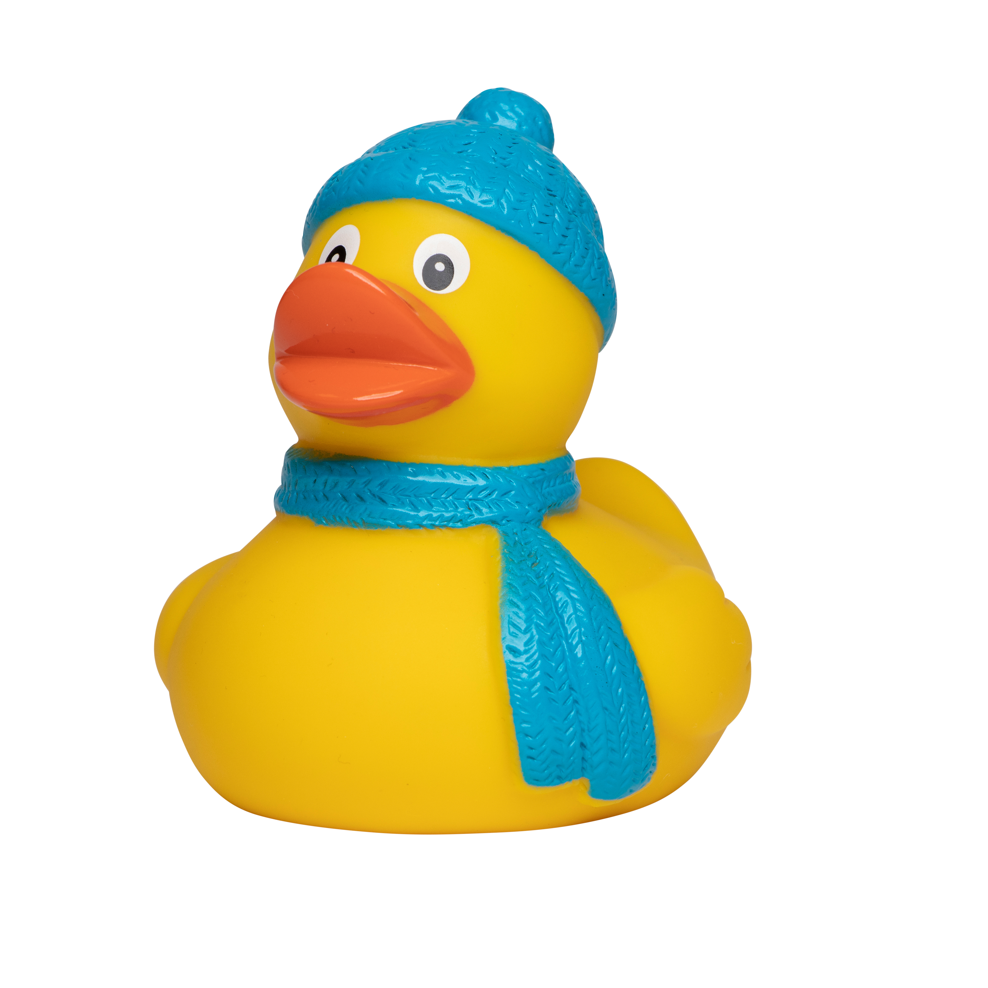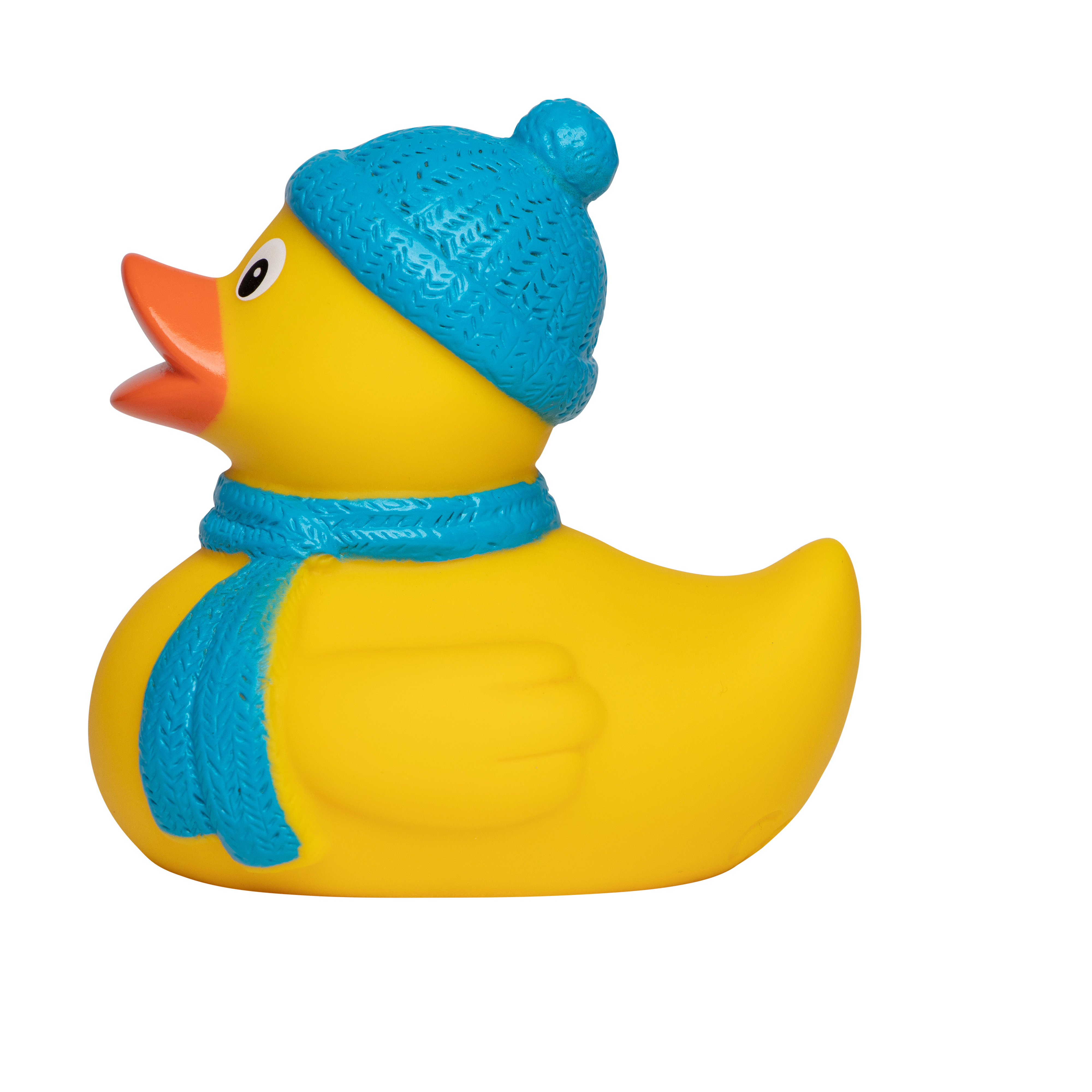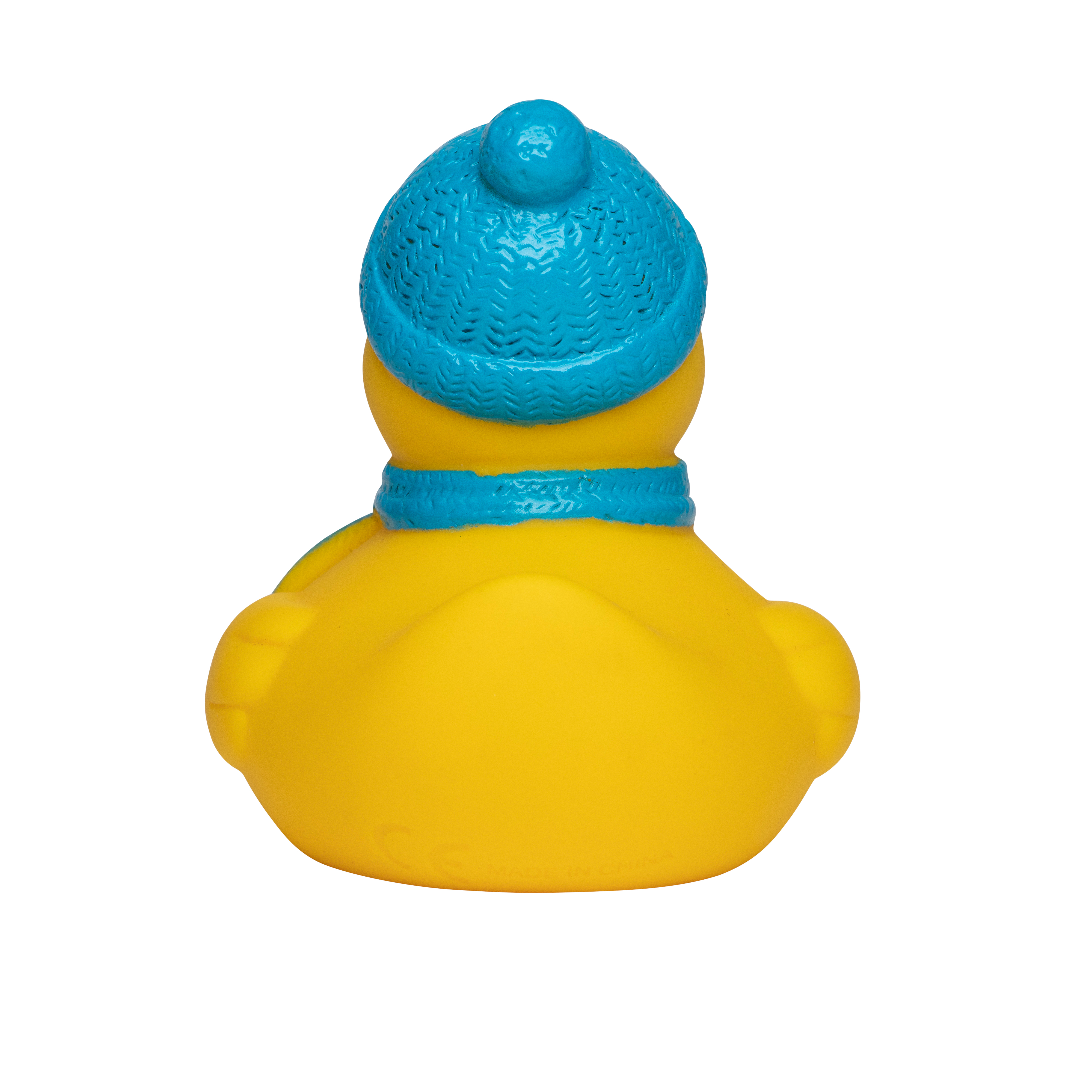 Ein richtiges Winterkind ist das gelbe Schnabeltier mit blauer Mütze und Schal. Die frostigsten Temperaturen können ihm nichts anhaben. Mit bester Laune und einem breiten Lächeln kommt die niedliche Badeente zu Ihnen nach Hause.