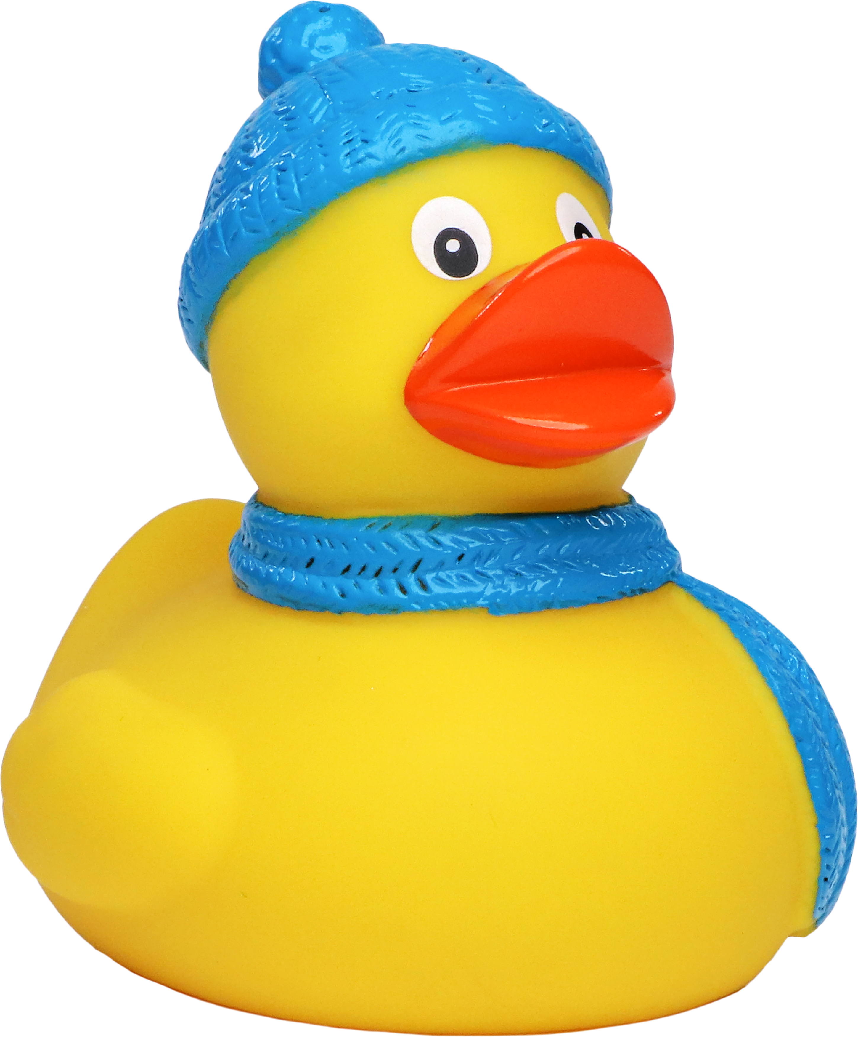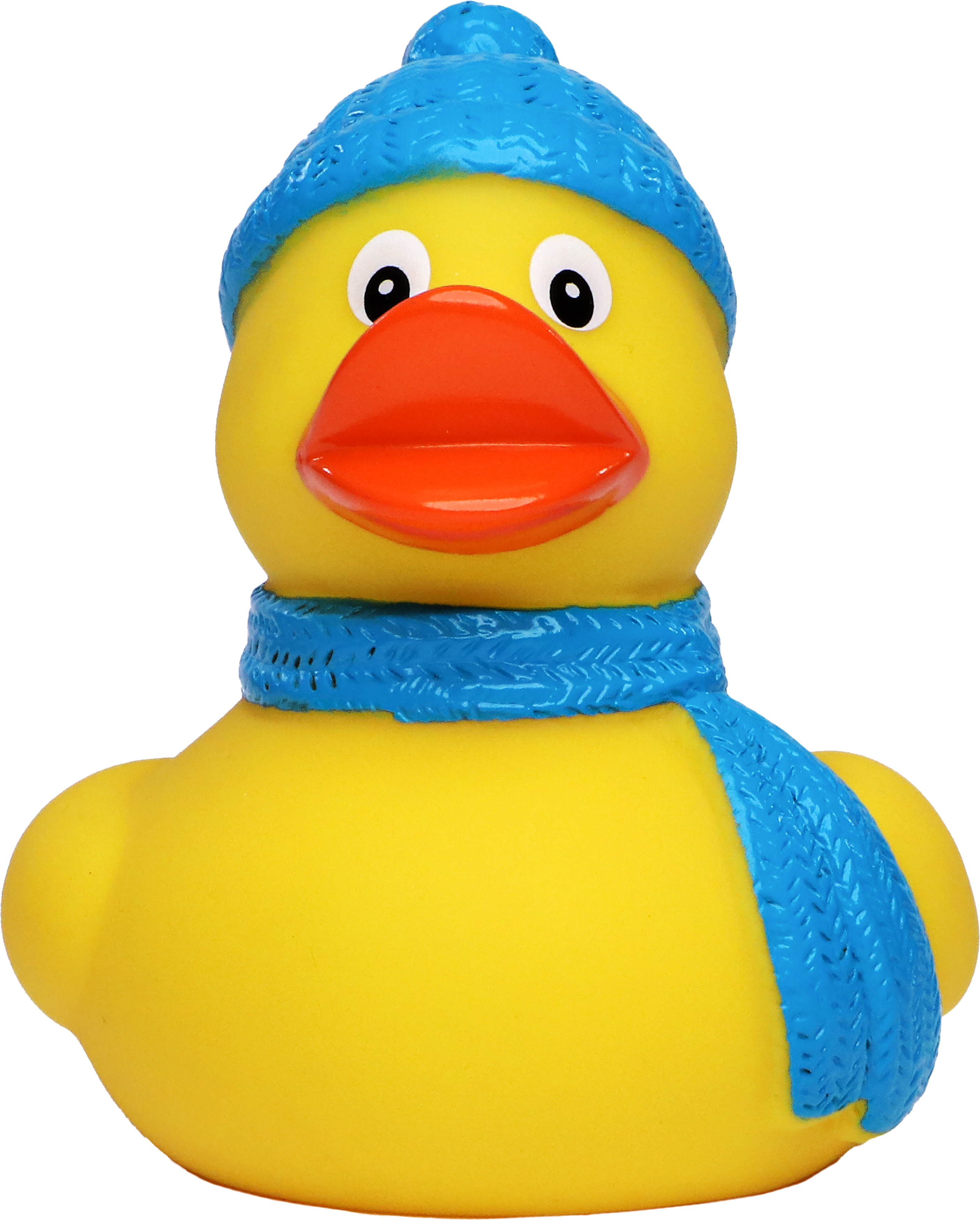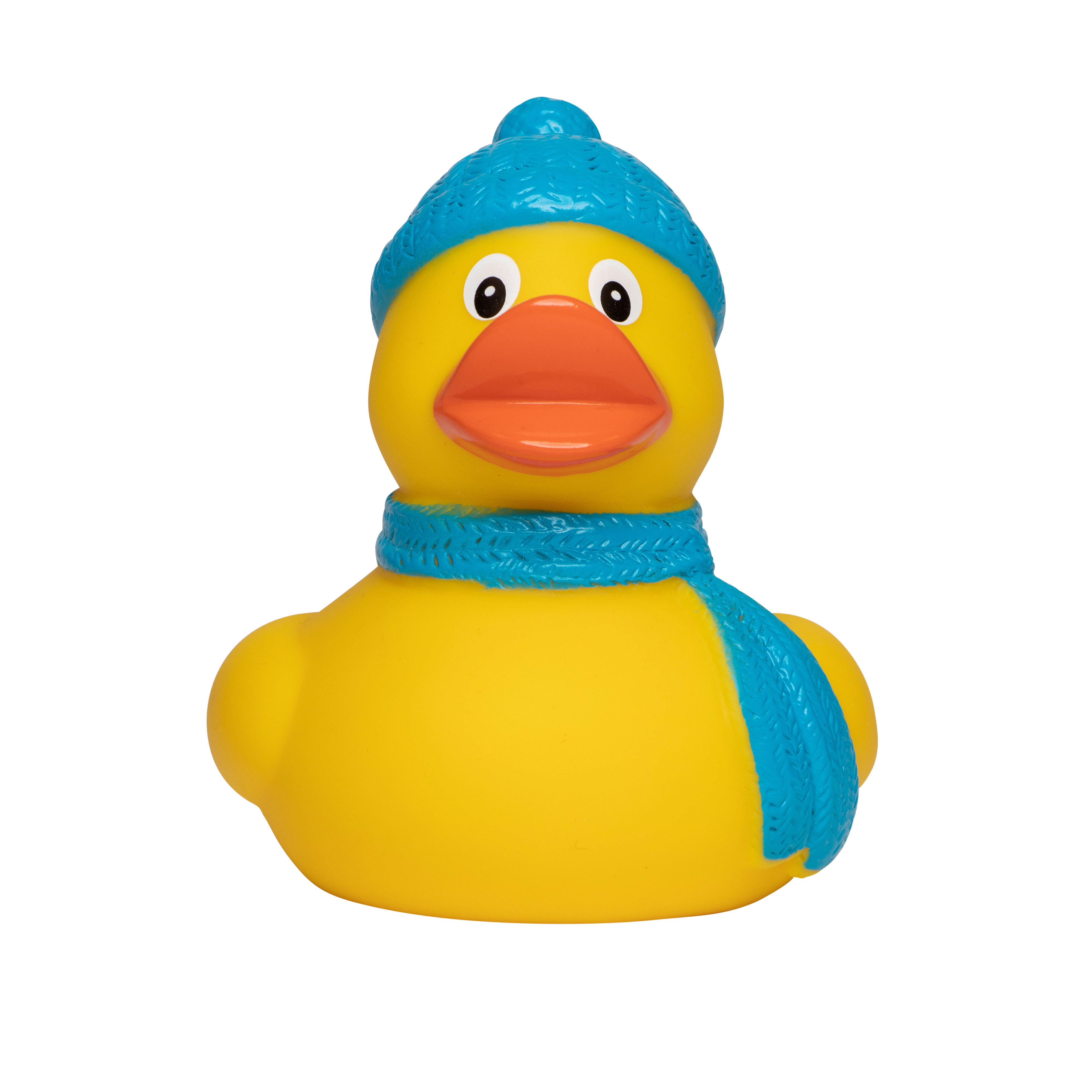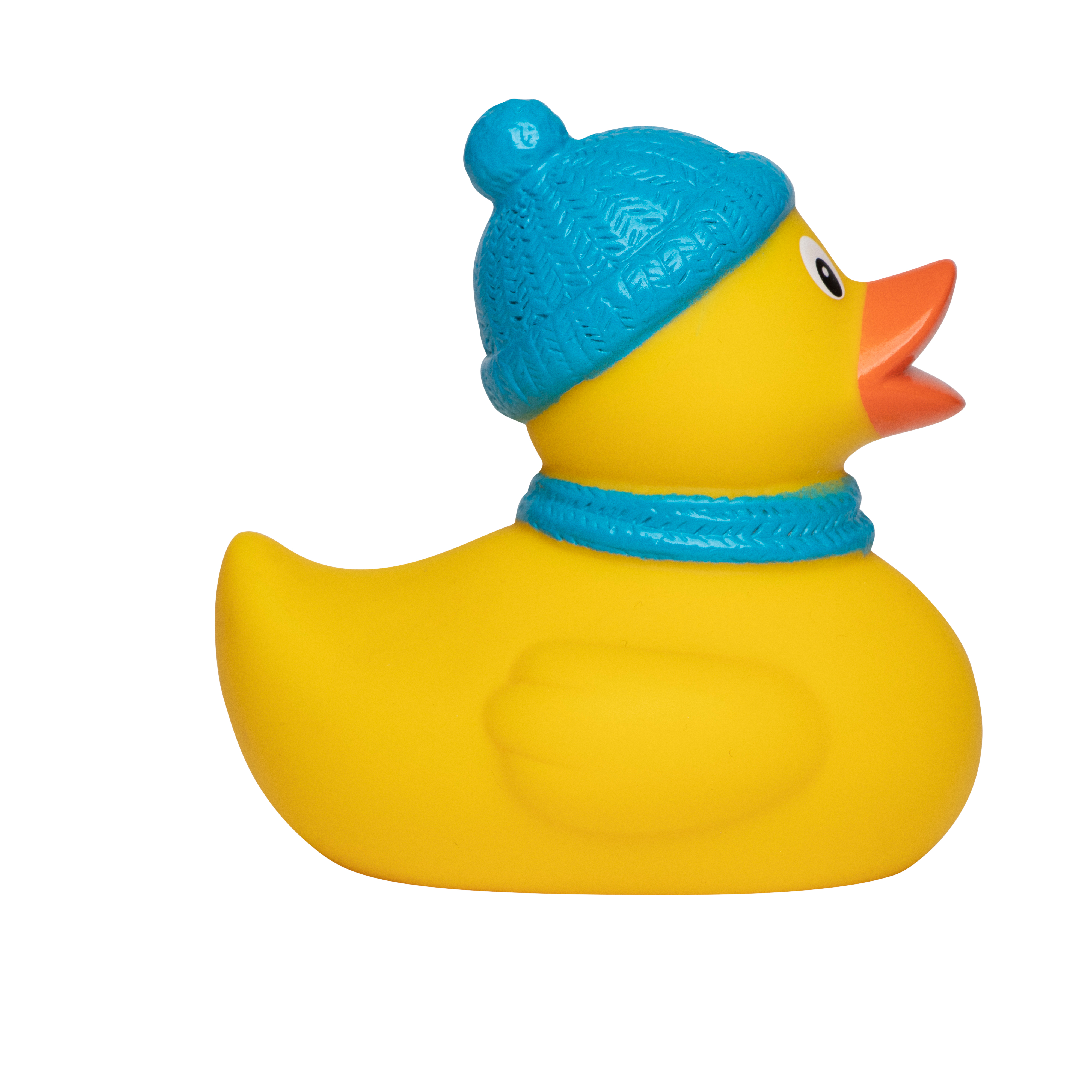 Ein richtiges Winterkind ist das gelbe Schnabeltier mit blauer Mütze und Schal. Die frostigsten Temperaturen können ihm nichts anhaben. Mit bester Laune und einem breiten Lächeln kommt die niedliche Badeente zu Ihnen nach Hause.