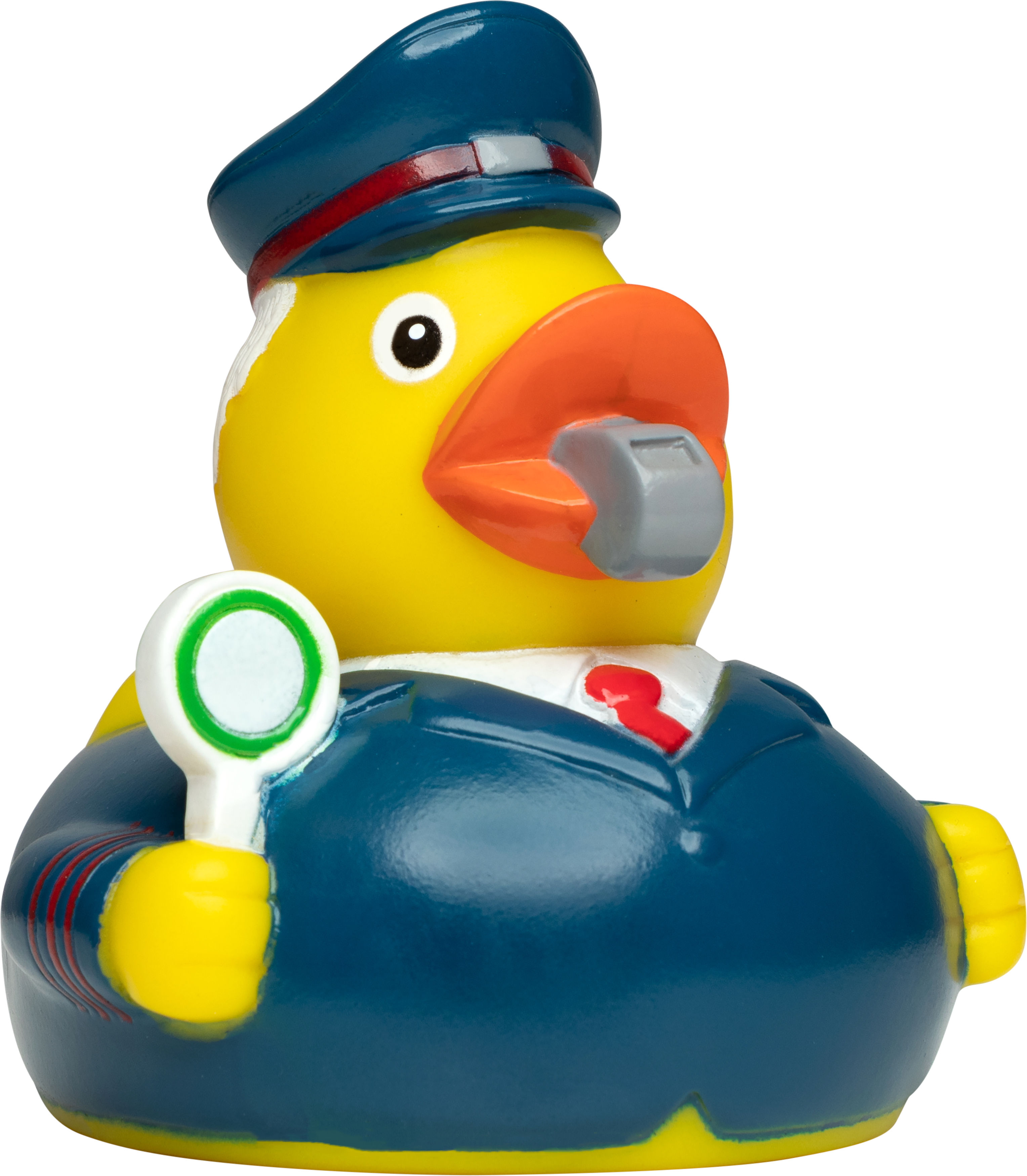 Diese Quietsche-Ente ist ein richtiger Zugvogel, mit allem Drum und Dran, was ein Zugbegleiter so braucht: Uniform, Trillerpfeife und Kelle geben dem charmanten Kerlchen den perfekten Look, um Marken und Botschaften auf den richtigen Weg zu bringen.