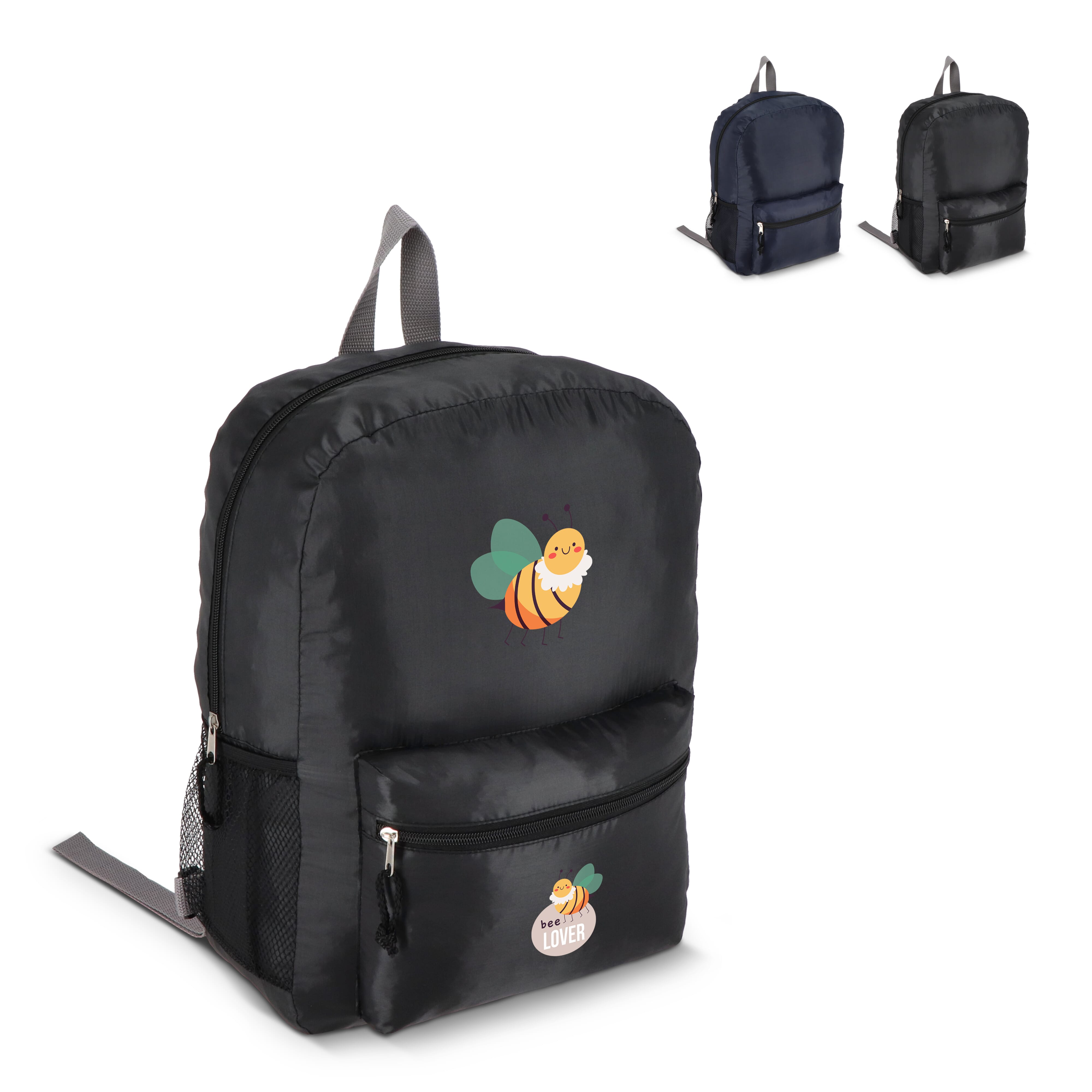 Leichter Rucksack aus recyceltem 190T-PET. Mit Reißverschlusstasche vorne, verstellbaren Schultergurten und einer seitlichen Netztasche für eine Flasche, einen Regenschirm oder andere wichtige Utensilien. Lässt sich klein zusammenfalten – ideal für Tagesausflüge auf Reisen.
