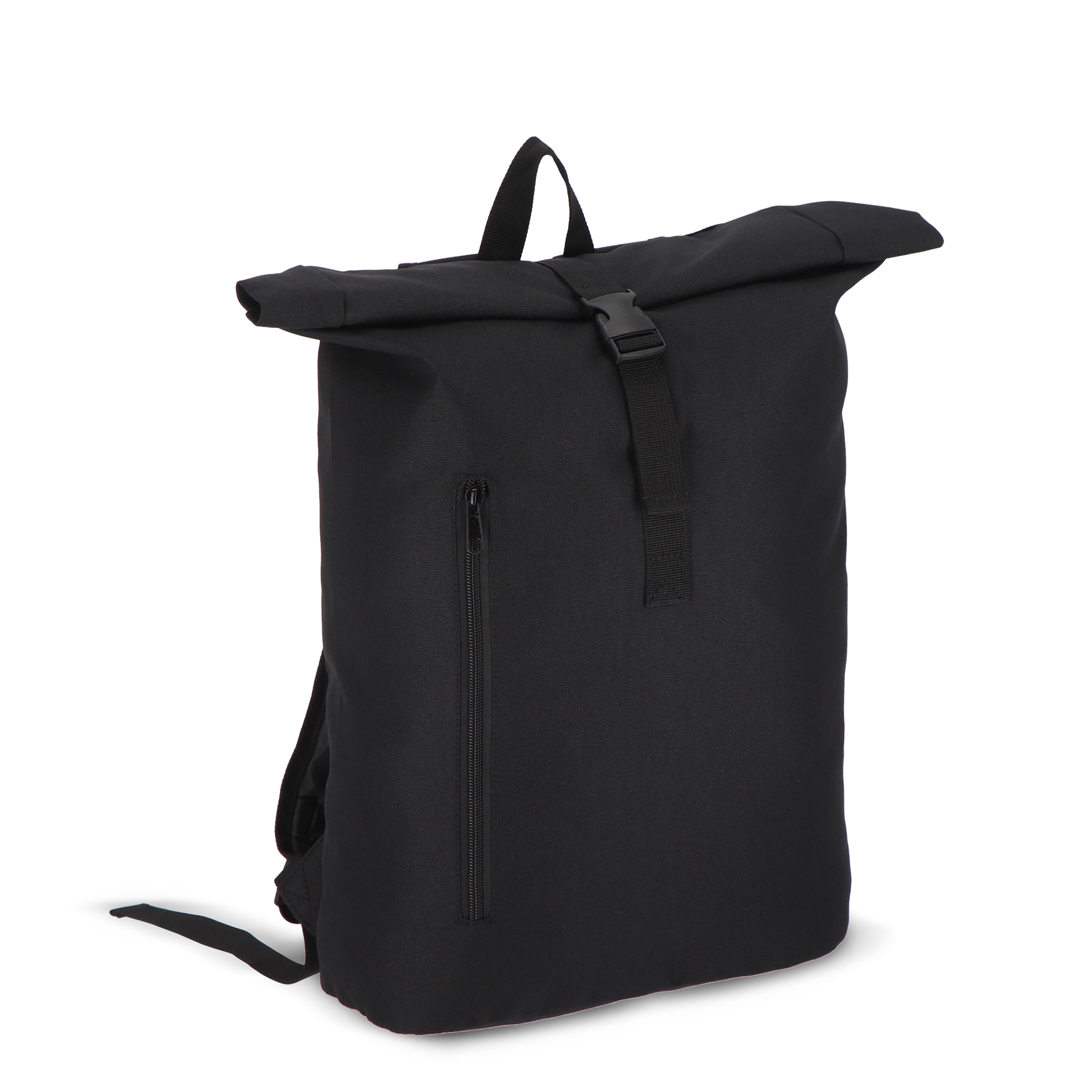 Dieser praktische Rucksack im trendigen Rolltop-Design ist aus recyceltem PET gefertigt. Er verfügt über verstellbare, gepolsterte Schultergurte, einen Griff an der Oberseite und eine Reißverschlusstasche auf der Vorderseite, die sich ideal für kleinere Utensilien eignet.