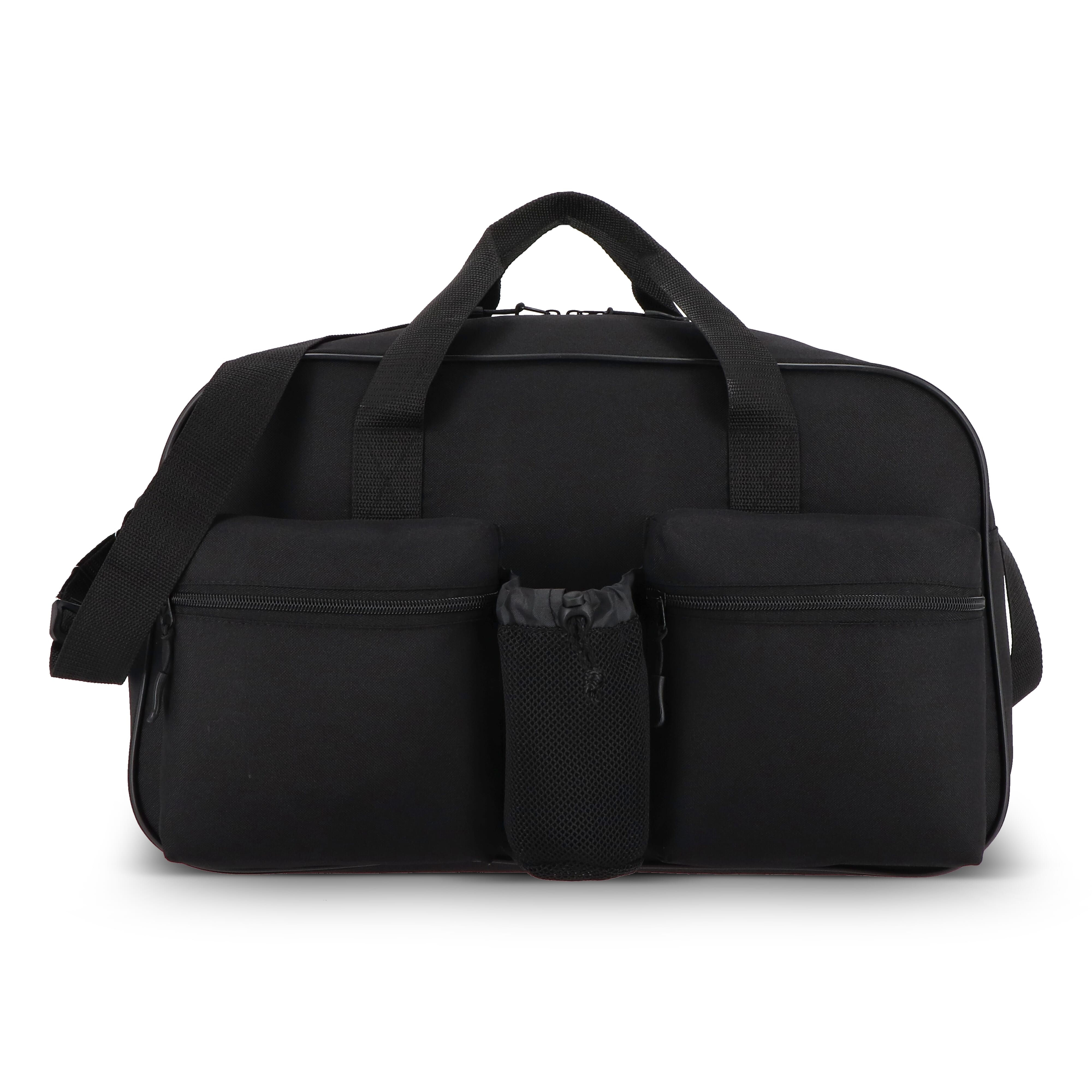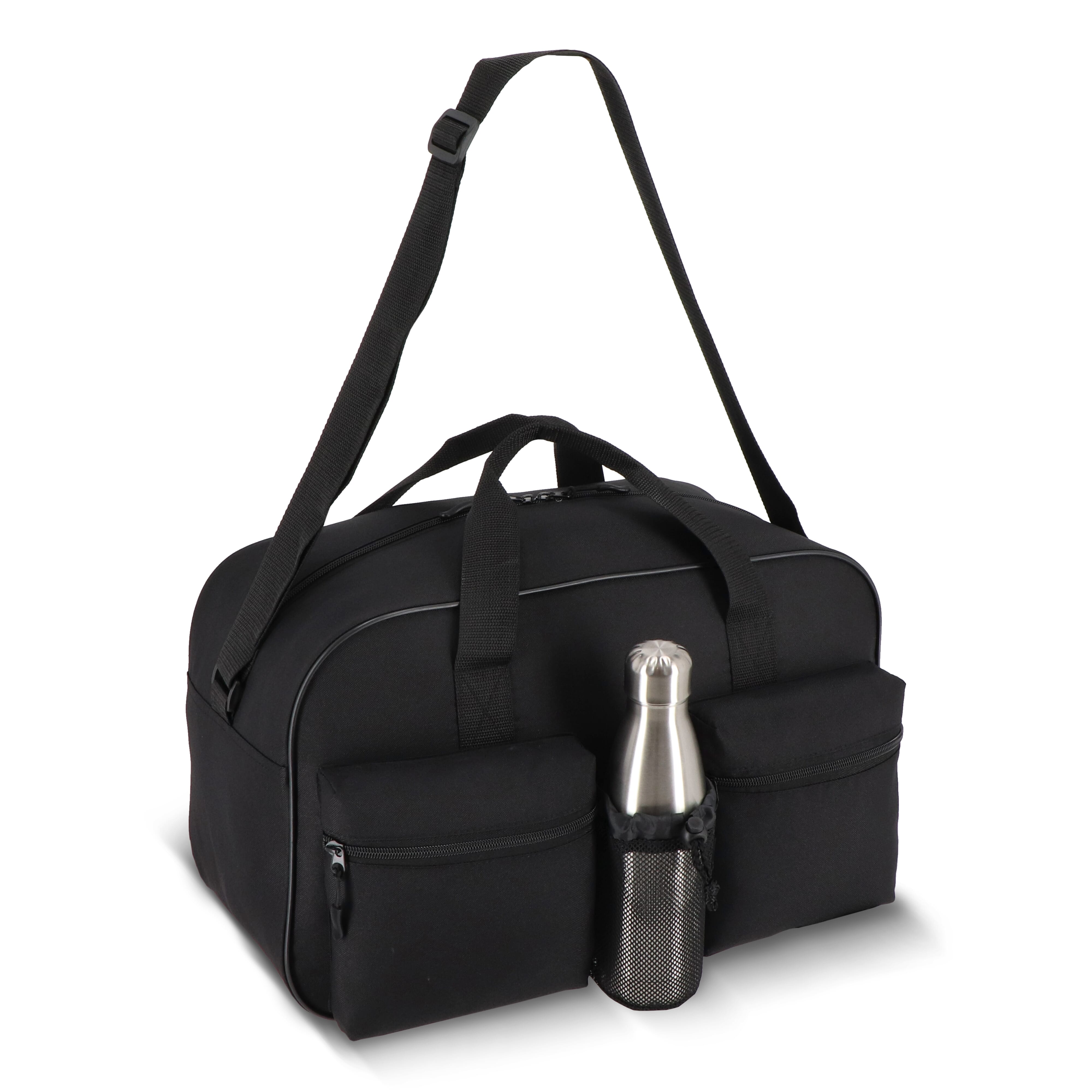 Robuste Sport- und Reisetasche aus recyceltem 600D-PET mit Tragegriff, verstellbarem Schultergurt, zwei Frontfächern mit Reißverschluss für einfachen Zugriff auf wichtige Utensilien und einer Netzflaschentasche. Der perfekte Begleiter für das Fitnessstudio, bereit für Workouts oder Abenteuer unterwegs.