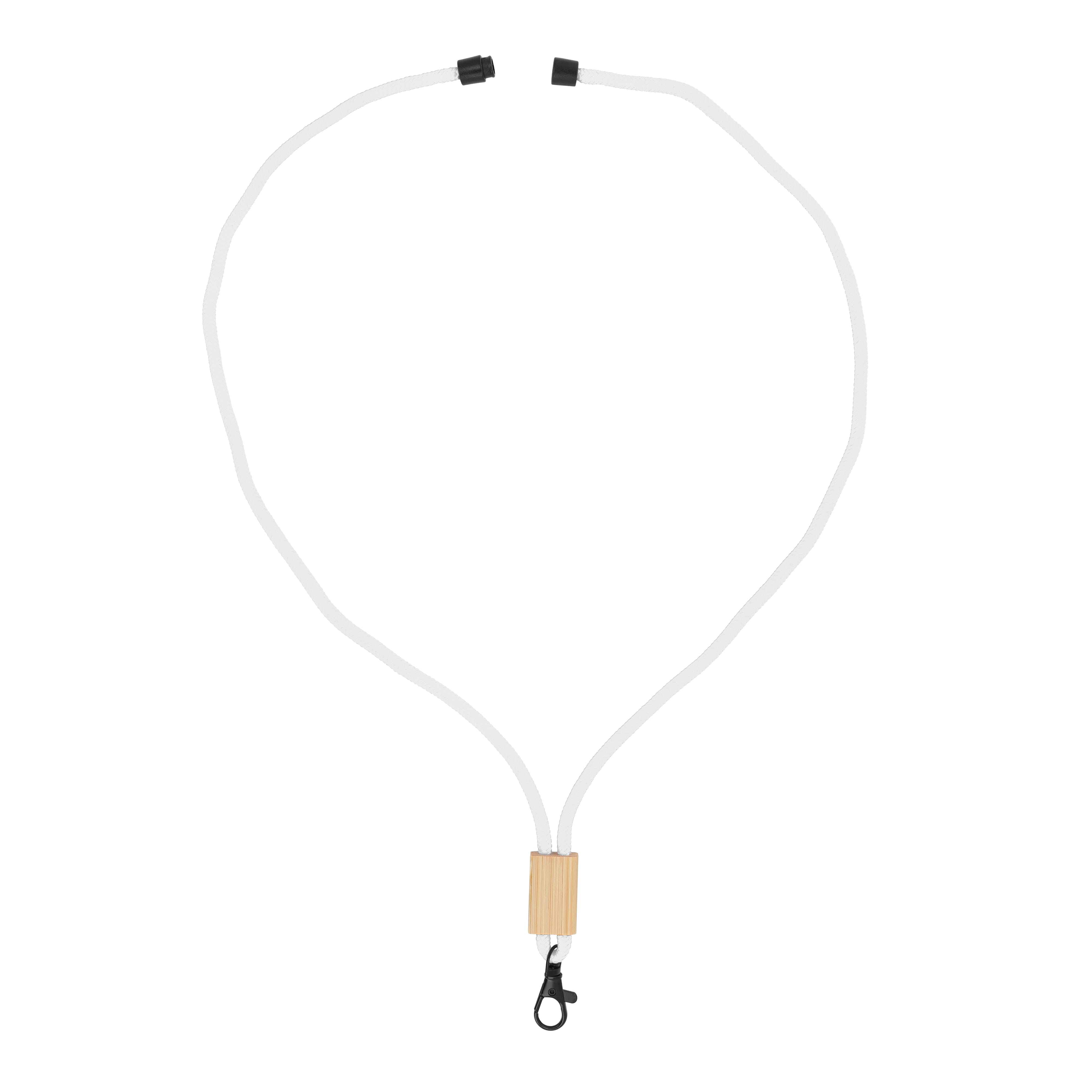 Kordel-Lanyard aus R-PET Paracord mit Kunststoff-Sicherheitsverbindung und schwarzem Karabiner und Panikverschluss. Das Schlüsselband ist mit einem Bambusschieber verstellbar, der viel Platz für das Branding bietet.
