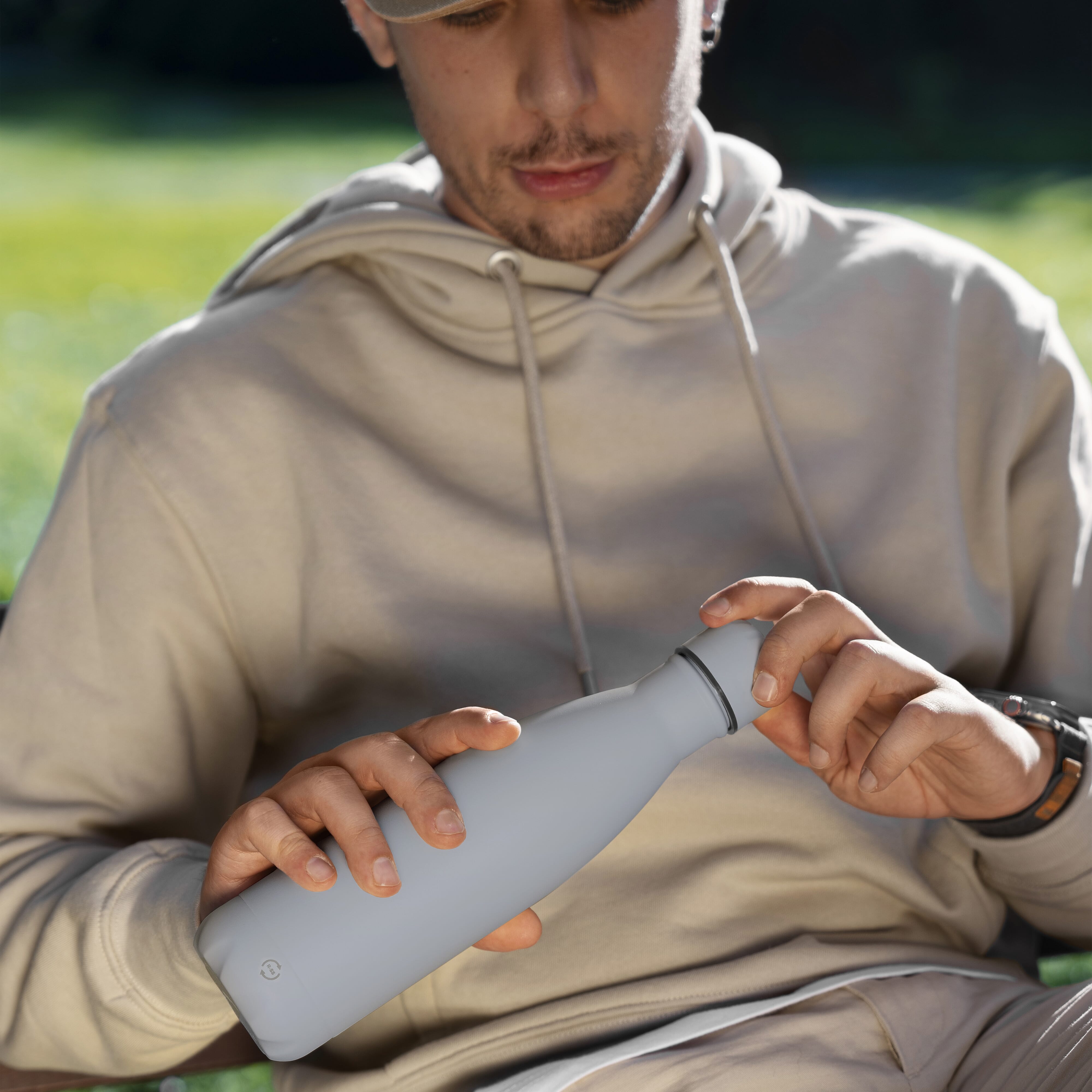 Unsere beliebte Swing-Flasche ist jetzt aus recyceltem Edelstahl und mit einer samtweichen Soft-touch Oberfläche erhältlich. Die doppelwandige, vakuumisolierte Flasche hält Getränke über einen längeren Zeitraum kalt oder warm und ist auslaufsicher für den Gebrauch unterwegs.