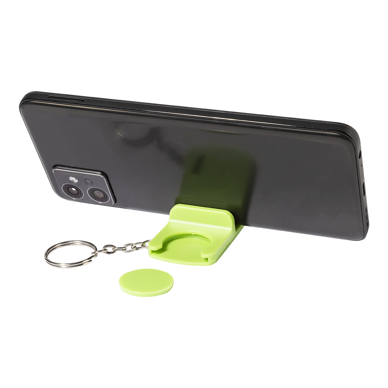 EKW-Chip aus recyceltem ABS mit Handyhalterfunktion und Schlüsselanhänger. Chipgröße: ø23×2 mm.