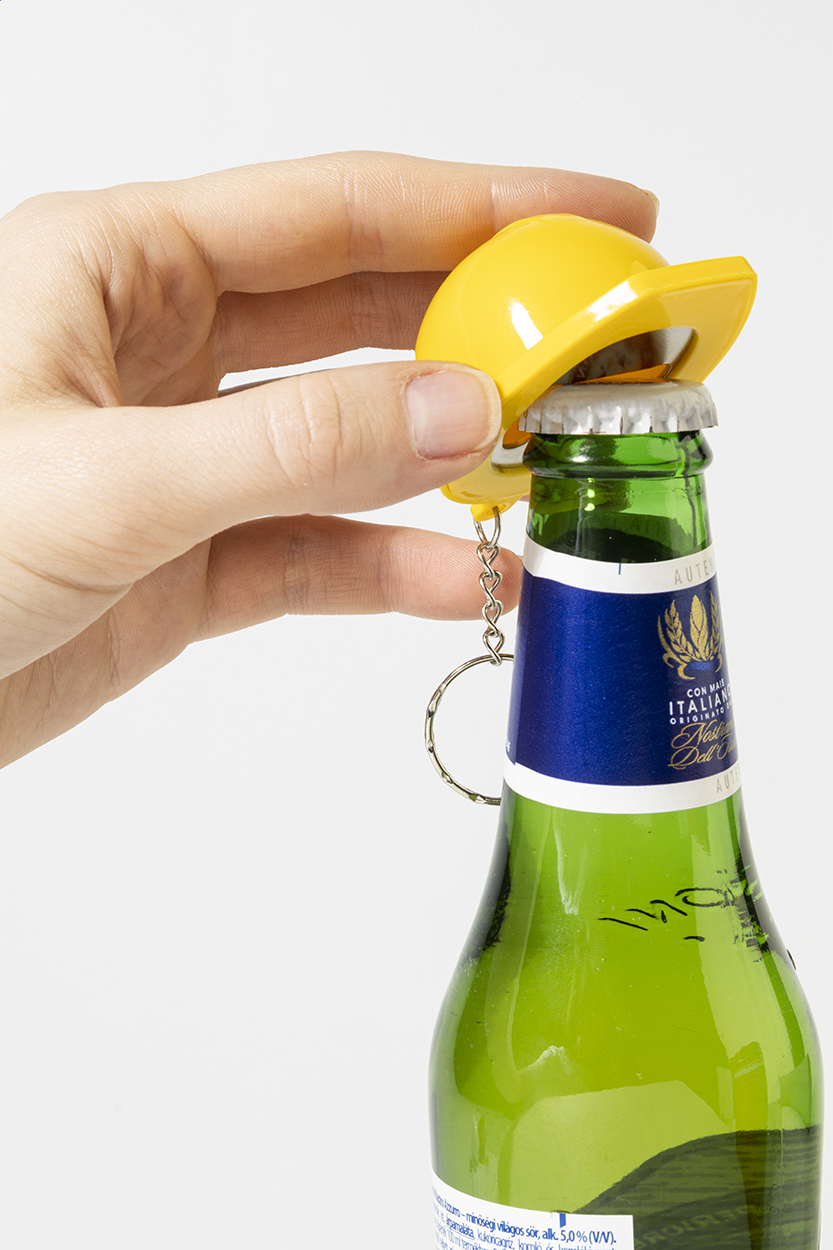 Schlüsselanhänger in Form eines Sicherheitshelmes aus recyceltem ABS mit integriertem Flaschenöffner.