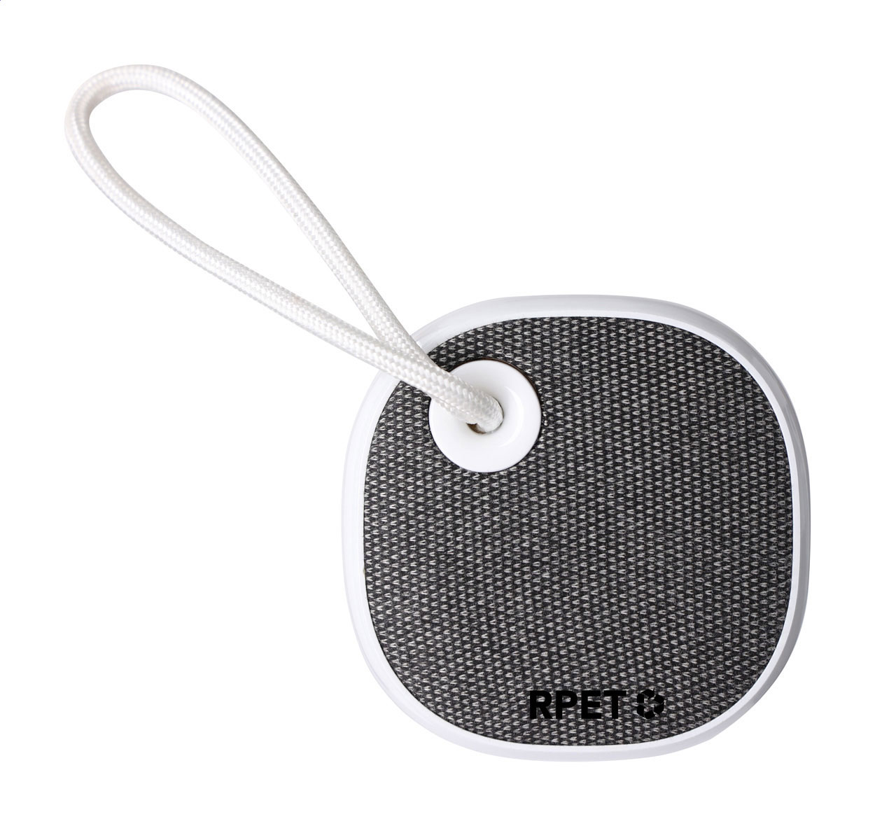 Kabelloser Lautsprecher aus recyceltem ABS-Kunststoff mit einer Seite aus RPET-Polyester, integriertem Solarladegerät, Tragegurt und wiederaufladbarem Akku (300 mAh). Inklusive USB-Ladekabel.