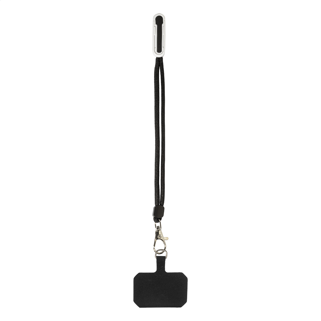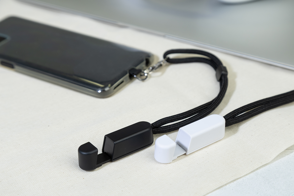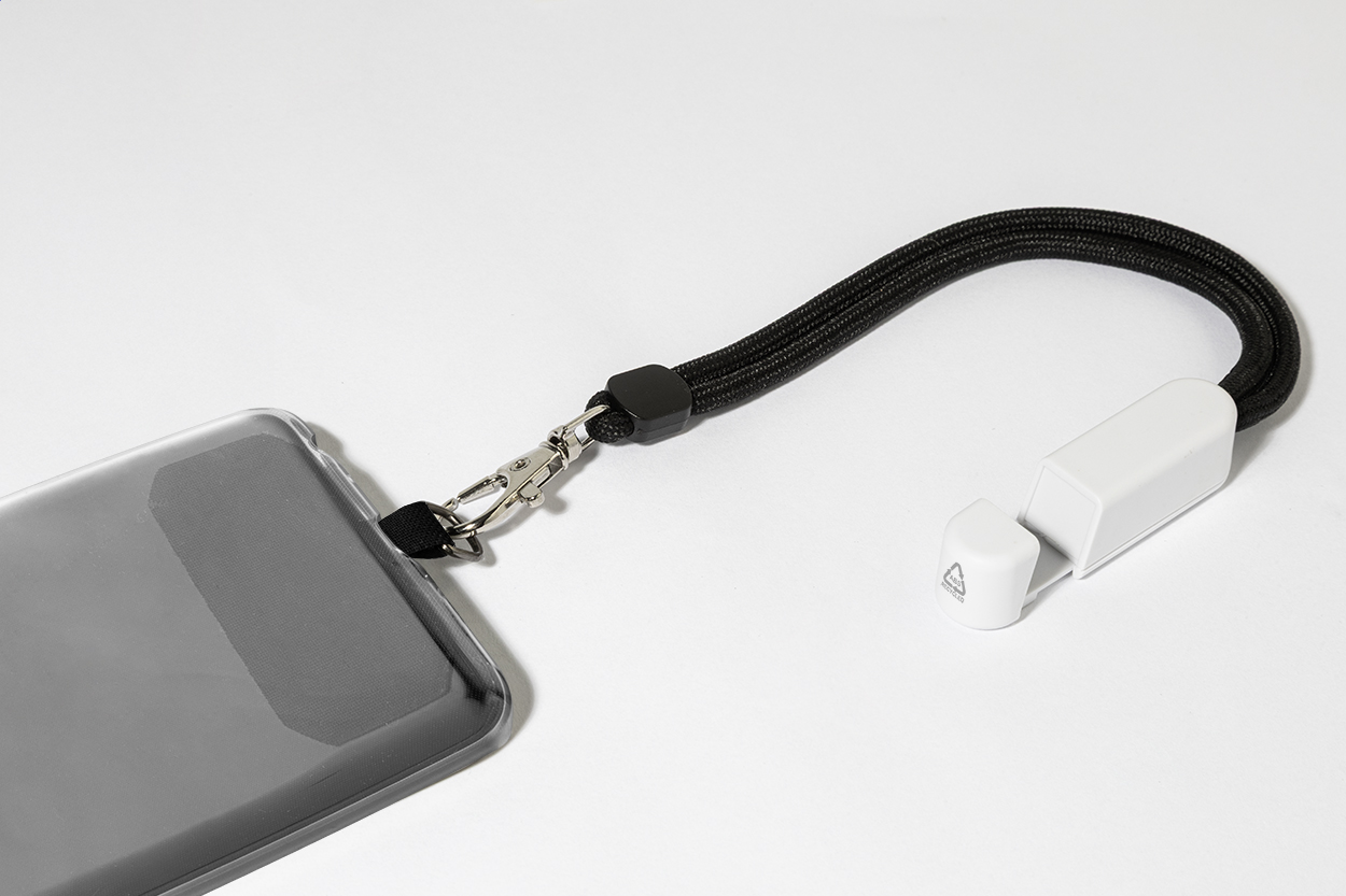 RPET-Handyhalter-Handgelenkschlaufe mit Tischhandyständer aus recyceltem ABS.