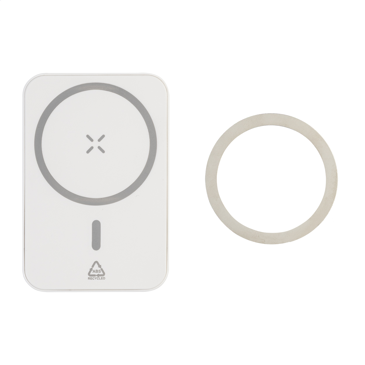 Powerbank aus recyceltem ABS mit 5000 mAh Akku, eigebautem Wireless-Fast-Charger (15W), USB-C Eingangs- und Ladeport. Inkl. selbstklebendem Metallring um die magnetische Funktion bei jeglichem Gerät mit Wireless-Charge-Option zu nutzen. Kompatibel mit iPhone® 12 oder neuer. Inkl. USB-Ladekabel.
