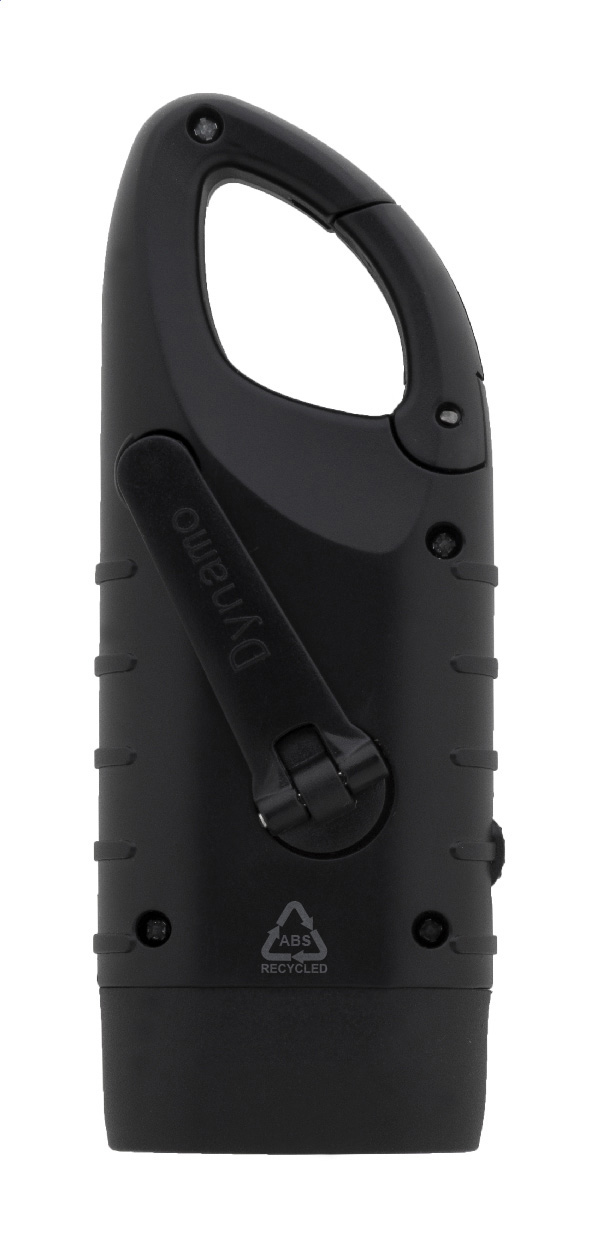 Taschenlampe aus recyceltem ABS mit 3 LEDs, integrierten Solar- und Dynamo-Ladegeräten und Karabinerhaken.