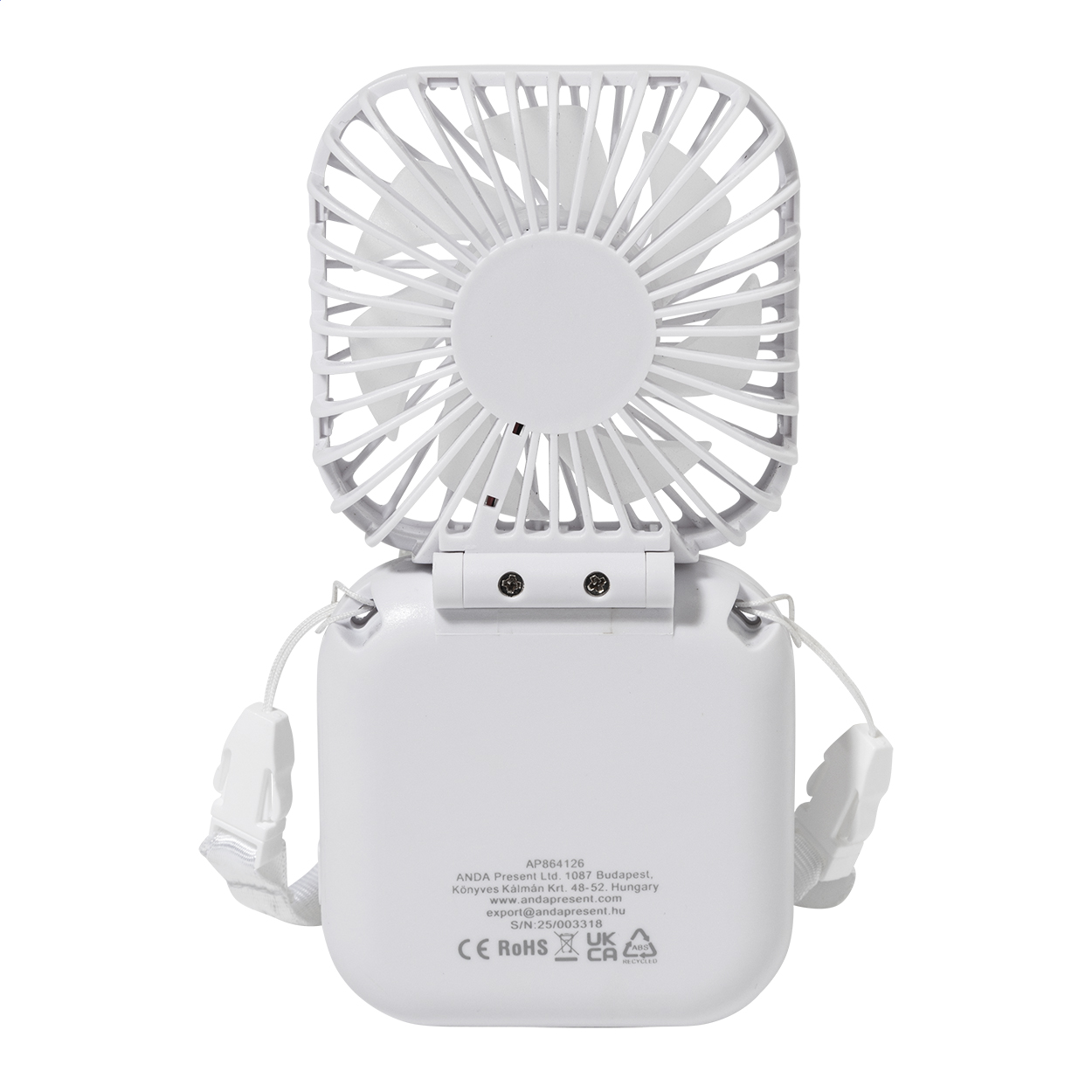 Elektrischer Handventilator aus recyceltem ABS mit Lanyard, eingebautem Akku (500 mAh), verstllbarem Kopfwinkel und 3-stufigem Geschwindigkeitsregler. Inkl. USB-Ladekabel.