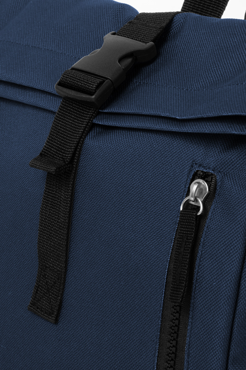 RPET-Rolltop-Rucksack mit Schnallenverschluss, Laptopfach (14") und Reißverschluss-Fronttasche. Mit gepolstertem Rücken und Schultergurten. Material: 600D RPET-Polyester. Mit RPET-Label.