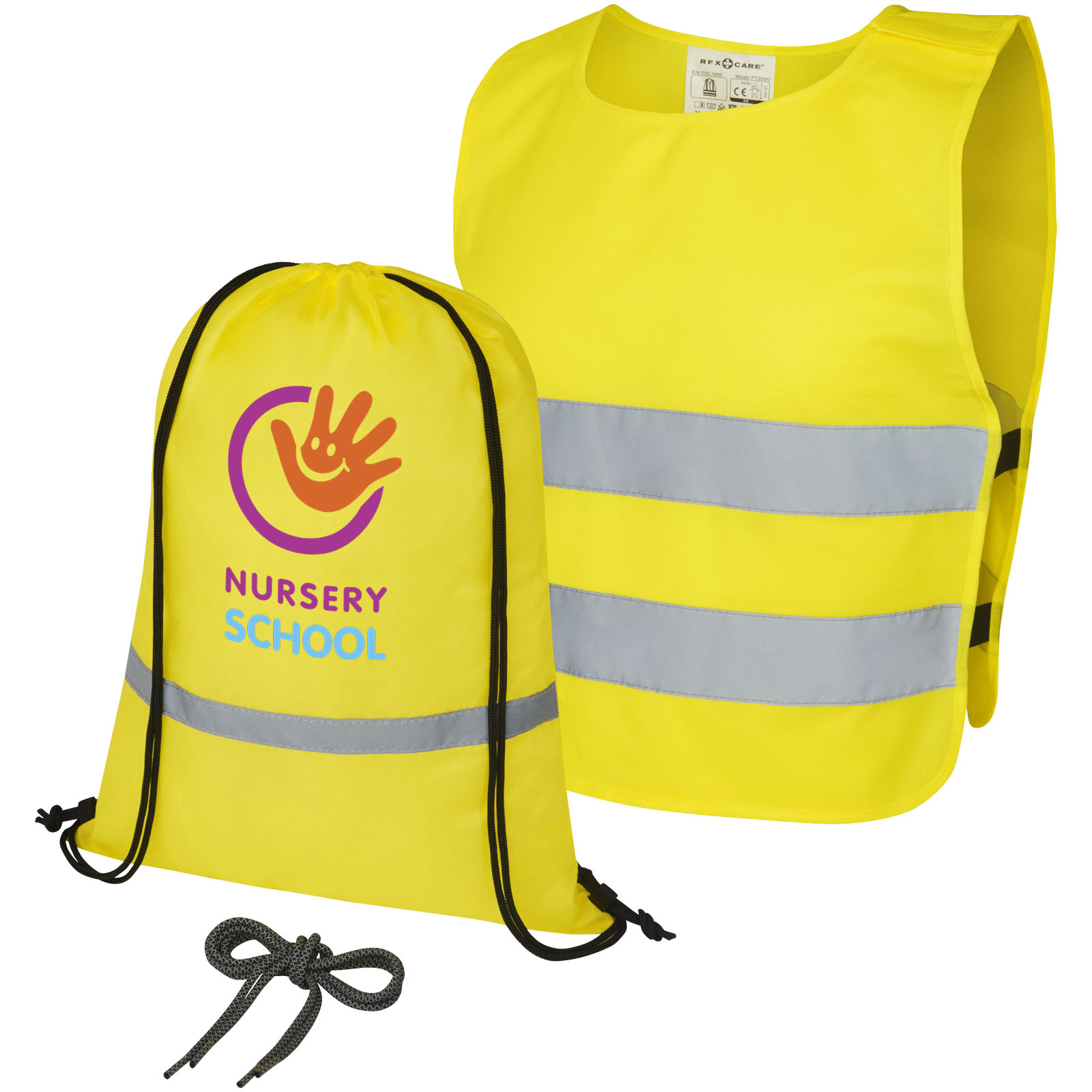 Komplettes Sicherheits- und Sichtbarkeitsset für Kinder im Alter von 7 bis 12 Jahren. Dieses Geschenkset zum Schulanfang enthält einen reflektierenden Sportbeutel mit Kordelzug, eine Sicherheitsweste und ein Paar reflektierender Schnürsenkel. Der reflektierende Rucksack hat ein großes Fach mit Kordelzugverschluss und ist nach EN 1150:1999 geprüft und zertifiziert. Warnweste in Größe XS für Kinder von 7-12 Jahren mit einer Körpergröße zwischen 104-121 cm. Große Werbeanbringungsfläche auf der Vorder- und Rückseite der Weste. An der Schulter und den unteren Elastikbändern befinden sich Klettverschlüsse, die zusätzliche Sicherheit bieten und das Anziehen der Weste erleichtern. Die Elastikbänder auf der anderen Seite machen sie dehnbar und ermöglichen ein einfaches Tragen über dicken Jacken. Die Weste ist nach EN 1150:1999 geprüft und zertifiziert. Sie entspricht auch den PSA-Richtlinien zur Anwendung der Verordnung (EU) 2016/425 über persönliche Schutzausrüstungen Kategorie II. Die reflektierenden Schnürsenkel sind 80 cm lang und haben auf beiden Seiten stabile Enden, die sich leicht in alle Schuhösen einführen lassen.