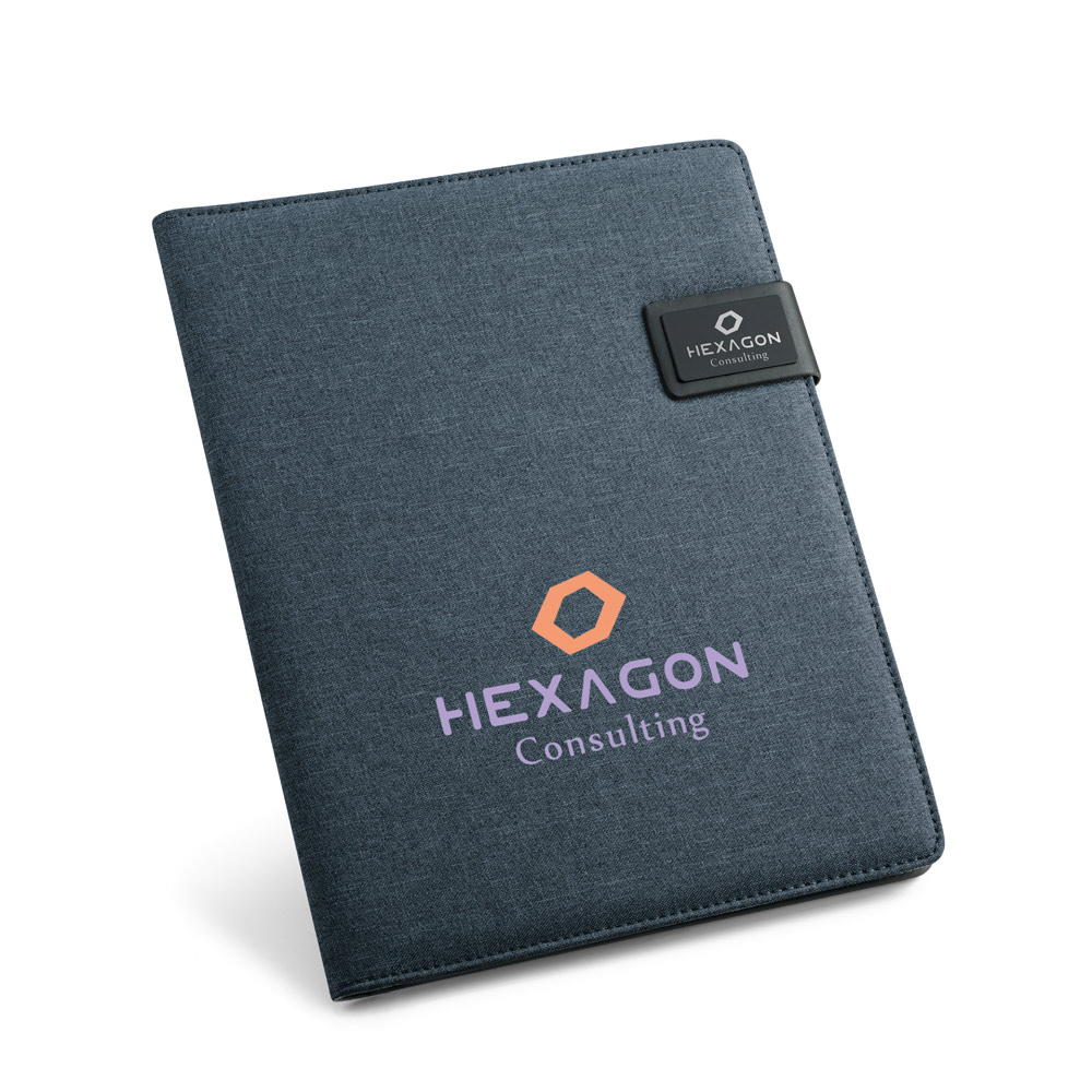 Schreibmappe A4 aus Leinenimitation und PU mit Magnetverschluss, einem Smartphone- und Kartenfach. Die Mappe hat ein veredelbares Metallplättchen mit gummierter Oberfläche und ein Notizblock mit 40 linierten Seiten. Kugelschreiber und Zubehör nicht enthalten. 233 x 310 x 18 mm | Plättchen: 50 x 30 mm