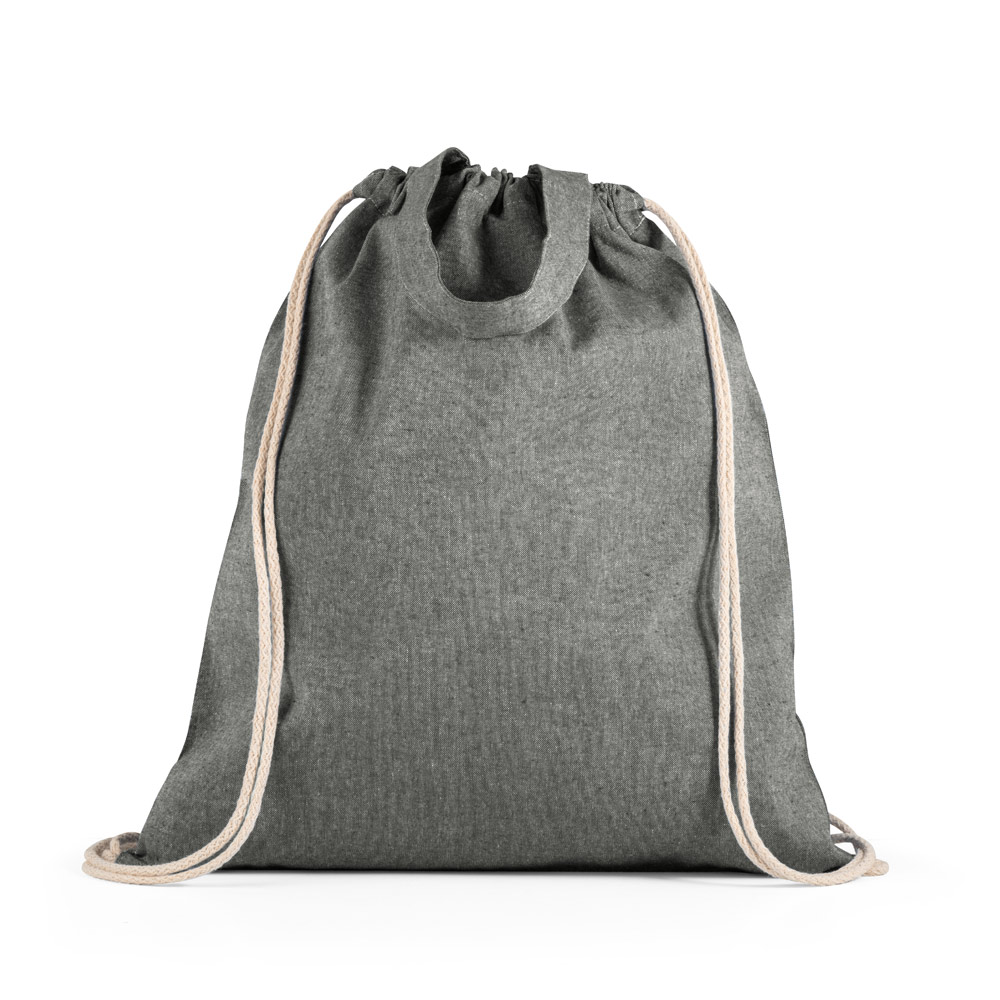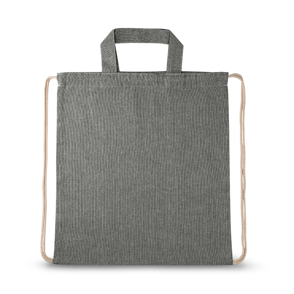 Tragetasche / Turnbeutel (2in1) aus recycelter Baumwolle (70%) und polyester (30% rPET) (140 g / m²) mit 30cm langen Henkeln und Kordeln aus Baumwolle. Recycelte Baumwolle ist ungefärbt. Das Rohmaterial wird in seiner ursprünglichen Form und Farbe verwendet, ohne dass Chemikalien zum Färben oder Bleichen eingesetzt werden, was zu einer geringeren Umweltbelastung beiträgt. 370 x 410 mm