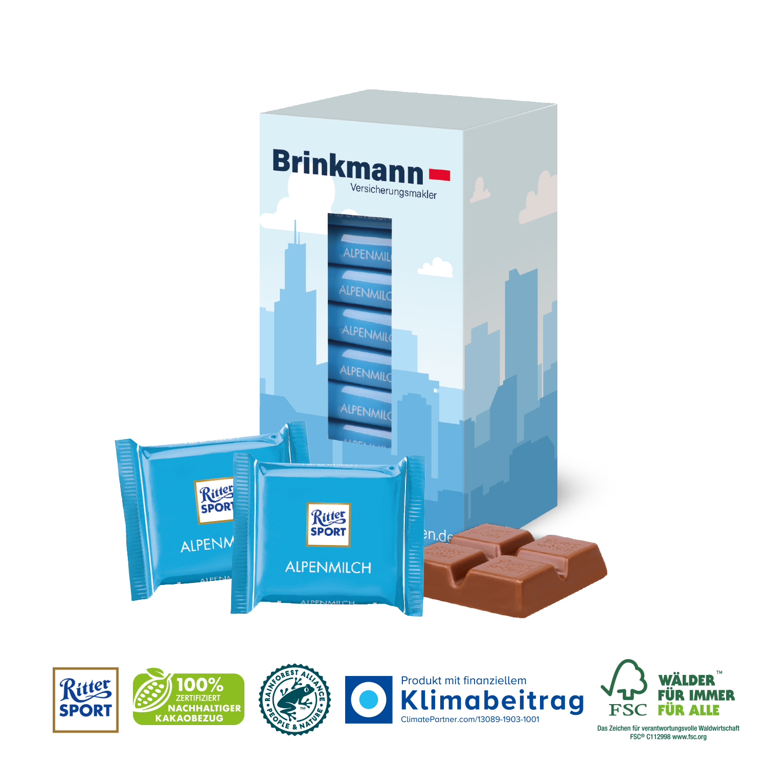 Mehr ist einfach mehr! Die köstlichen Varianten von Ritter SPORT "Mini" sorgen für maximalen Genuss! Der "Turm" ist rundum individuell bedruckbar.