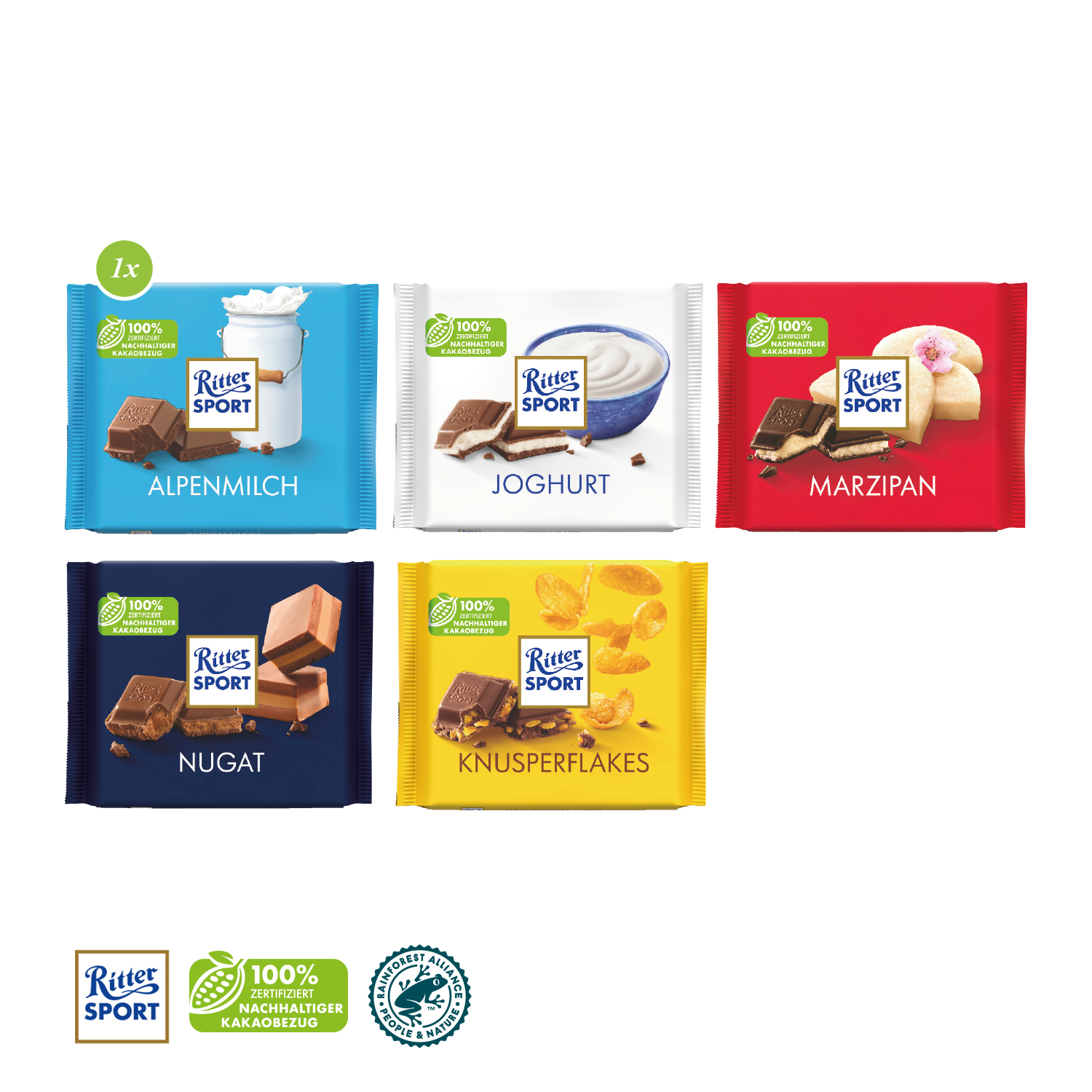 1 Schokoladentafel (100 g) von Ritter SPORT. Geschmacksrichtungen Alpenmilch, Joghurt, Marzipan, Knusperflakes.