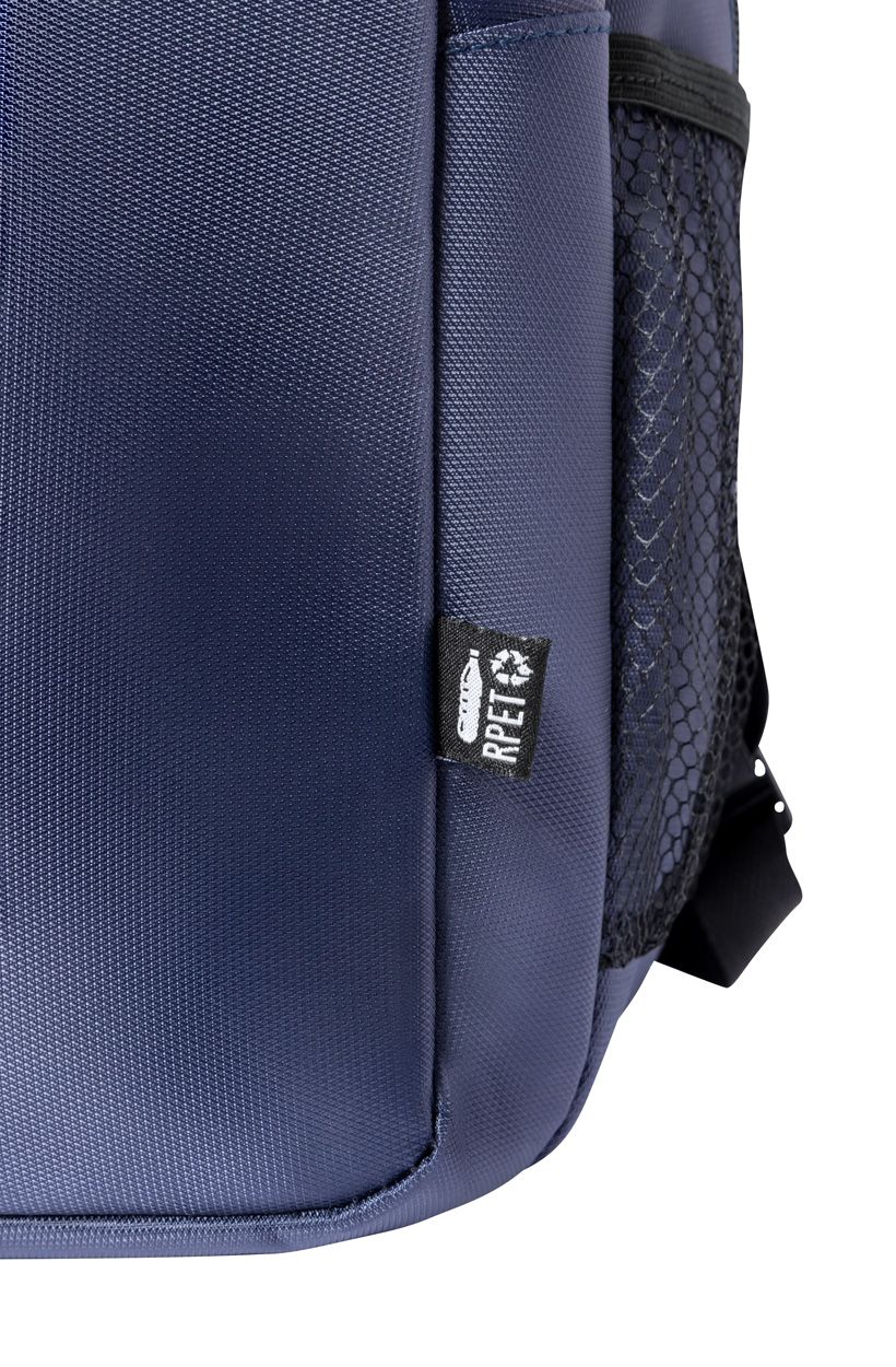 Rucksack aus RNYLON mit Reißverschlussfächern, Netz-Seitenfächern, gepolstertem Laptopfach (15"), Trolleygurt, gepolstertem Rücken und Schultergurten. Material: 420D Recyceltes Nylon mit RNYLON-Label.