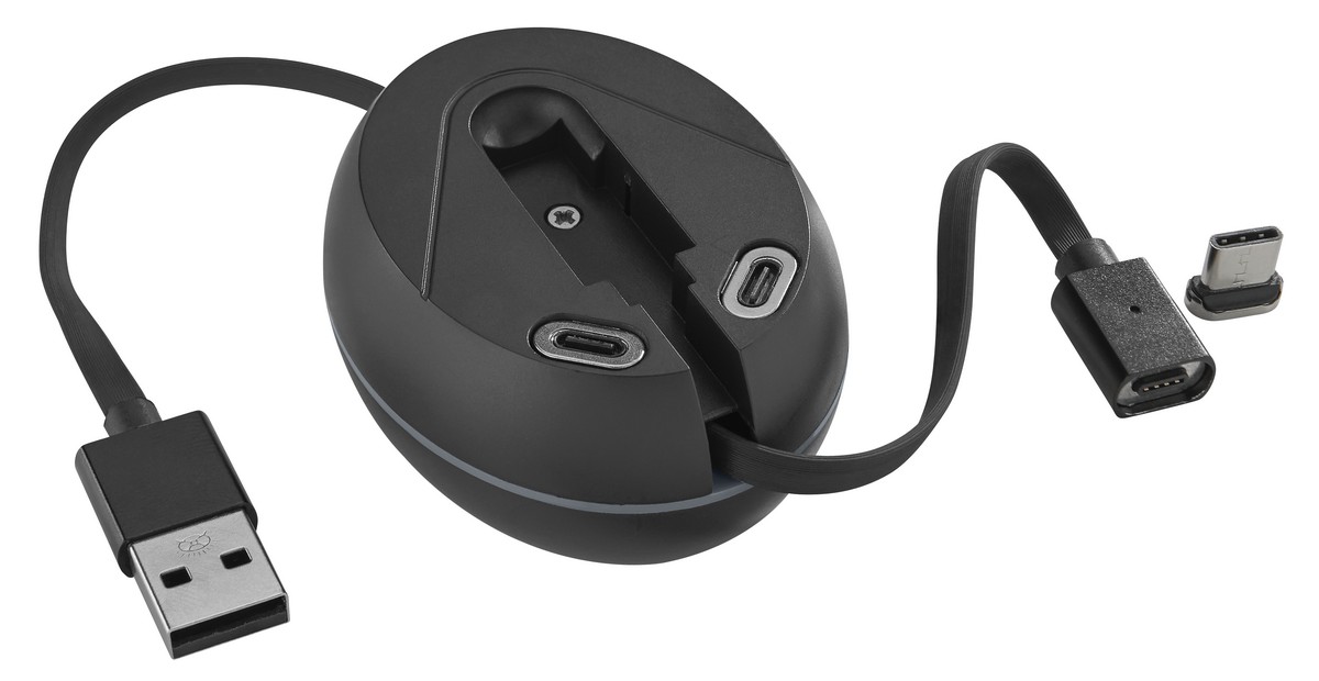 Eine die alles kann! Die praktische Kabel-Box mit ausziehbarem, selbstaufrollendem Multifunktionskabel. Ermöglicht Schnellladen (Quickcharge) mit bis zu 3A und Datenübertragung für alle gängigen Endgeräte. Die magnetischen Anschlüsse (Micro-USB, Typ C und Lightning) sind als Pins griffbereit im Gehäuse platziert, können aber auch in der Ladebuchse Ihres Gerätes verbleiben und werden bei Gebrauch einfach an den Kopf des Kabels angedockt. Laden mit bis zu 3A, Datenübertragung. Kabellänge ausgezogen 94 cm. Material: ABS, Aluminium Farbe: Schwarz Verpackung: Einzelverpackung Maße: 63 x 50 x 27 mm Gewicht: 45 g Werbeanbringung: Auf dem USB-A Stecker, 8 x 10 mm (D2, L2); Auf dem Körper 20 x 8 mm (D2) Universell, kompakt und dieses Produkt unterstützt aktiv den Ausgleich der entstehenden CO2-Emissionen durch zertifizierte Klimaschutzprojekte.