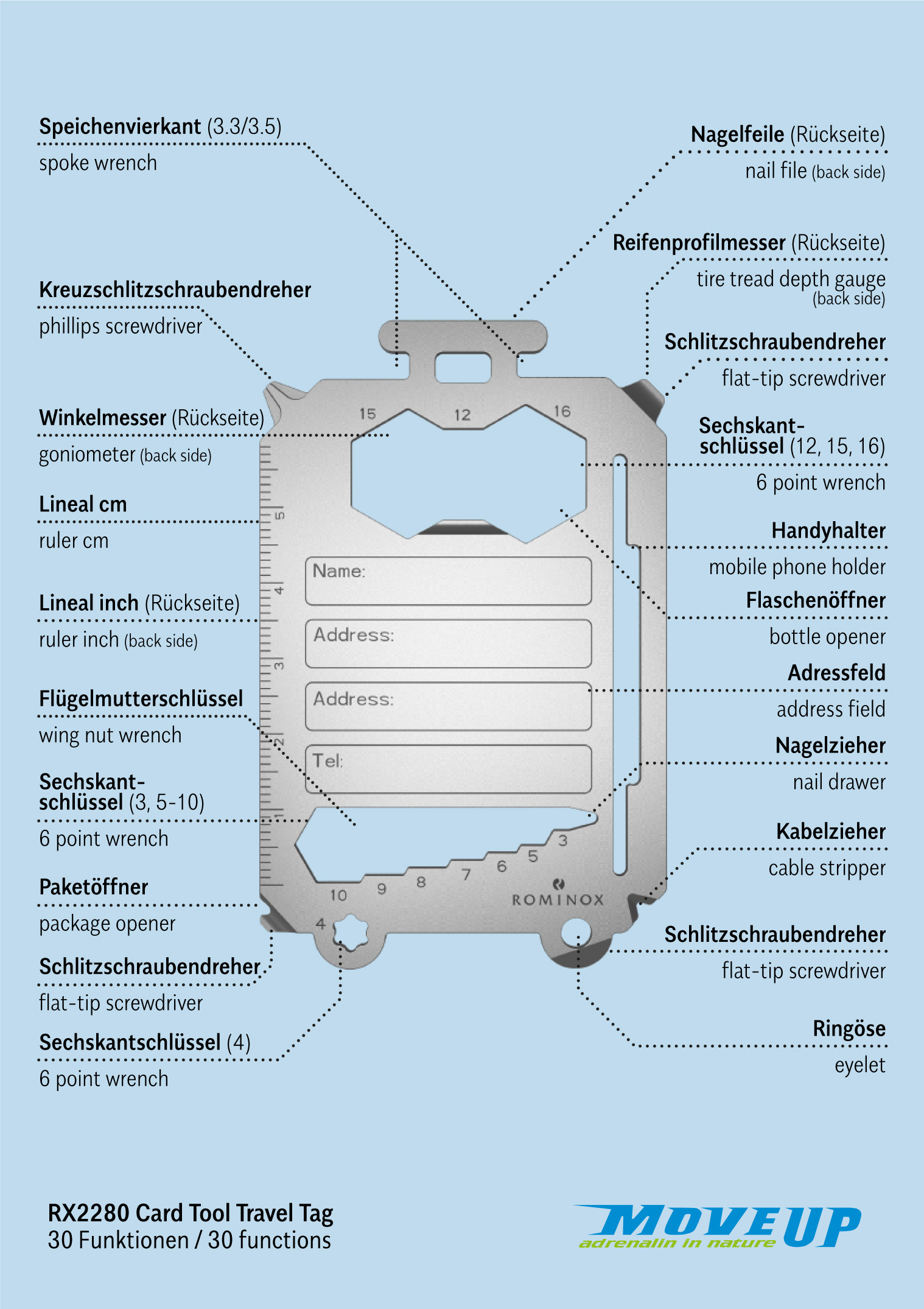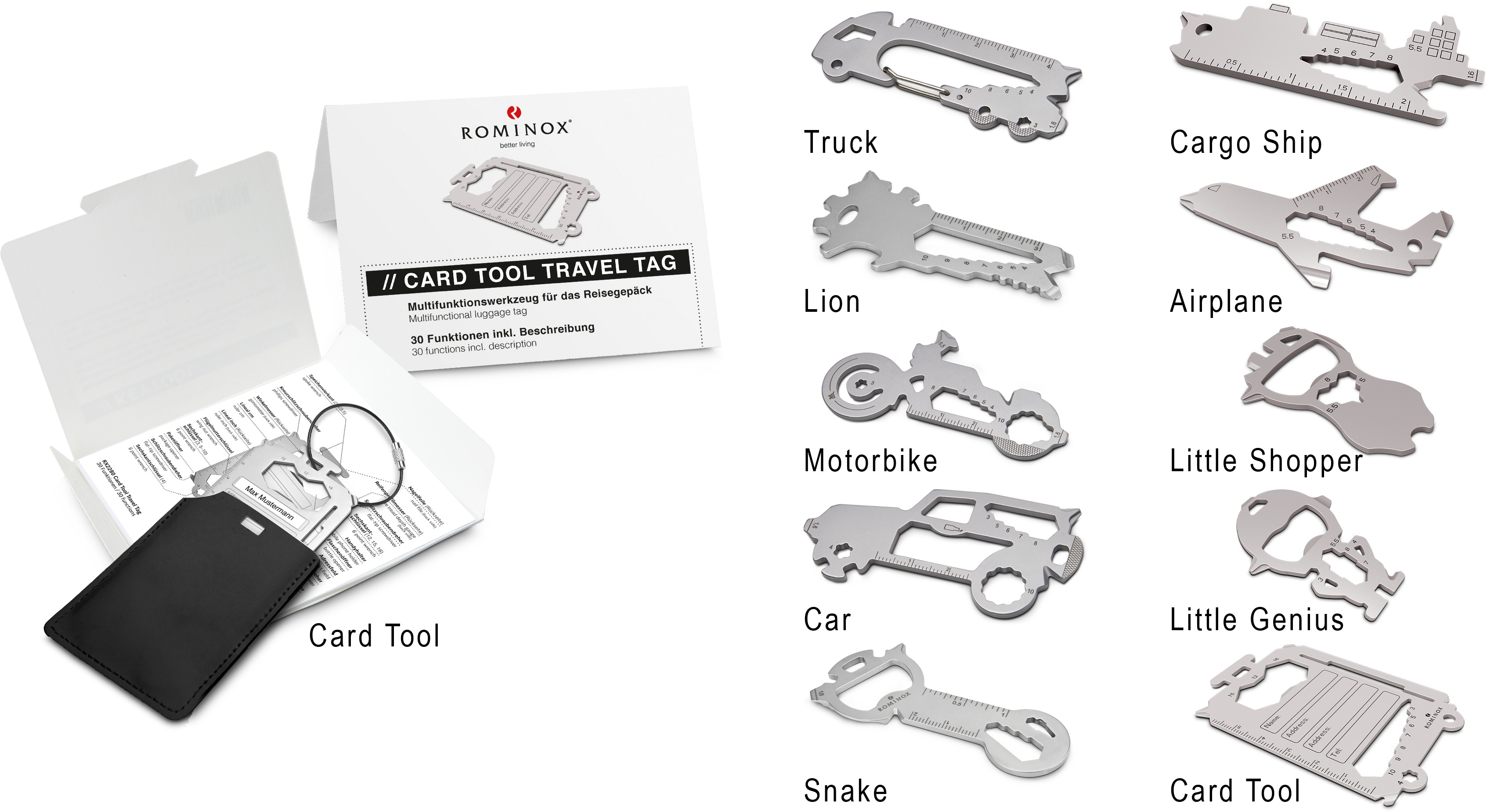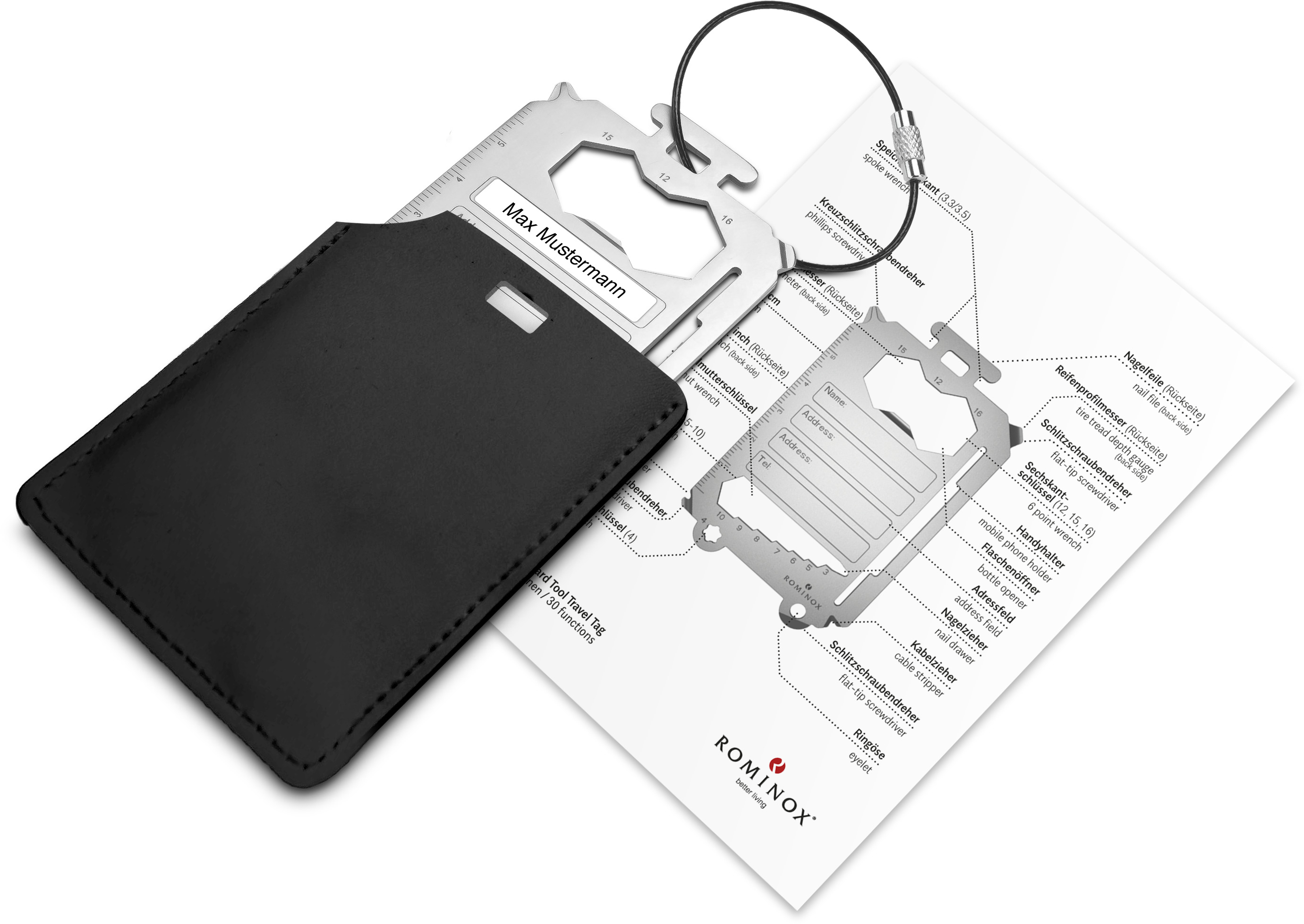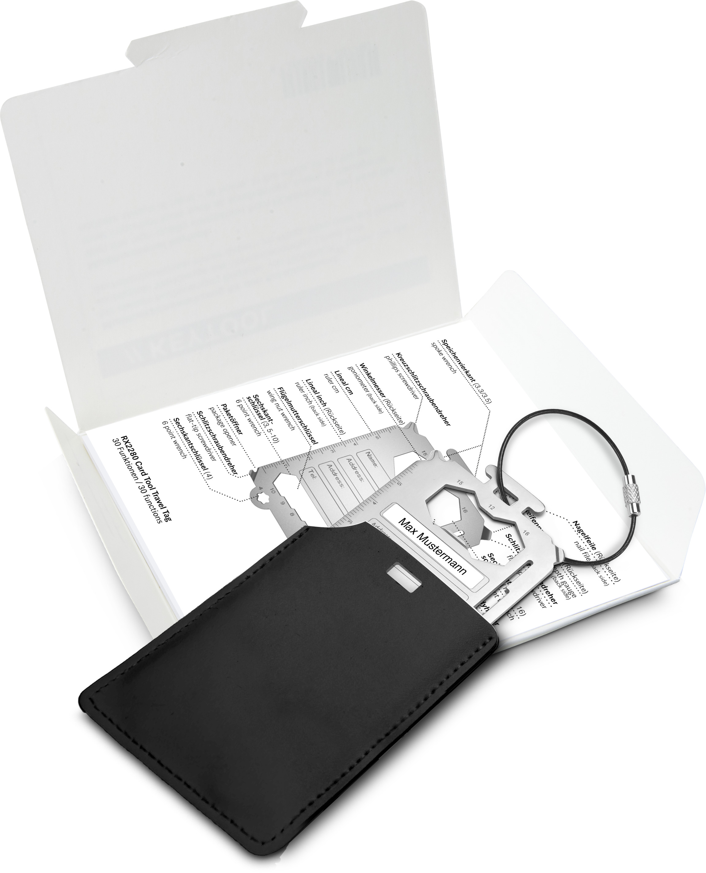 Praktischer Reisebegleiter im Kreditkartenformat: Reisegepäckanhänger mit 30 (Werkzeug-)Funktionen, inkl. hochwertigem Etui zum Schutz der Adressdaten, inkl. gummiertem Stahlband, große Veredelungsfläche für Doming oder Gravur, flexible Beschriftung durch mitgelieferte Aufkleber, kundenindividuelle Verpackung und Funktionsbeschreibung ab 100 Stück möglich. (Werkzeugstahl, PU). Kofferanhänger mit 30 Funktionen: 11 Sechskantschlüssel, 2 Speichenvierkant, 3 Schlitzschraubendreher, 1 Nagelzieher, 1 Kreuzschlitzschraubendreher, 1 Kabelzieher, 1 Flaschenöffner, 1 Zentimeter Lineal, 1 Inch Lineal, 1 Reifenprofilmesser (1,6 mm), 1 Nagelfeile, 1 Flügelmutterschlüssel, 1 Ringöse, 1 Paketöffner, 1 Winkelmesser, 1 Handyhalter, 1 Adressfeld - ab 3.000 Stück auch als Sonderproduktion mit individueller Key Tool Form möglich. Sprechen Sie uns an!