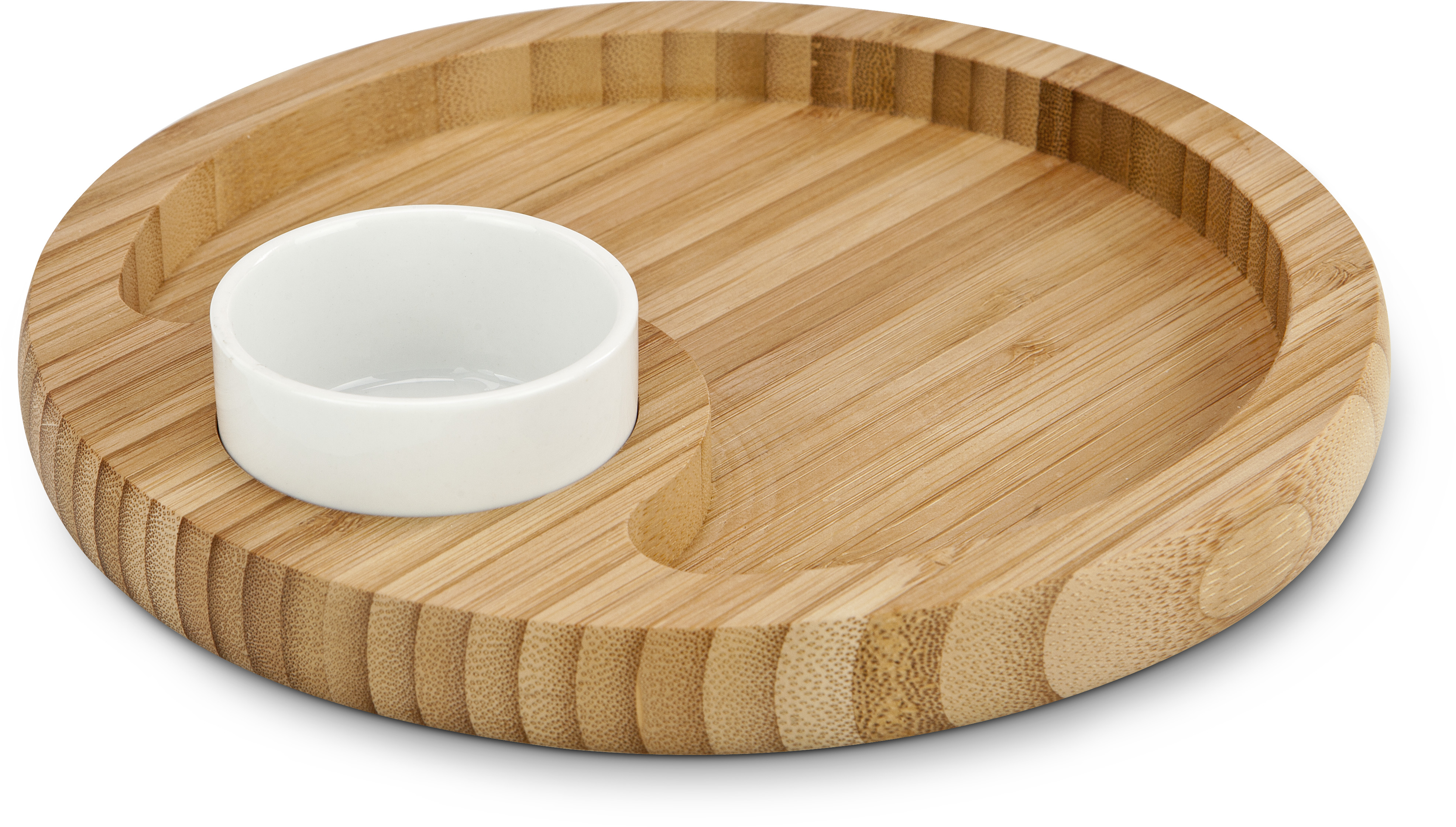 Runde Bambusschale mit asymmetrisch platziertem Keramikschälchen (ca. Ø 5,7 x 2,9 cm), stilvolle Form- und Materialkombination zum ästhetischen Servieren von Snacks und Dips (Bambus, Keramik)