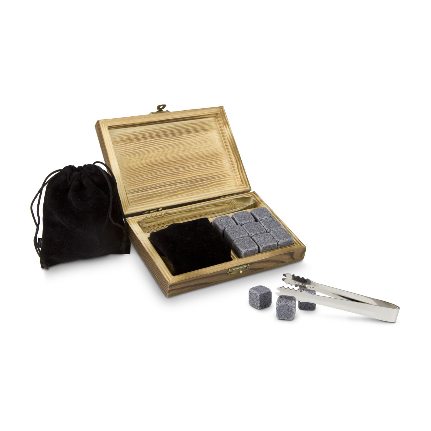 Praktisches Set bestehend aus 9 wiederverwendbaren Eiswürfel-Steinen aus Granit, ideal zum Kühlen von alkoholischen oder antialkoholischen Getränken ohne sie zu verwässern, inkl. Samtbeutel zur praktischen Aufbewahrung im Eisfach und handlicher Edelstahl-Eiszange mit gezackter Greiffläche, stilvolle Aufbewahrungskiste aus Holz (Granit, Holz, Edelstahl, Samt)