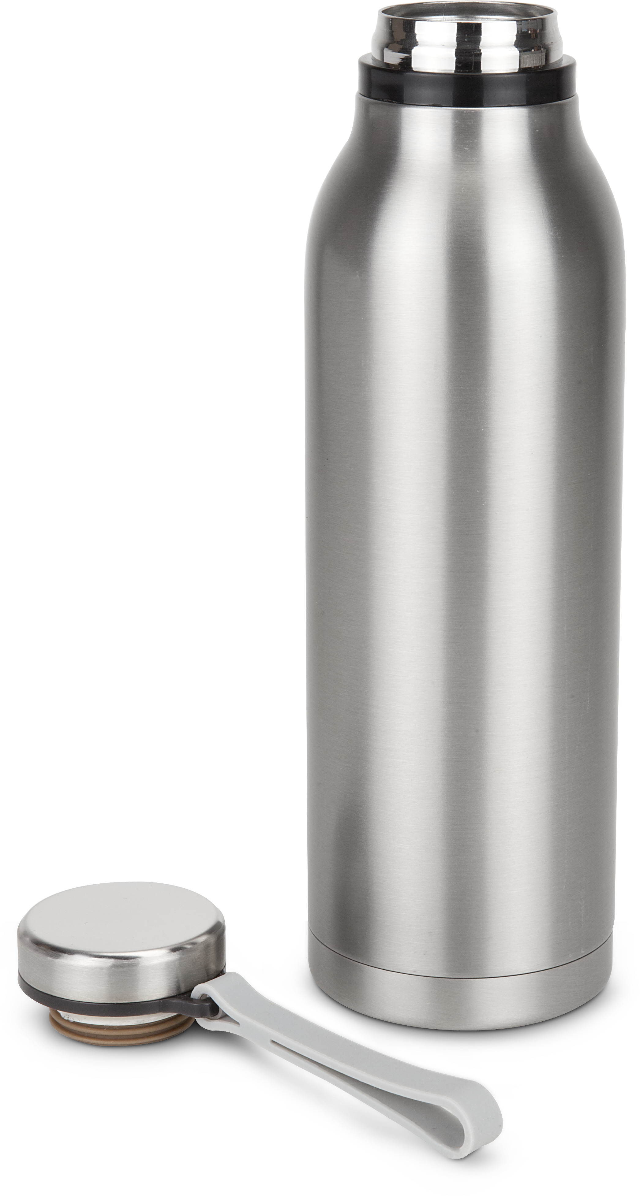 Handliche Thermoflasche in modernem Retrolook, auslaufsicher, leicht und stabil, zuverlässiger Begleiter für unterwegs, mit Drehverschluss und praktischem Trageriemen, doppelwandig für beste Isolation, 600 ml (Edelstahl - seidenmatt gebürstet, Kunststoff)