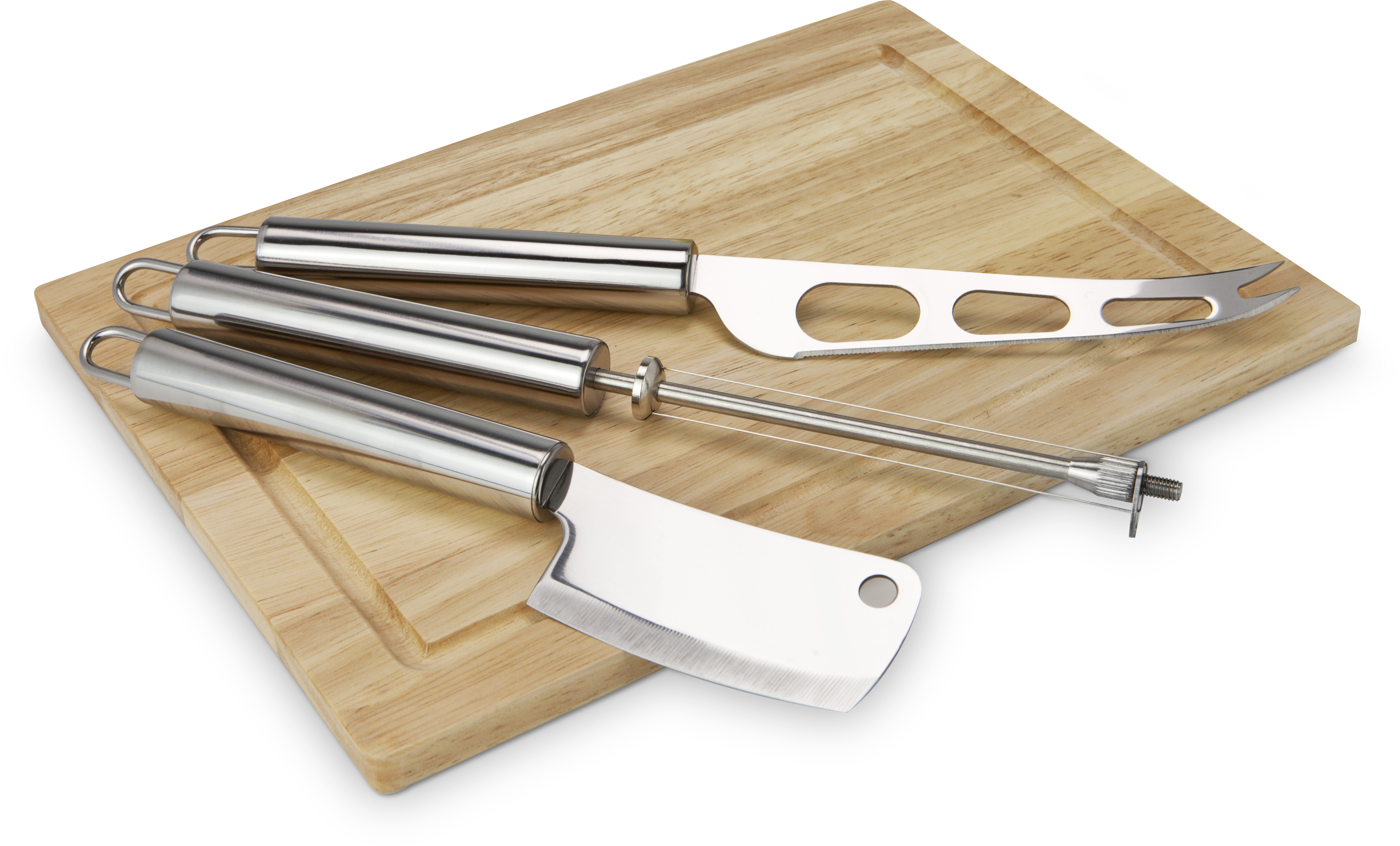 Grundausstattung für Käseliebhaber, massives Holzbrett, Käsemesser, Beil und Fadenschneider (Holz, Edelstahl - seidenmatt gebürstet)