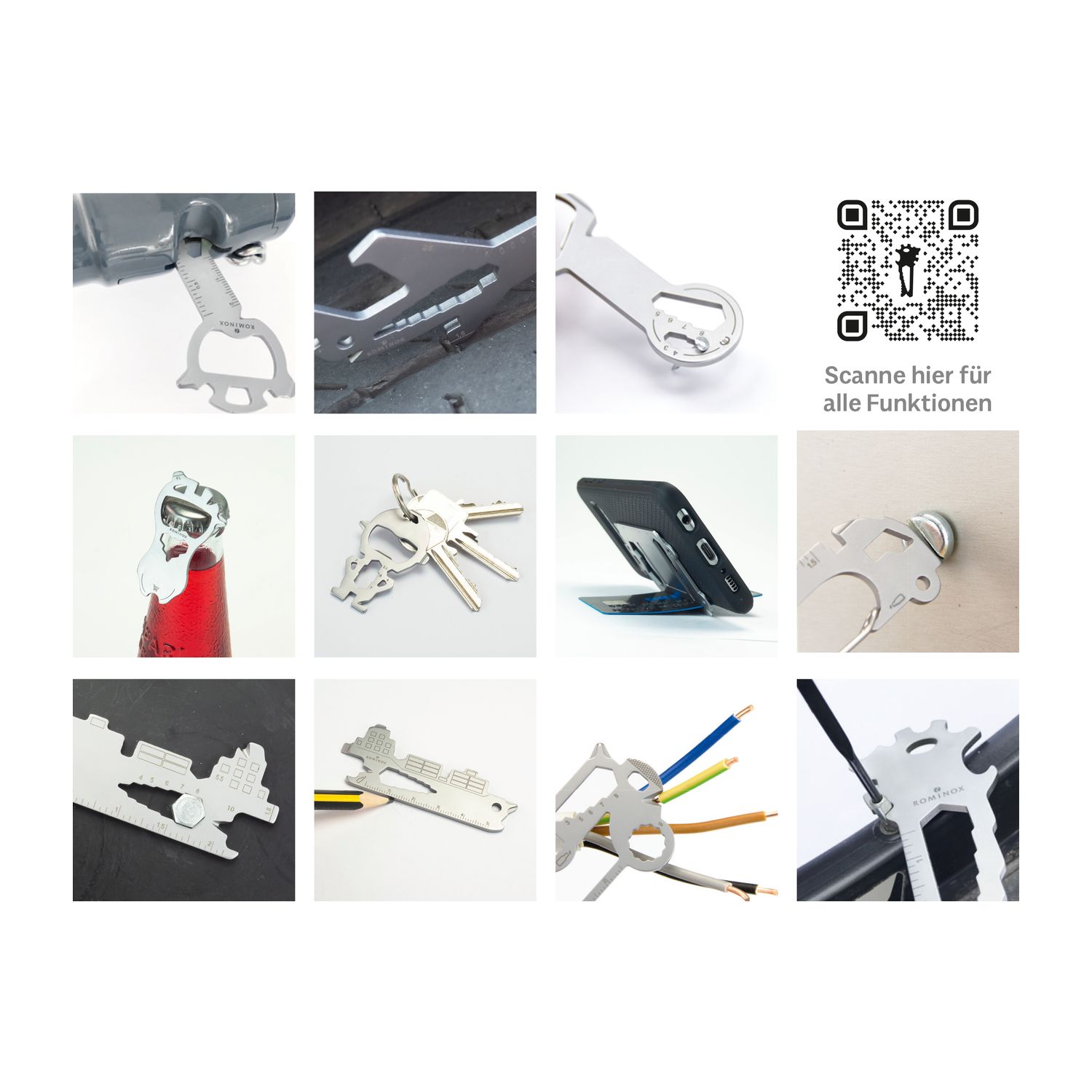 Multitool (aus robustem Edelstahl) für den Schlüsselbund inkl. Funktionsbeschreibung und Standard-Kartonverpackung, kundenindividuelle Verpackung und Funktionsbeschreibung ab 100 Stück möglich. In verschiedenen Standarddesigns verfügbar. Key Tool als Schlüsselanhänger mit 18 Funktionen: 1 Karabiner, 6 Sechskantschlüssel, 2 Speichenvierkant, 1 Schlitzschraubendreher, 1 Nagelzieher, 1 Kreuzschlitzschraubendreher, 1 Flaschenöffner, 1 Zentimeter Lineal, 1 Inch Lineal, 2 Reifenprofilmesser (1,6 / 4 mm), 1 Nagelfeile, - ab 3.000 Stück auch als Sonderproduktion mit individueller Key Tool Form möglich. Sprechen Sie uns an!