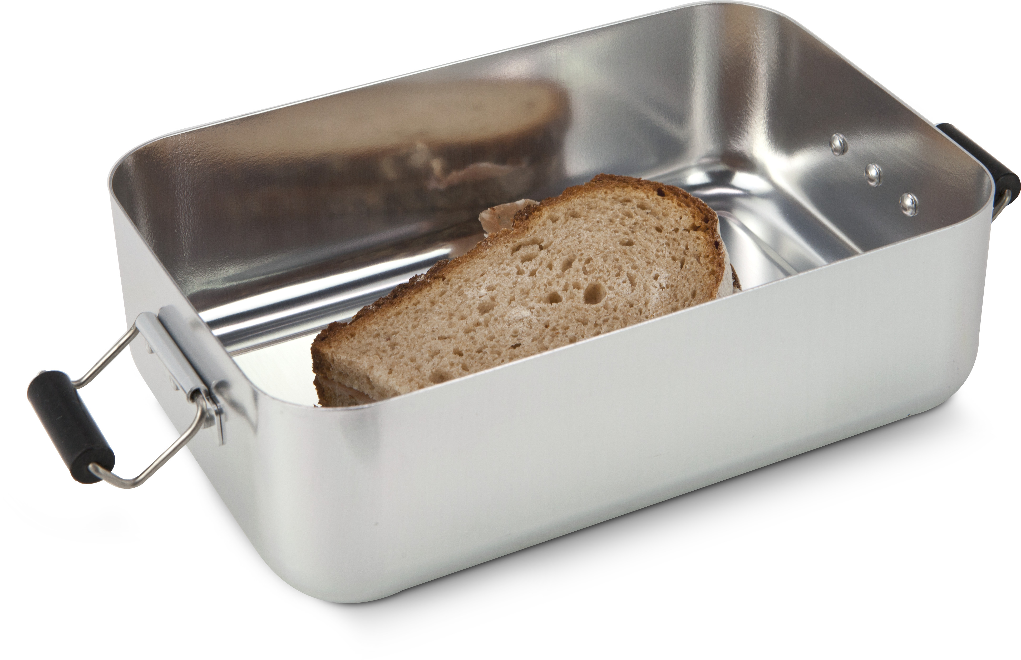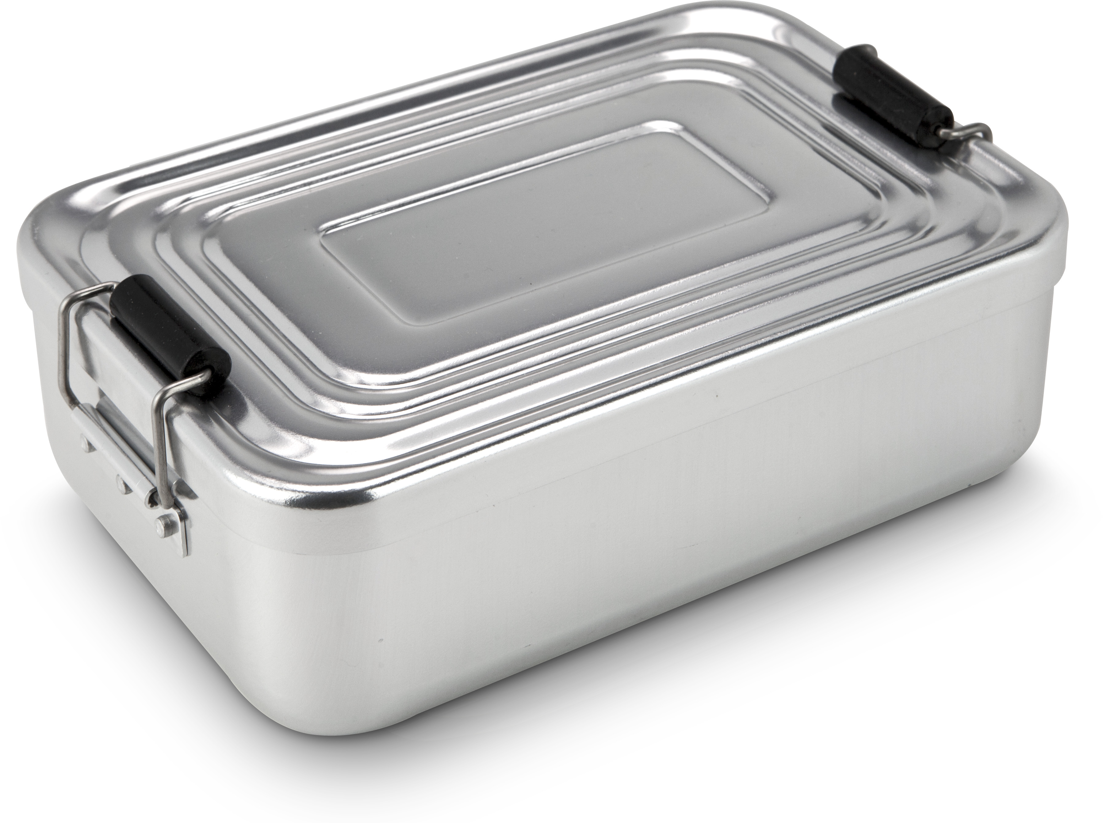 Klassisch, praktisch, leicht und stabil, hygienisch verschließbare silberne Proviantbox mit Dichtungsring, 900 ml Fassungsvermögen, entnehmbarem und verschiebbarem Trennelement, glänzende Oberfläche (Aluminium - poliert, Kunststoff, ohne Inhalt). Die Lunchbox ist in verschiedenen Farben und Größen erhältlich