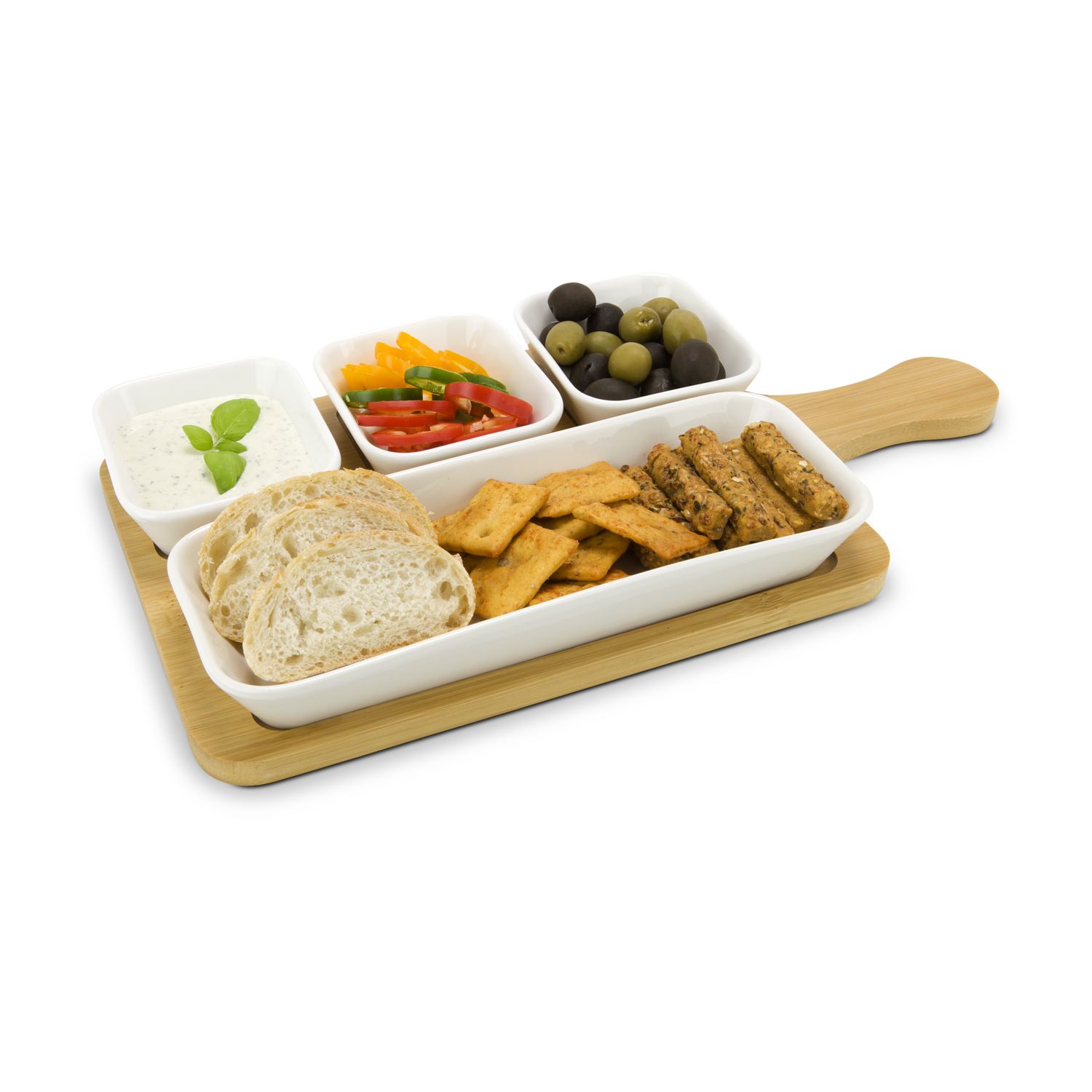 5-teiliges Servier-Set bestehend aus 4 Keramikschälchen auf einem eleganten Bambusbrett mit praktischem Griff, eingelassene Vertiefungen für einen besseren Halt, Schälchen in zwei verschiedenen Größen, ideal zur stilvollen Präsentation von Snacks, Gemüse, Obst, Antipasti oder Tapas mit Dips (Bambus, Keramik)