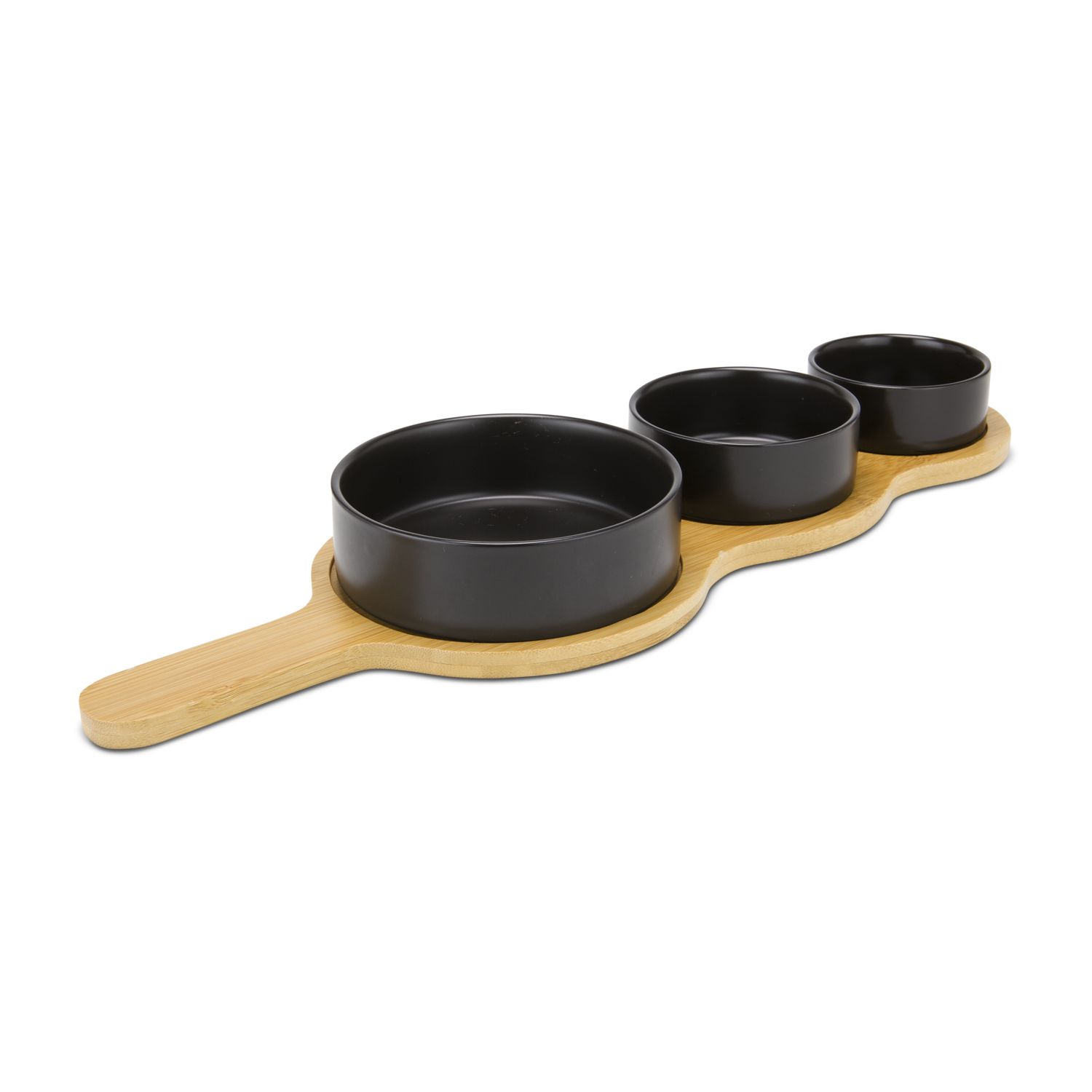 4-teiliges Servier-Set bestehend aus 3 edlen, schwarzen Keramikschälchen auf einem eleganten Bambusbrett mit praktischem Griff, eingelassene Vertiefungen für einen besseren Halt, Servierschälchen in drei unterschiedlichen Größen, ideal zur stilvollen Präsentation von süßen oder salzigen Snacks, Tapas oder Dips (Bambus, Keramik)