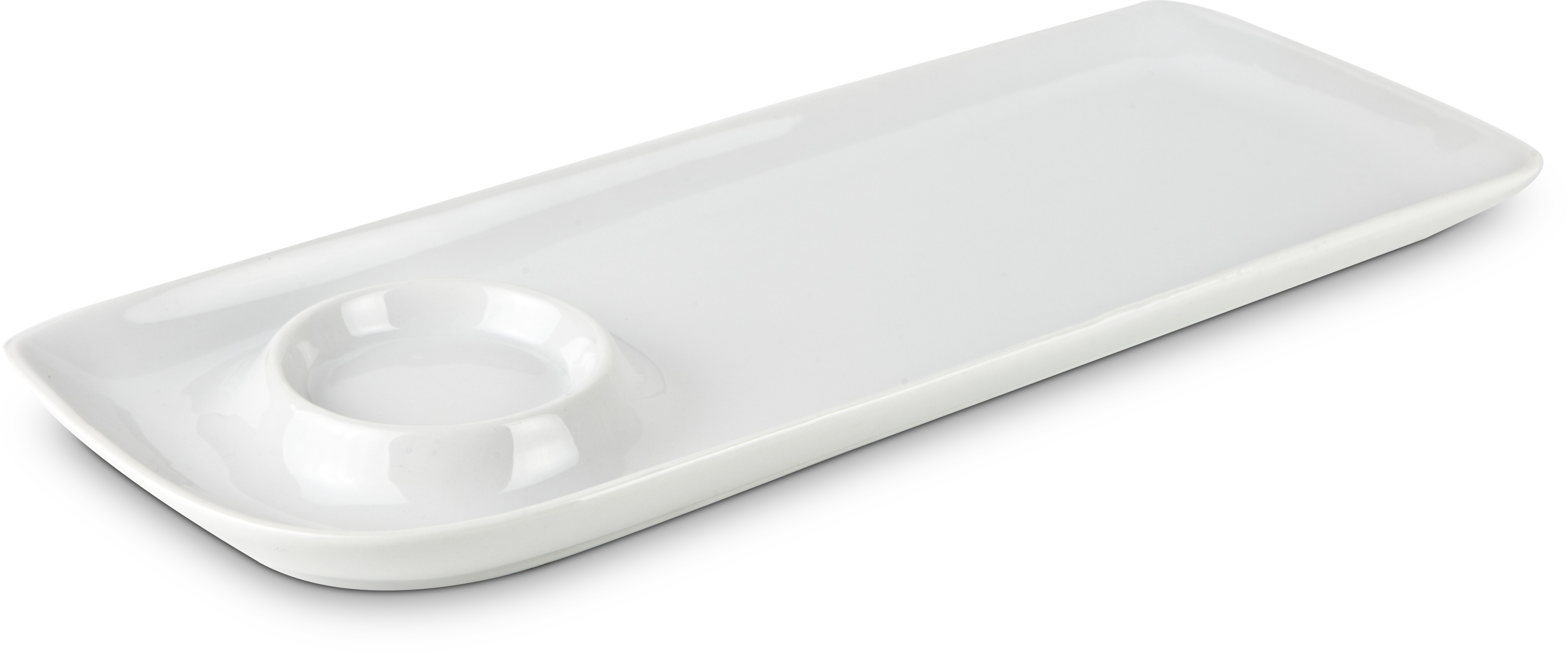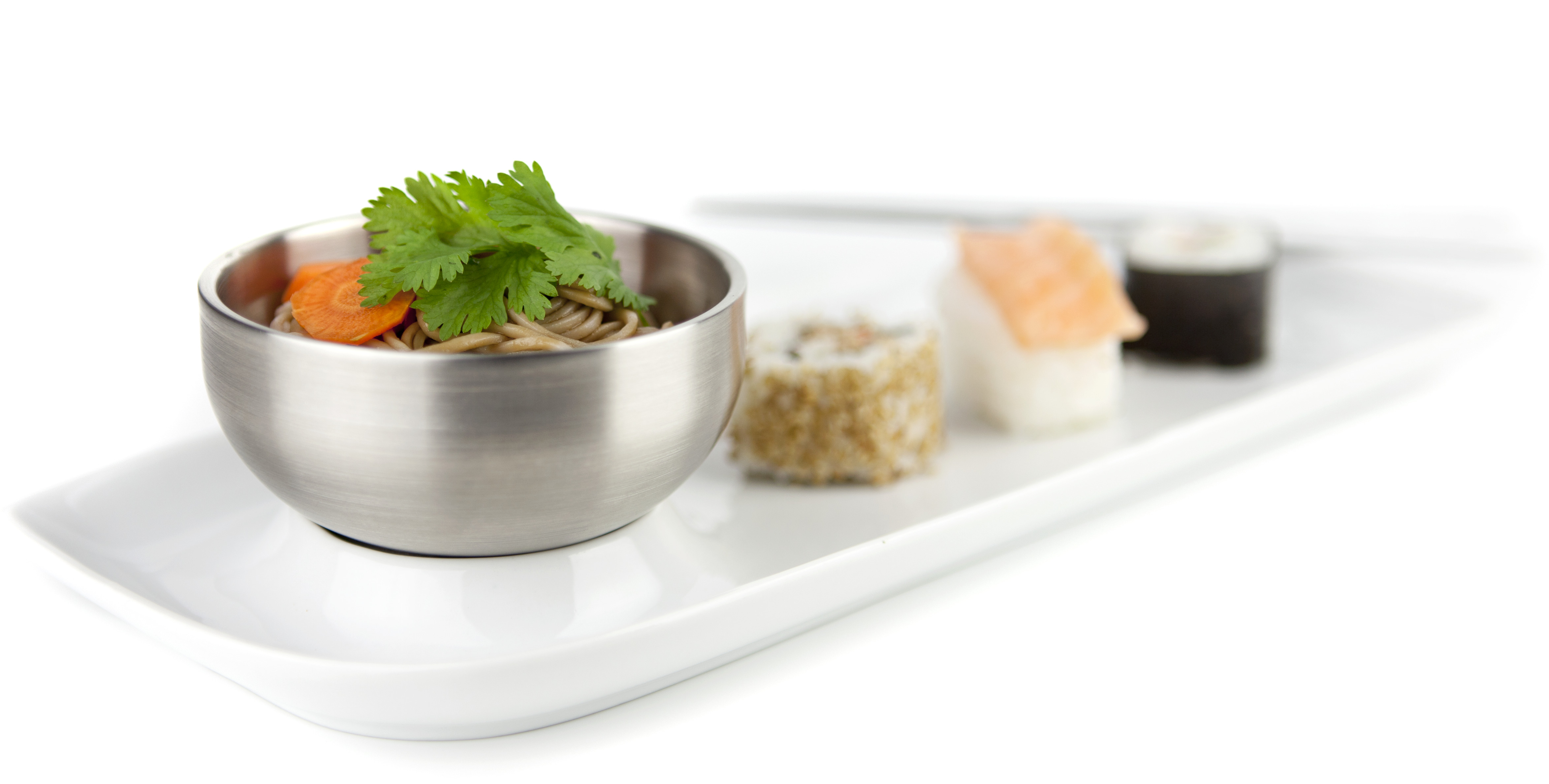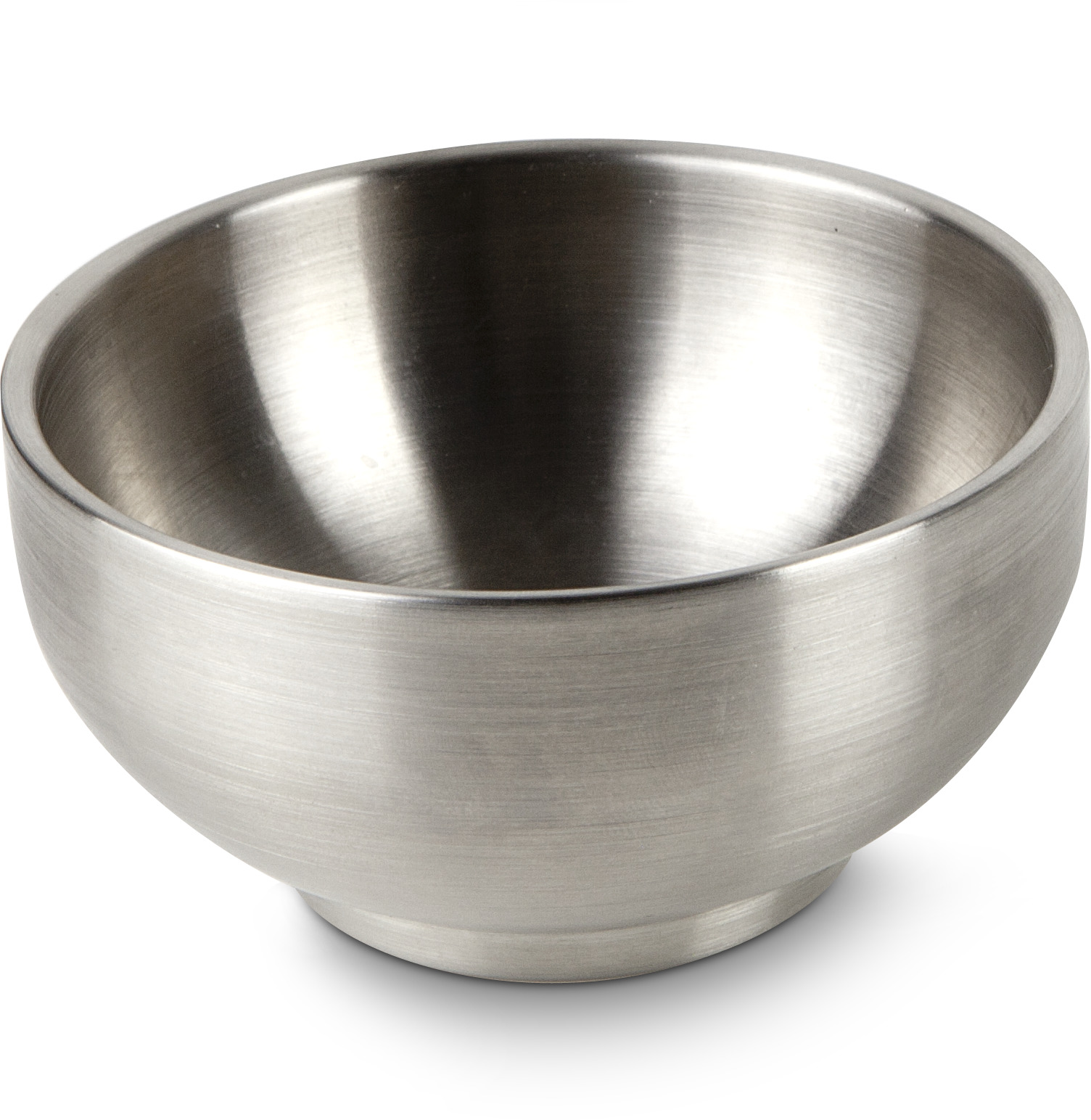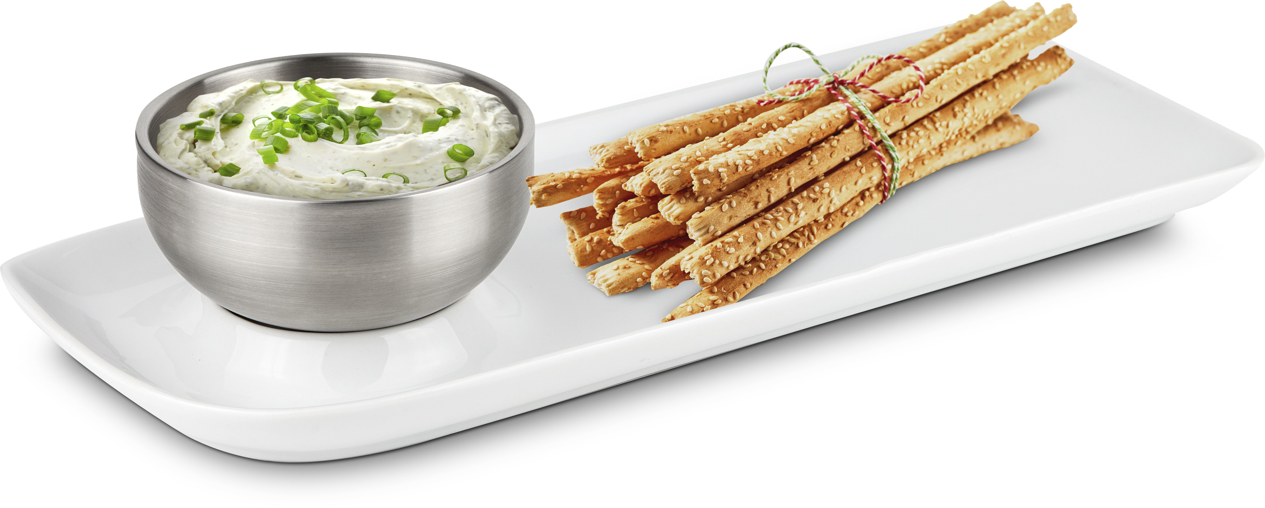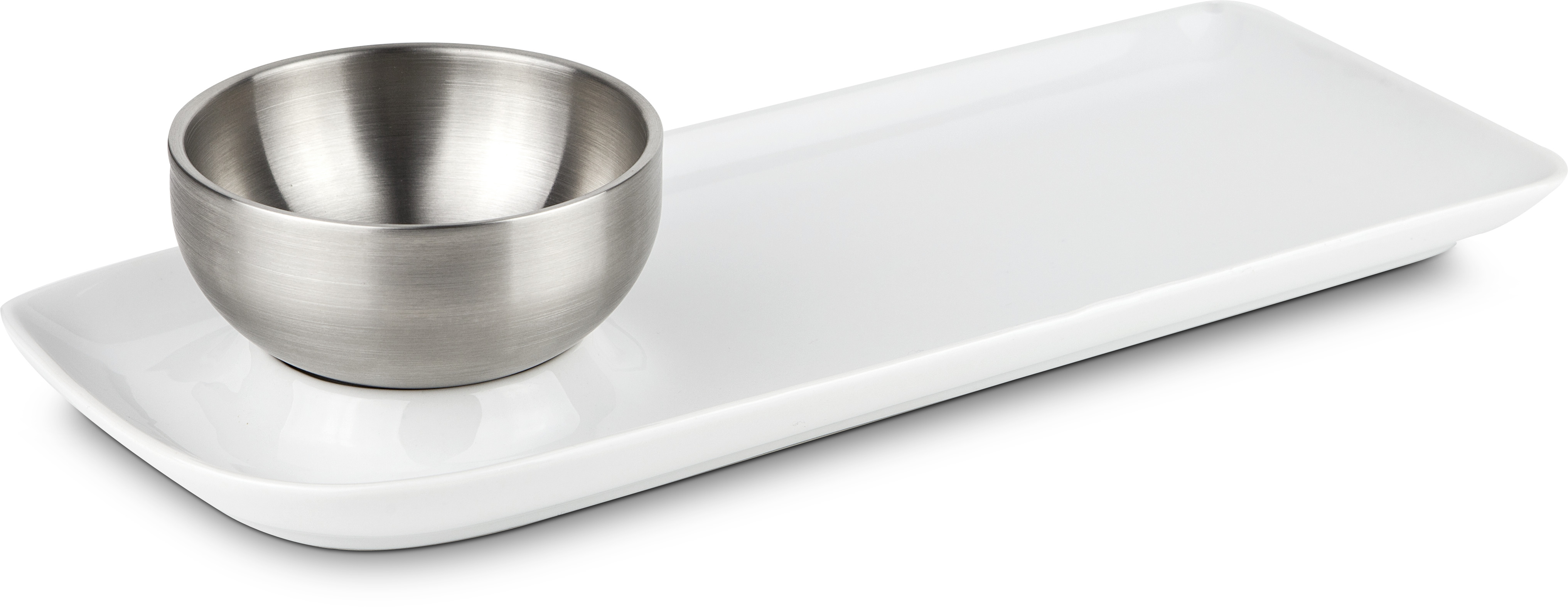 Funktional gestalteter Servierteller mit integrierter Schale (ca. Ø 9,5 x 4,5 cm) aus Edelstahl für Beilagen, Suppen, Soßen oder Dips - praktisch und unkonventionell (Porzellan, Edelstahl)