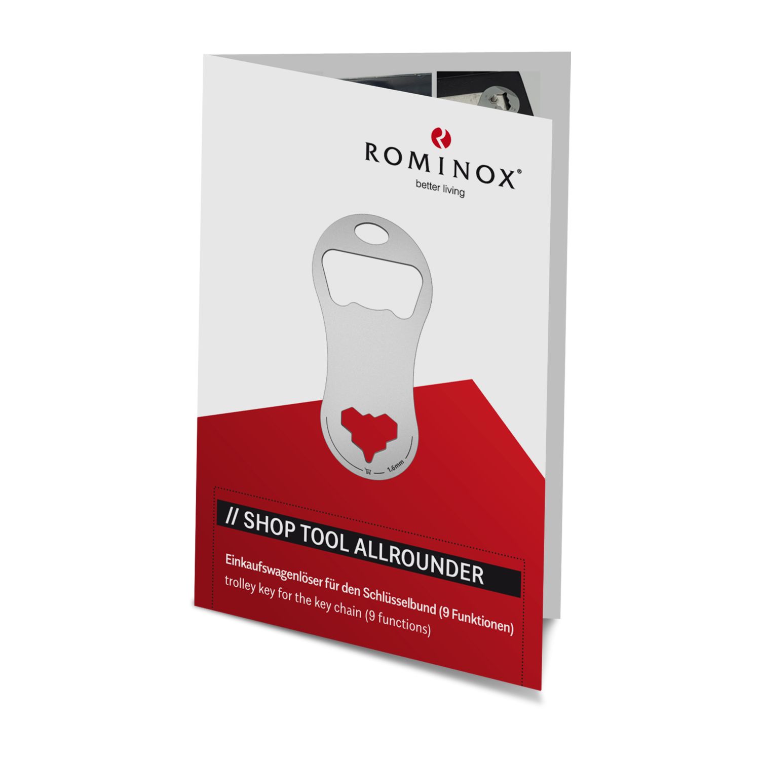 Die praktischen ROMINOX© Multitools gibt es jetzt auch als schlanke Einkaufswagenlöser für den Schlüsselbund! Klein, leicht und doch vielseitig überzeugen die neuen Shop Tools im Alltag. Robuster Werkzeugstahl, inkl. Funktionsbeschreibung und Standard-Kartonverpackung, kundenindividuelle Verpackung ab 100 Stück möglich (Werkzeugstahl). Shop Tool als Schlüsselanhänger mit 8 Funktionen: 1 Einkaufswagenlöser, 1 Flaschenöffner, 1 Schlitzschraubendreher, 1 Reifenprofilmesser (1,6 mm), 1 Nagelzieher, 3 Sechskantschlüssel - ab 3‘000 Stück auch als Sonderproduktion mit individueller Form möglich. Sprechen Sie uns an!