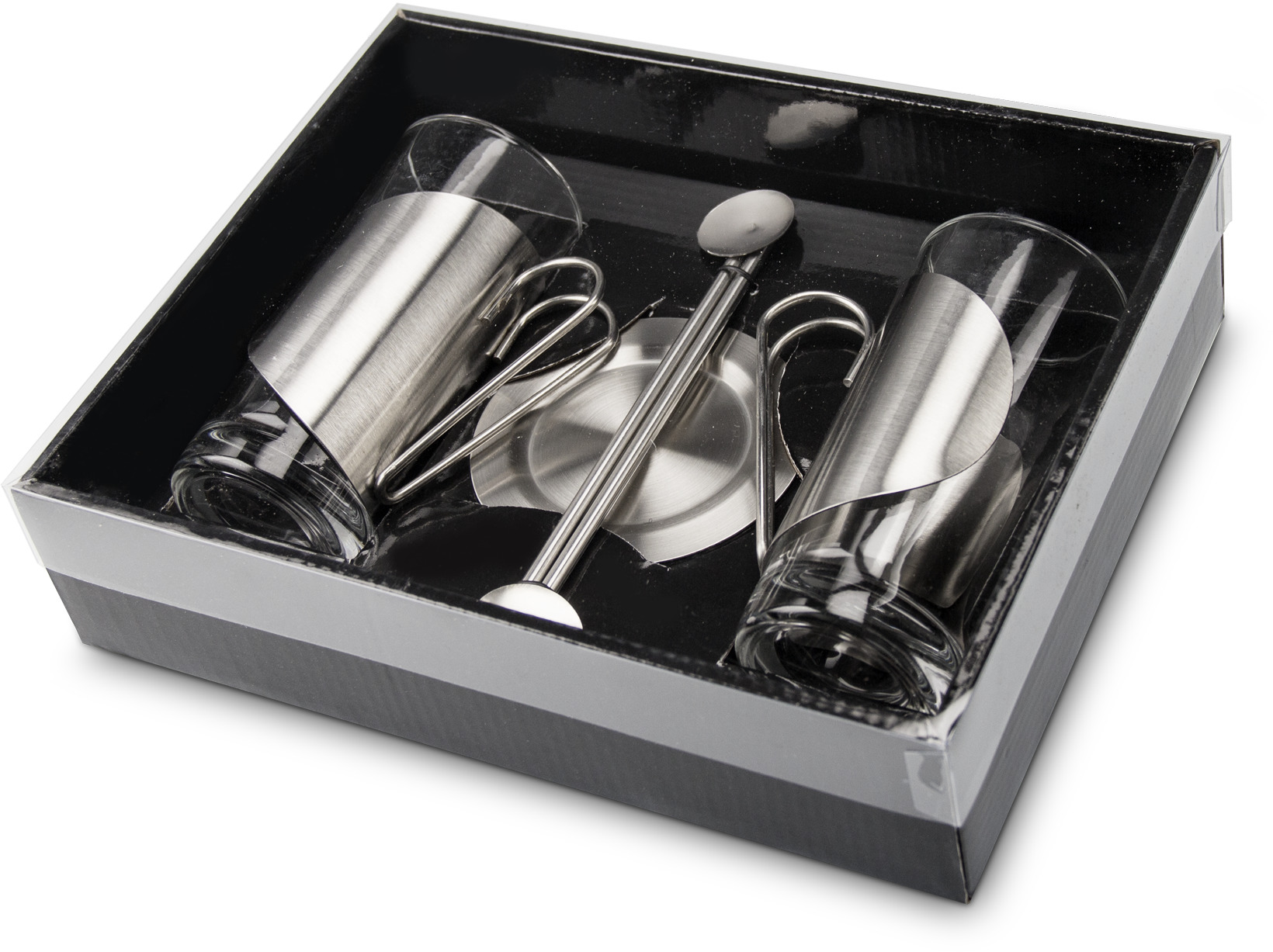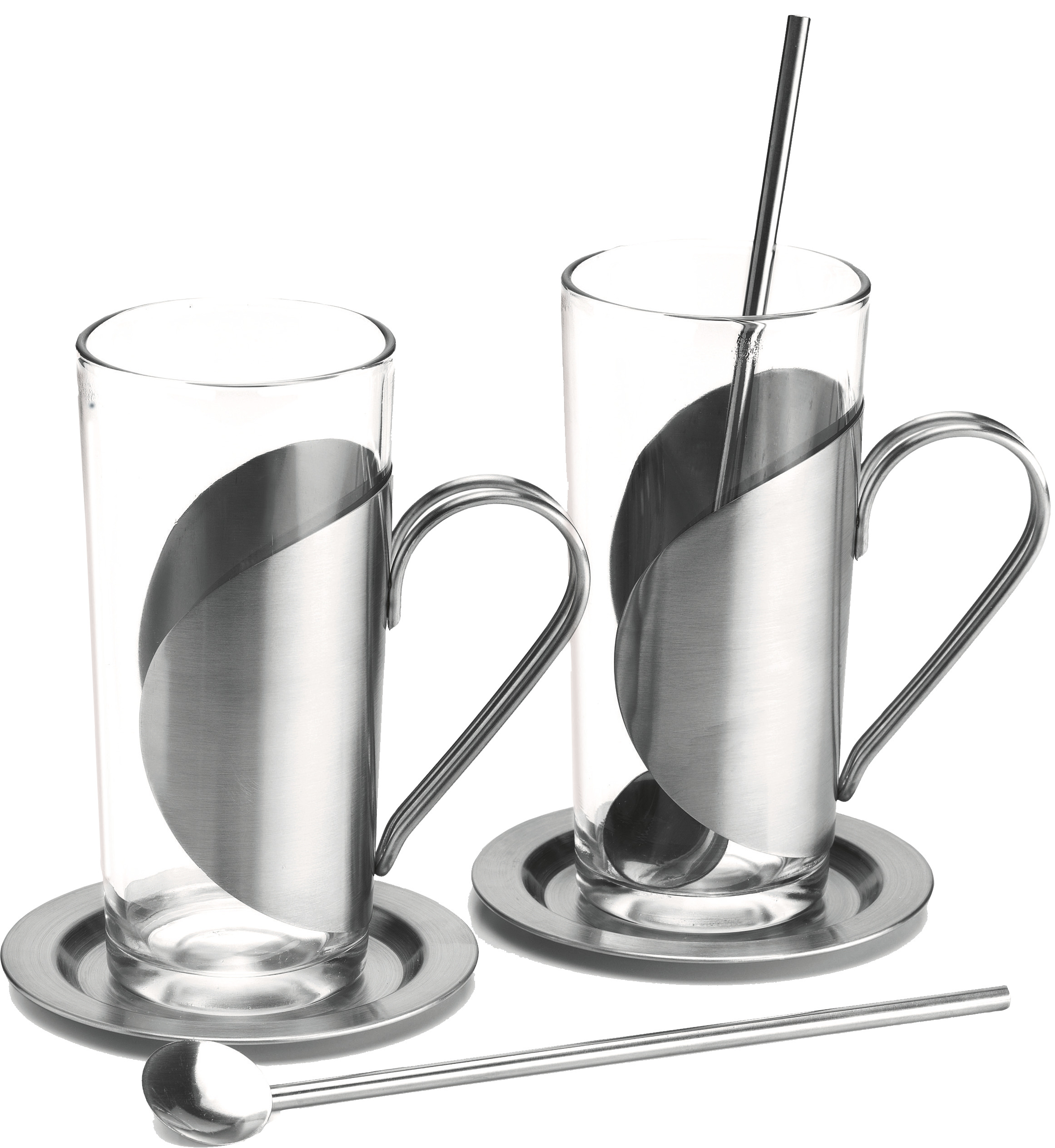 2 Teegläser mit klarer, linearer Formensprache, liegen sicher und ohne Hitzeübertragung in der Hand, inklusive 2 Untersetzer und 2 Trinkhalmlöffel, 6-teilig (hitzebeständiges Glas, Edelstahl - seidenmatt gebürstet)