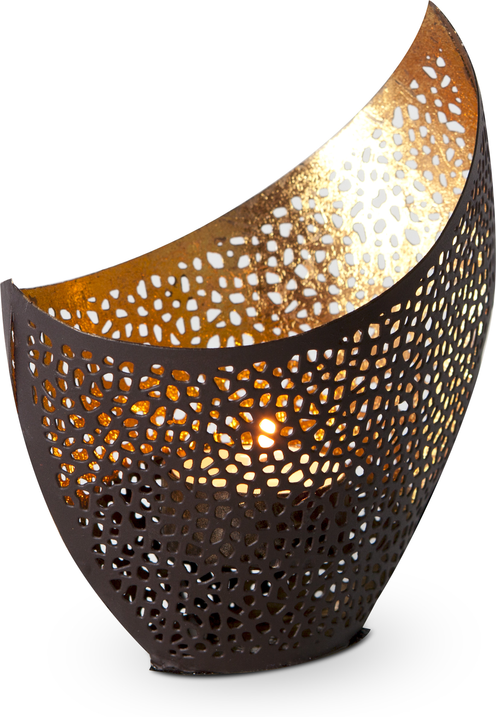Kunstvoll gestalteter Teelichthalter, goldene Lichteffekte für eine warme, behagliche Atmosphäre (Metall - seidenmatt braun lackiert mit Goldfolienauskleidung, ohne Teelicht), Handarbeit bedingt leichte Formunterschiede.