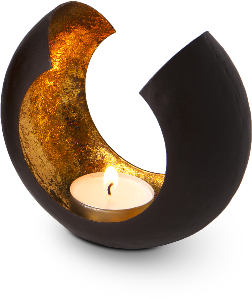 Wunderschön geformter Teelichthalter in Hammerschlagoptik, strahlend goldener Kerzenschein für pure Entspannung (Metall - seidenmatt braun lackiert mit Goldfolienauskleidung, ohne Teelicht). Handarbeit bedingt leichte Formunterschiede. Erhältlich in zwei Größen.