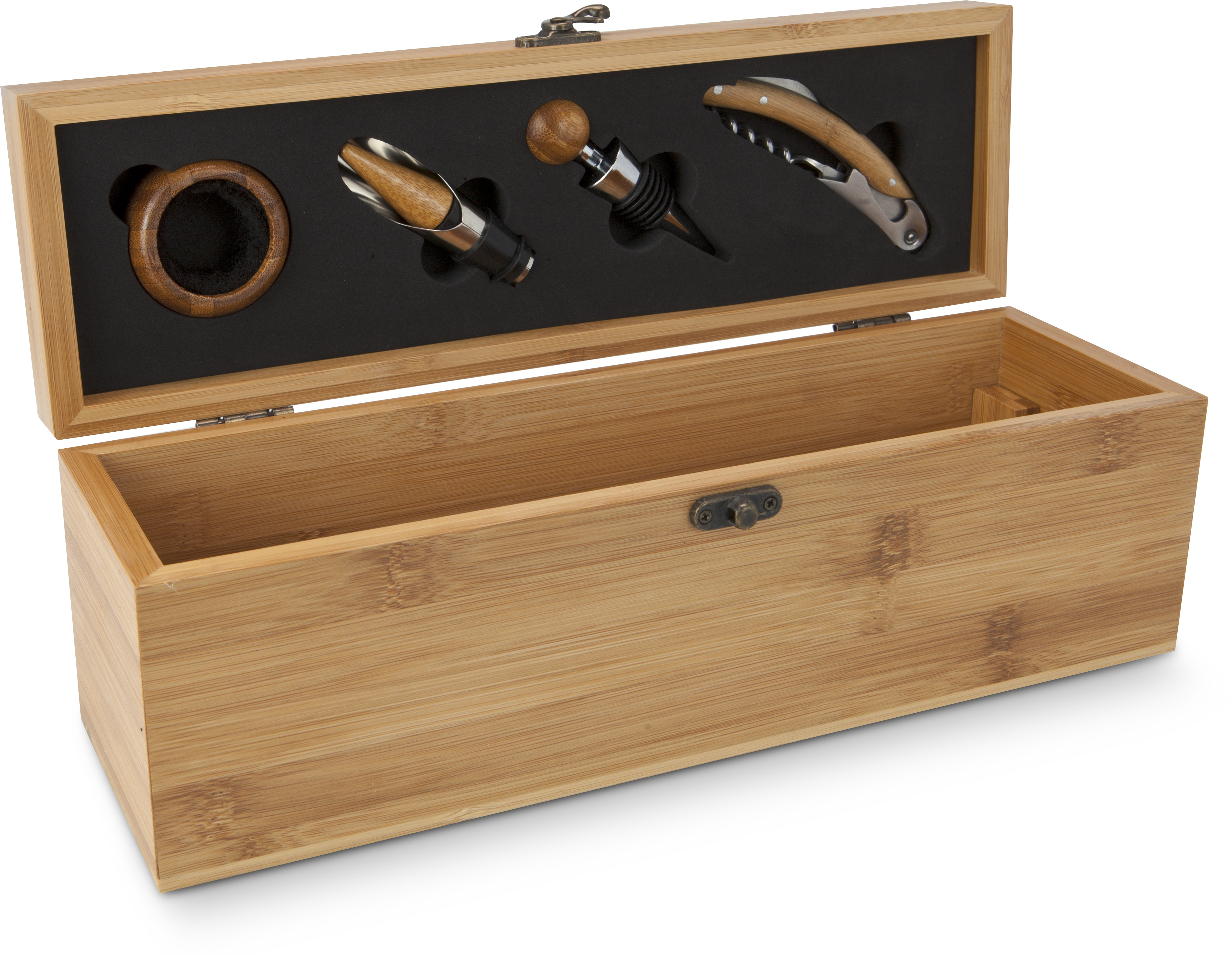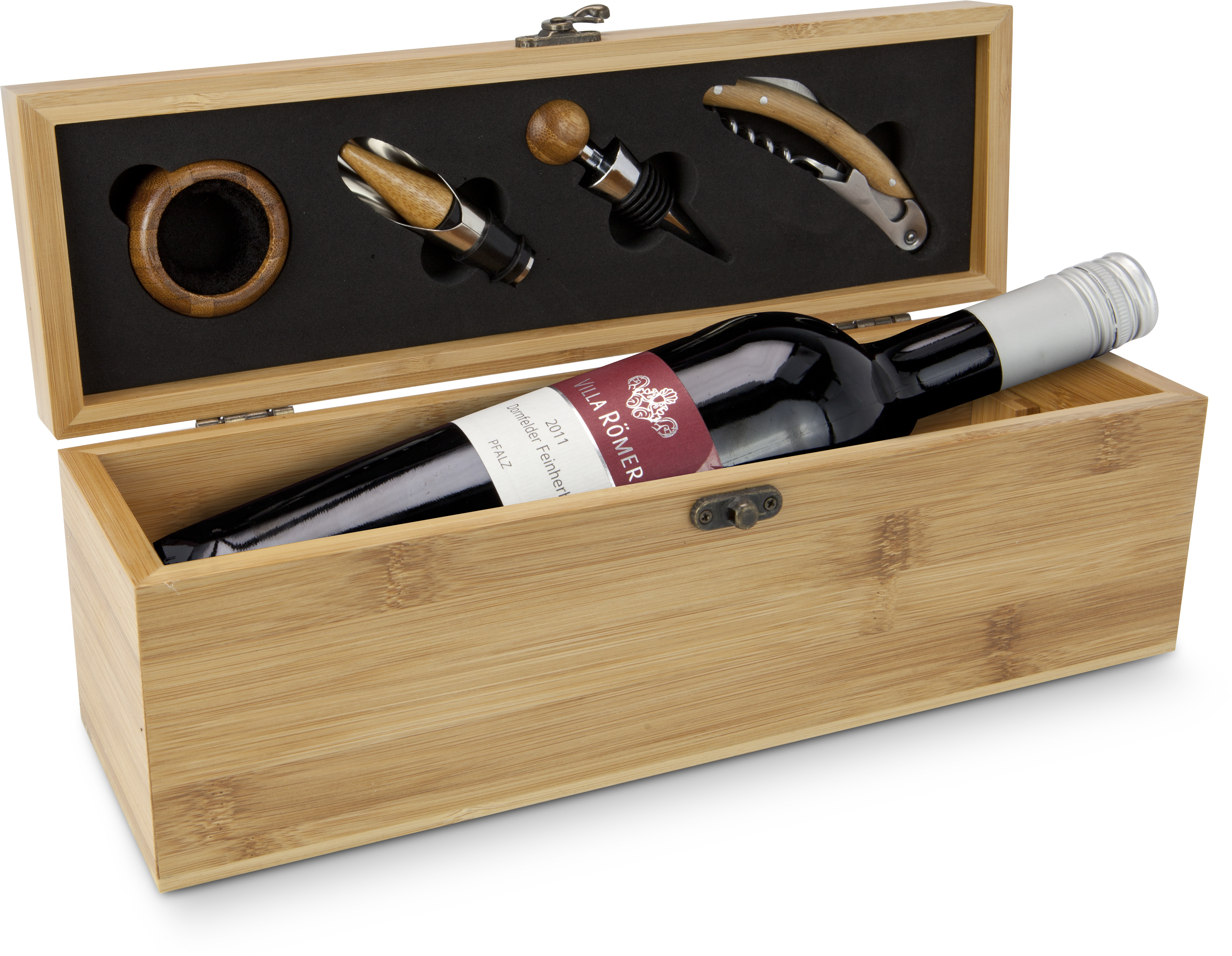 Edle Holzkiste mit Weinaccessoires, hochwertiger Materialmix aus Edelstahl und Bambus, Sommeliermesser, Flaschenverschluss, Ausgießer, Tropfring (Bambus, Edelstahl, Silikon); Anwendungsbeispiel: Lieferung ohne Wein