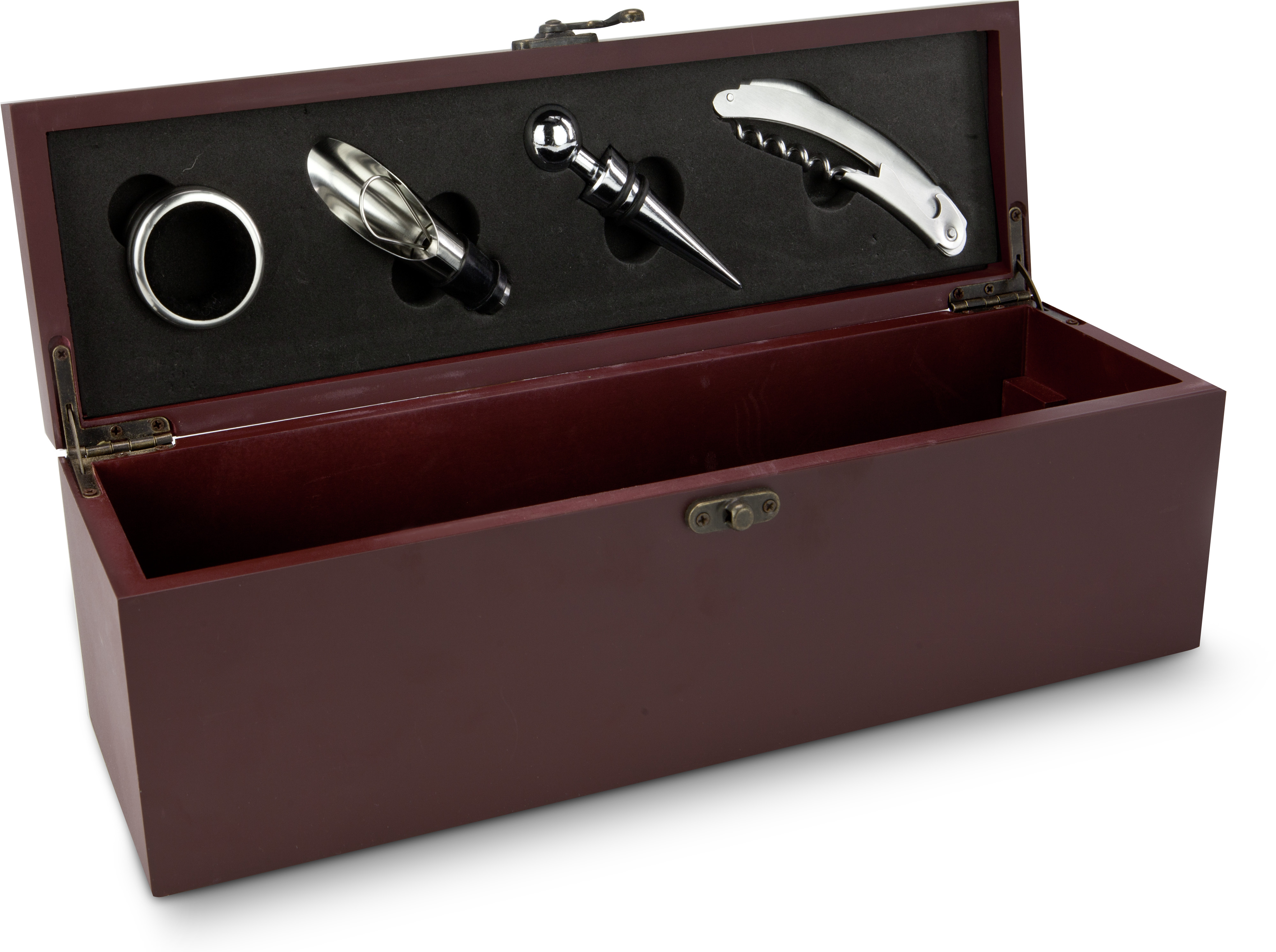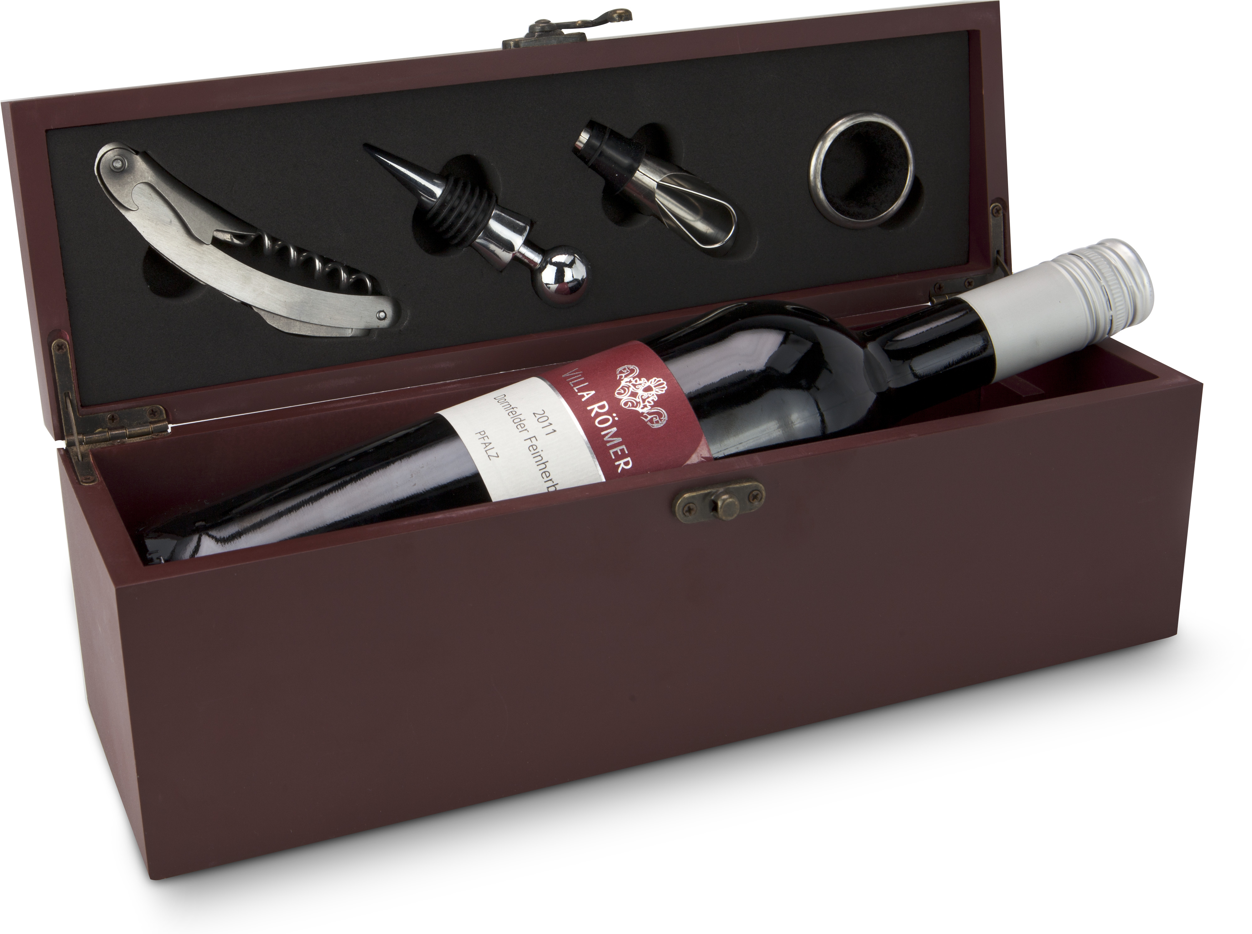 Massive Holzkiste mit nützlichem Weinzubehör: Sommeliermesser, Flaschenverschluss, Ausgießer, Tropfring (Holz, Edelstahl, Silikon); Anwendungsbeispiel: Lieferung ohne Wein