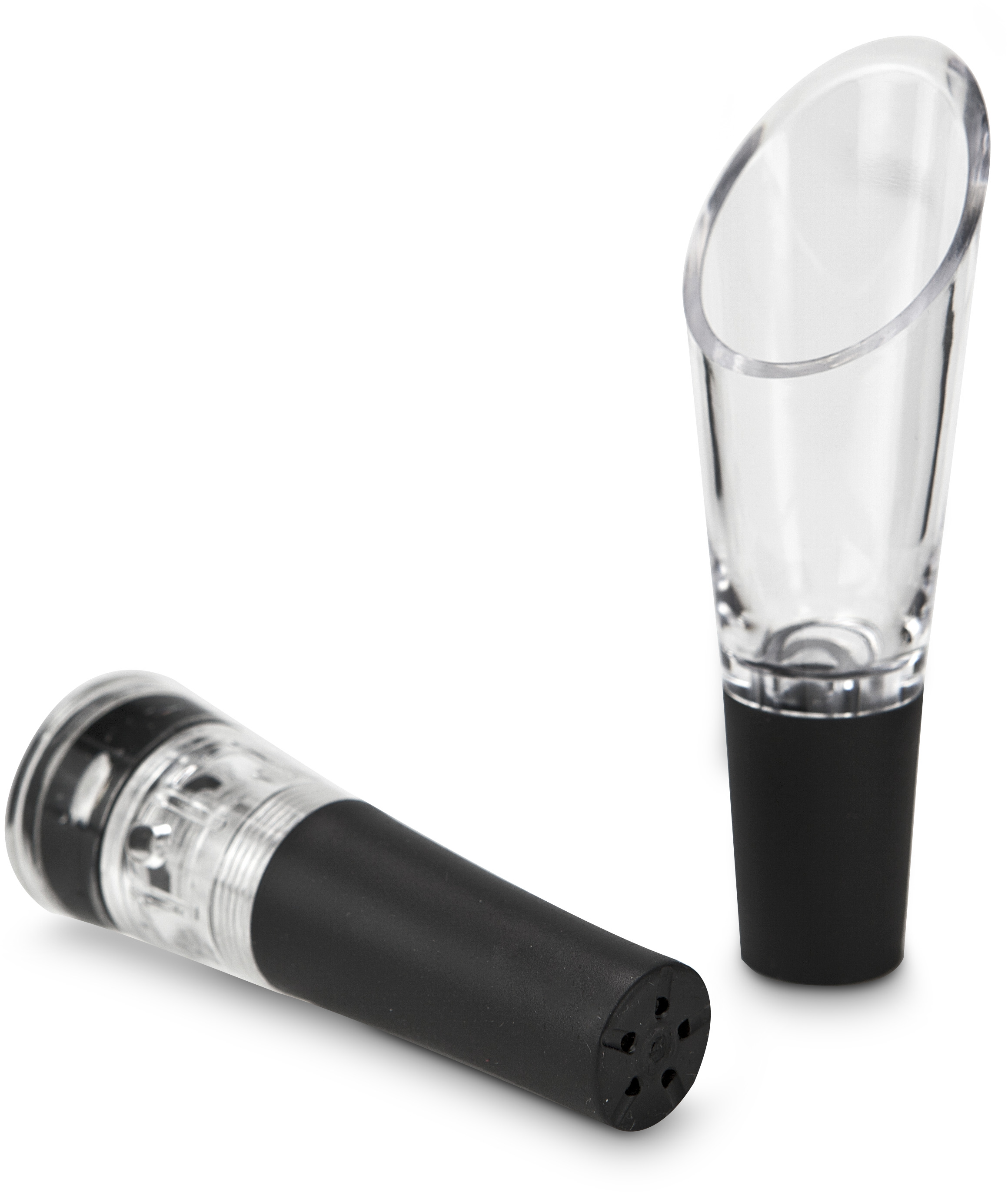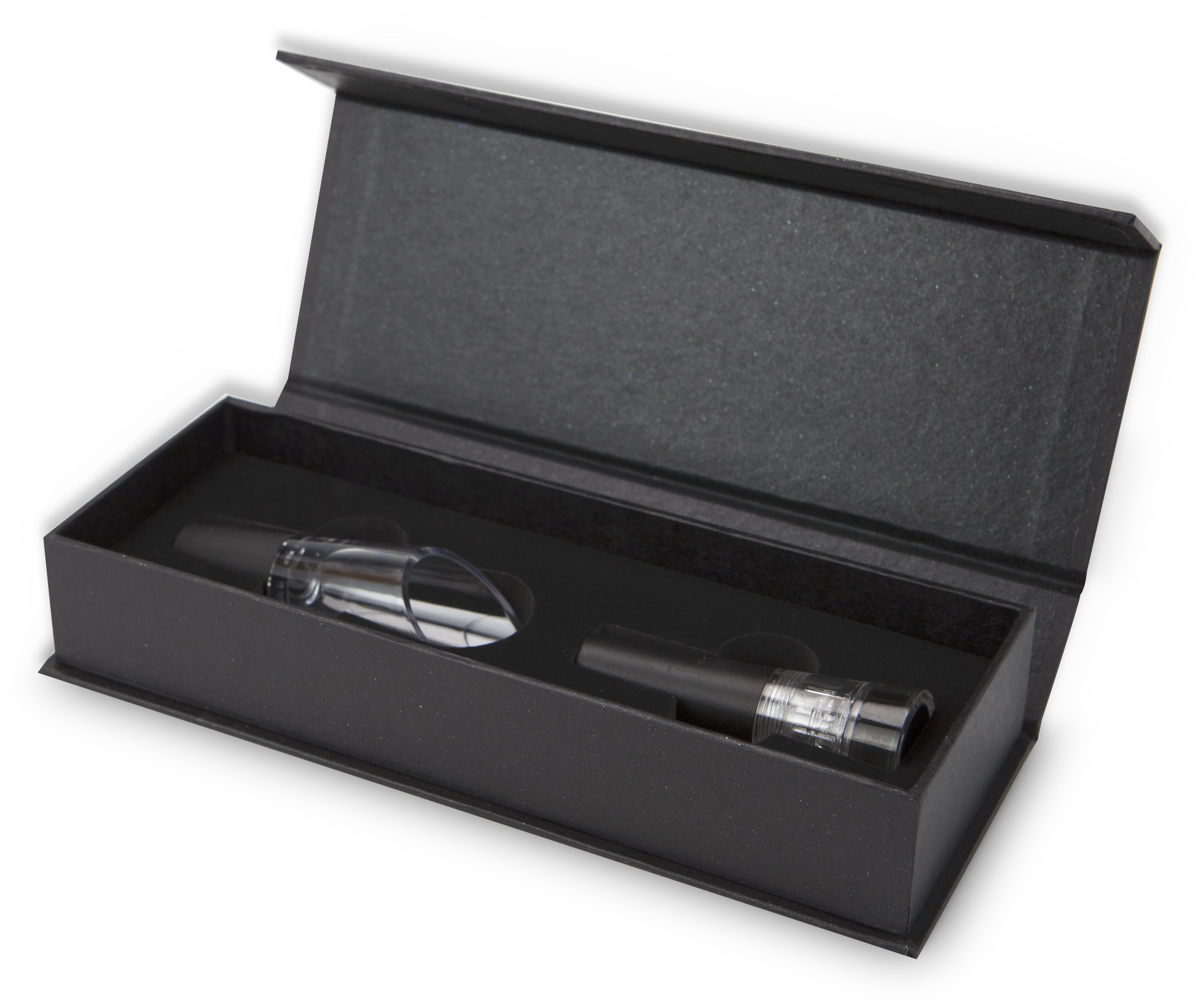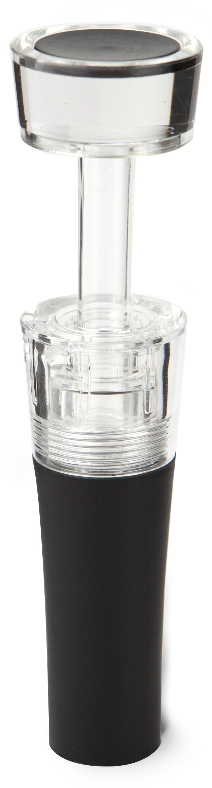 Damit wird jede Flasche zum Genuss, praktischer Dekantierausgießer (ø 3 x 9,5 cm) für die Belüftung des Weines während des Ausgießens, pfiffiger Vakuum-Pump-Verschluss (ø 2,5 x 8 cm) für längere Haltbarkeit des Weines, in edler Geschenkbox (Kunststoff, Silikon)