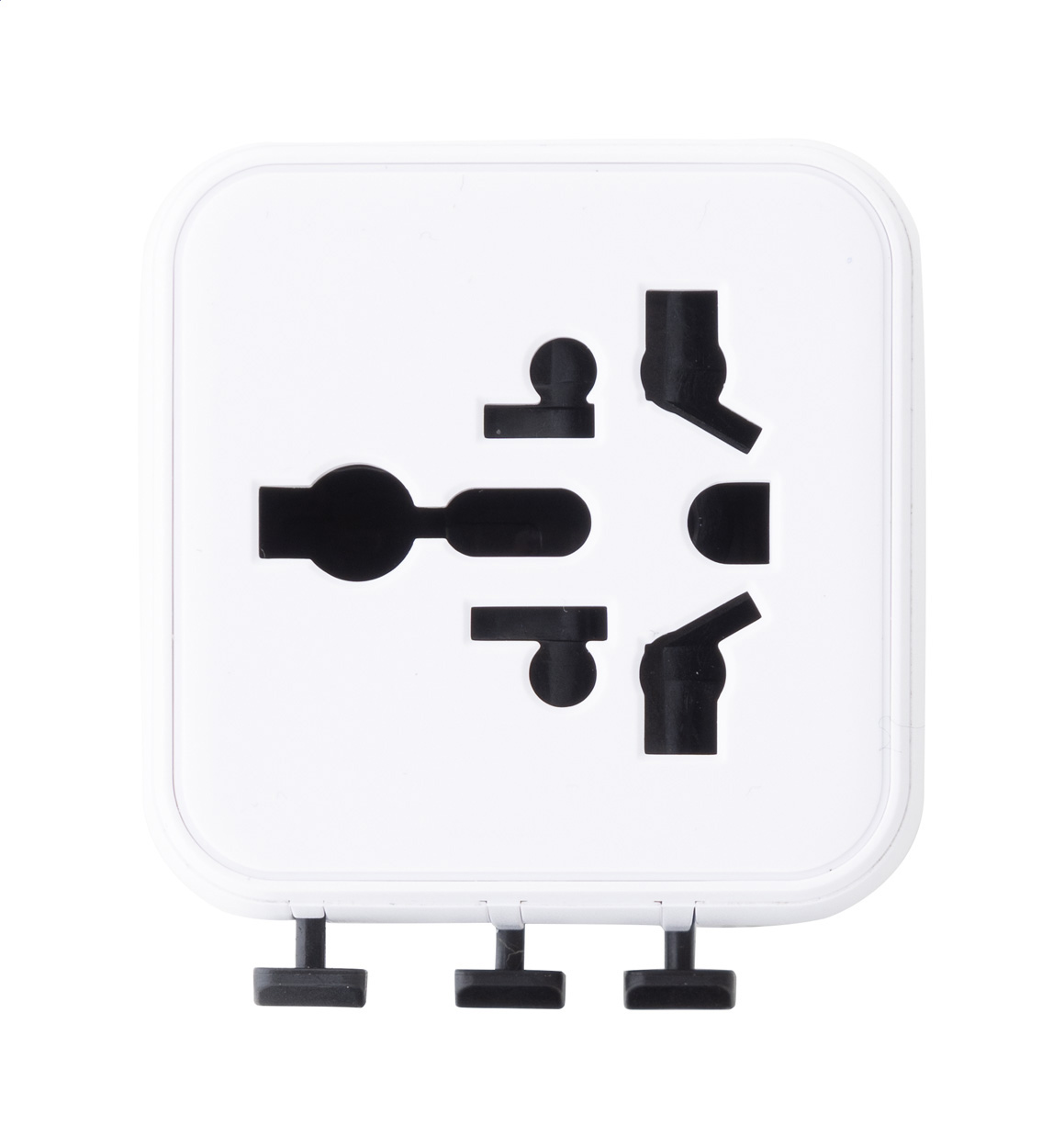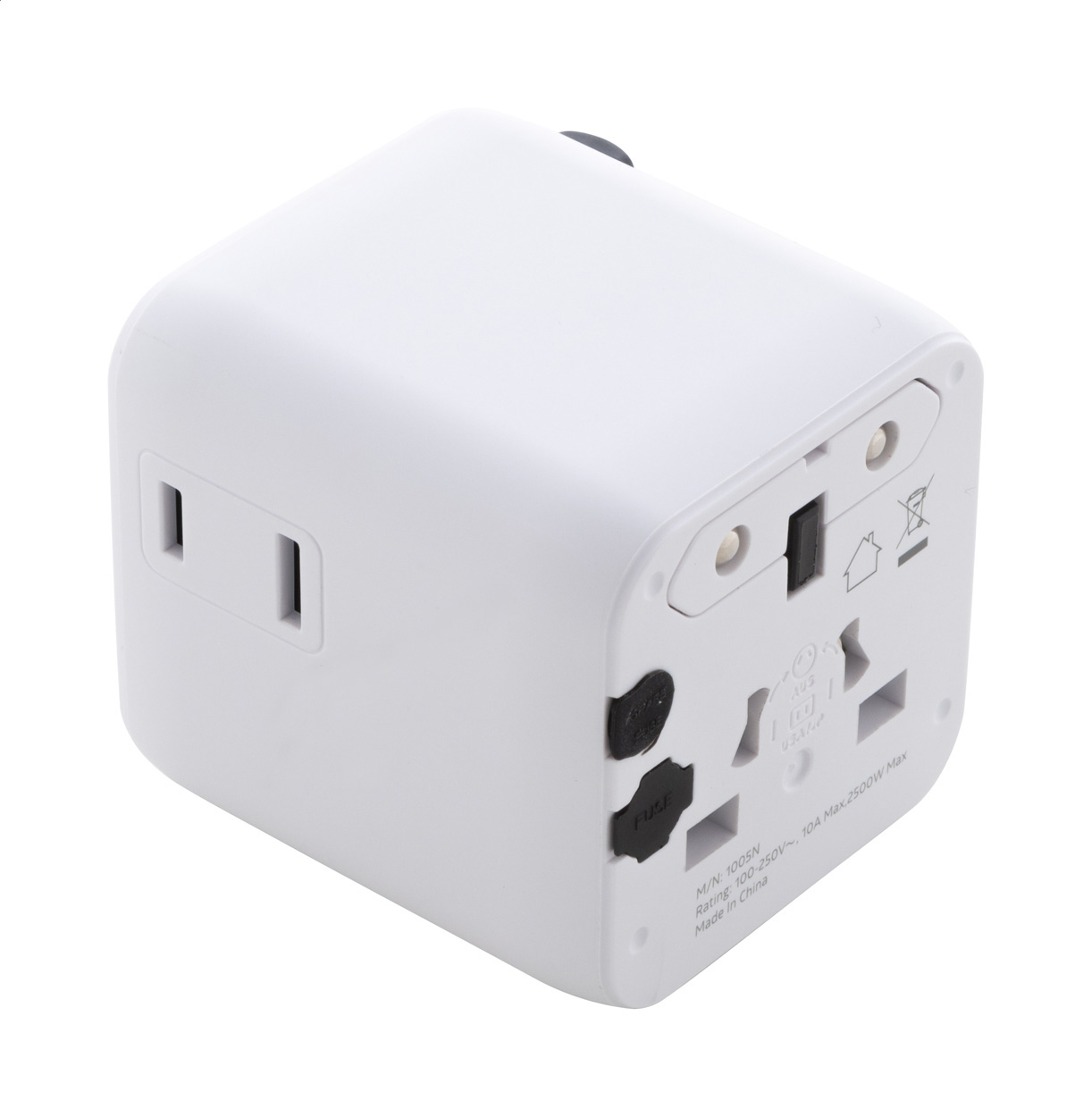 Ultrakompakter, universeller Reiseadapter für weltweiten Einsatz aus recyceltem PC-Kunststoff, mit integrierten Steckdosen für USA, Europa, Großbritannien und Australien.