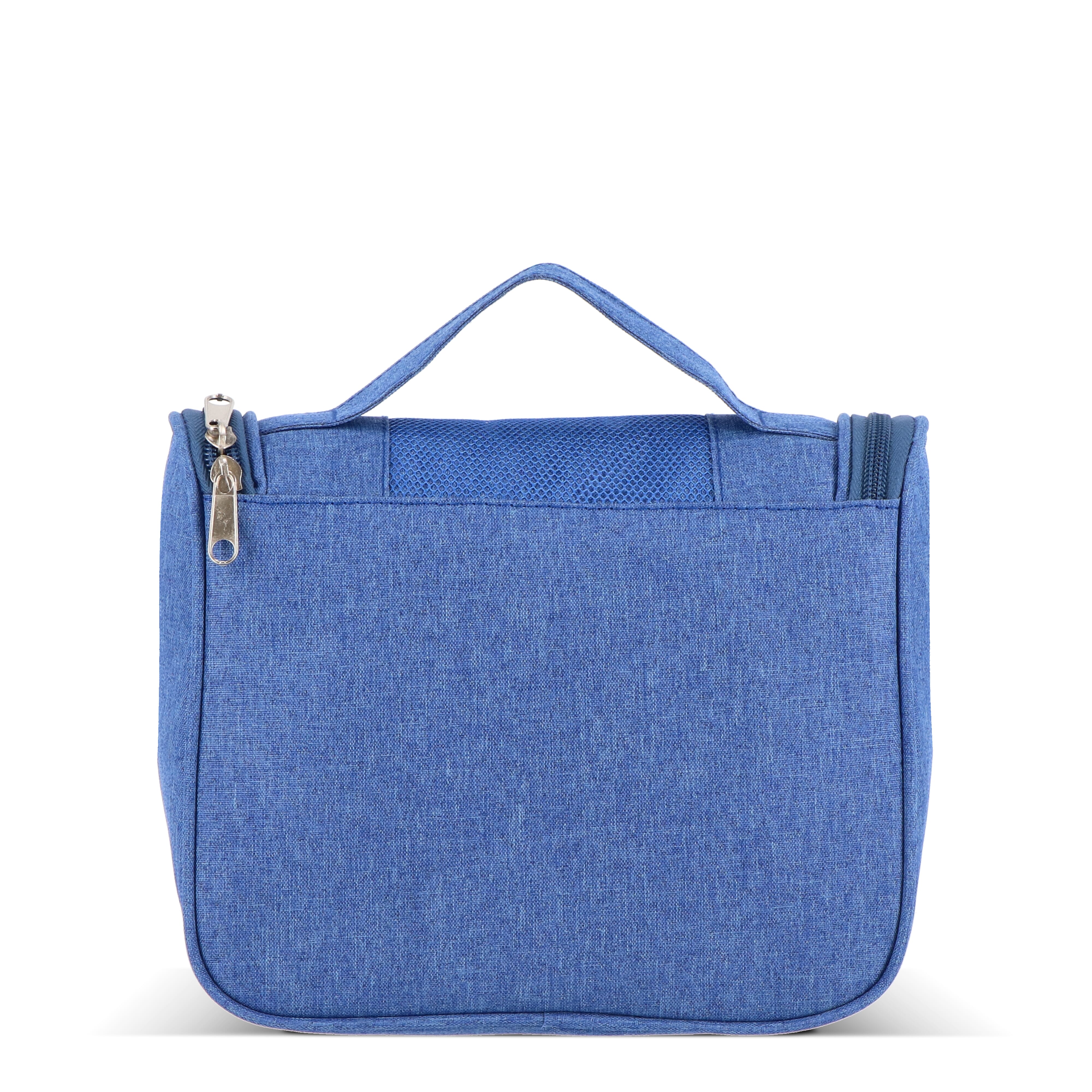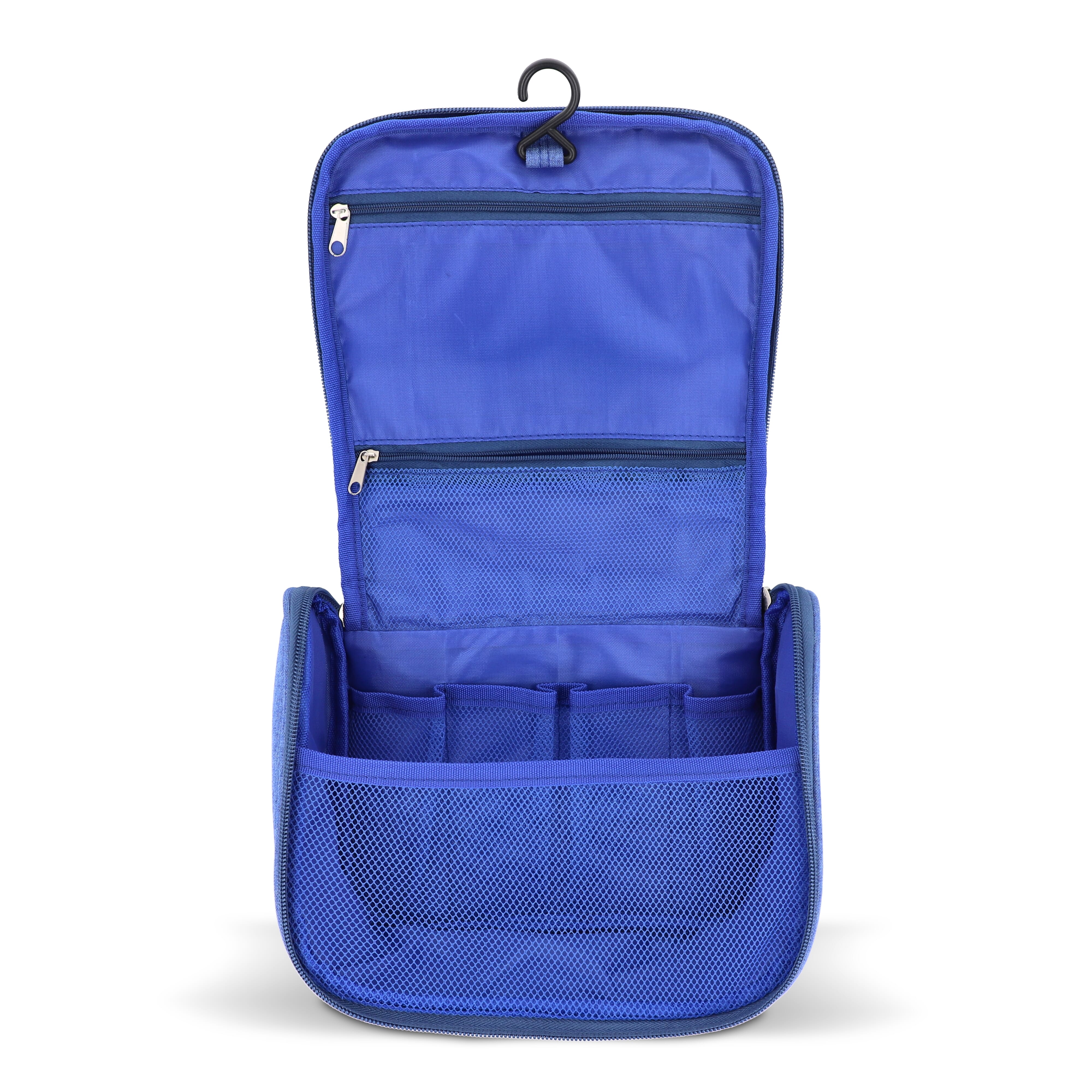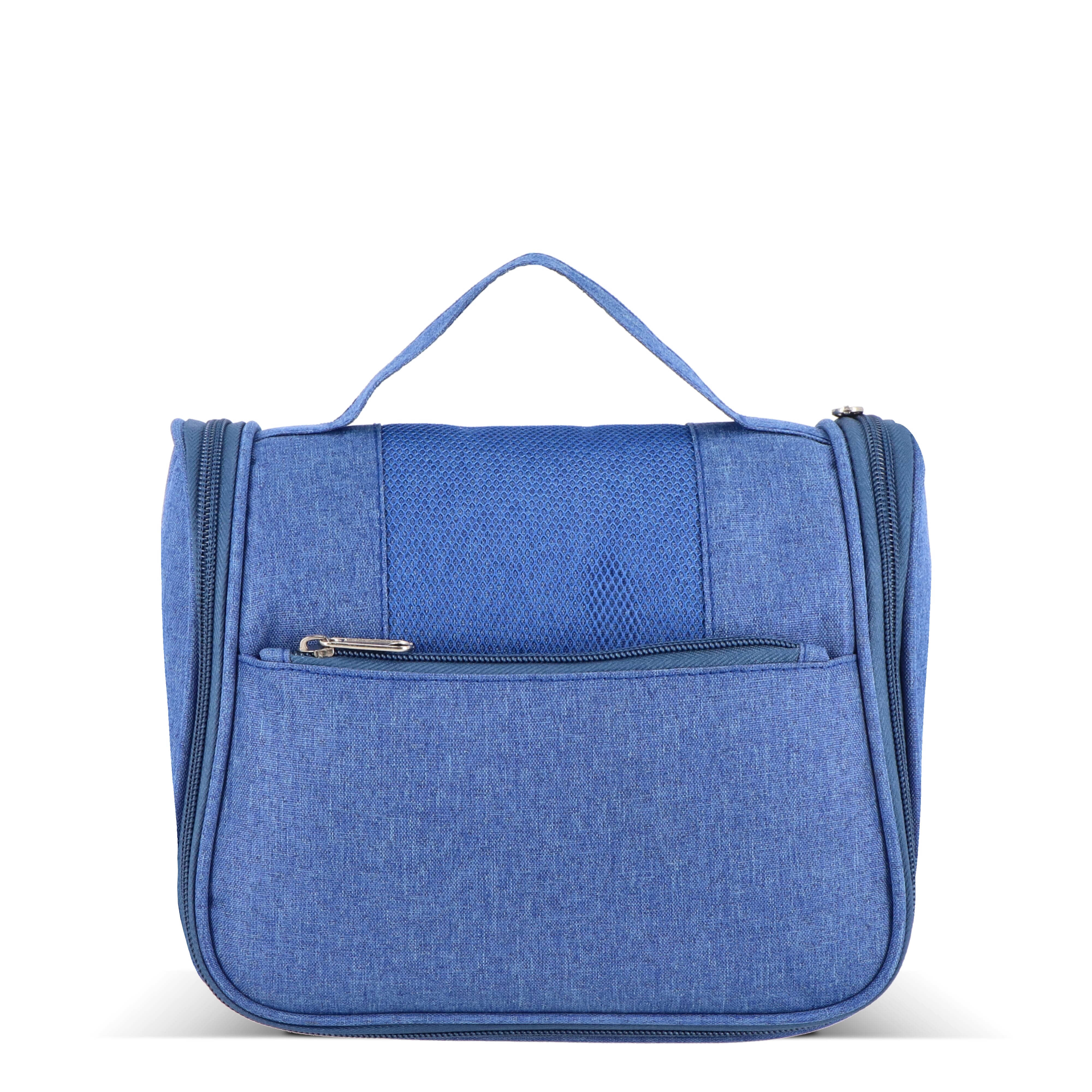 Kulturbeutel aus 300D rPET mit Fronttasche mit Reißverschluss und Tragegriff oben. Innen mit Aufhängehaken, zwei Reißverschlussfächern (eines davon aus Netzgewebe), vier offenen Netztaschen für Flaschen in Reisegröße und einem großen Hauptfach für andere Kosmetikartikel. Ideal für organisiertes Reisen.